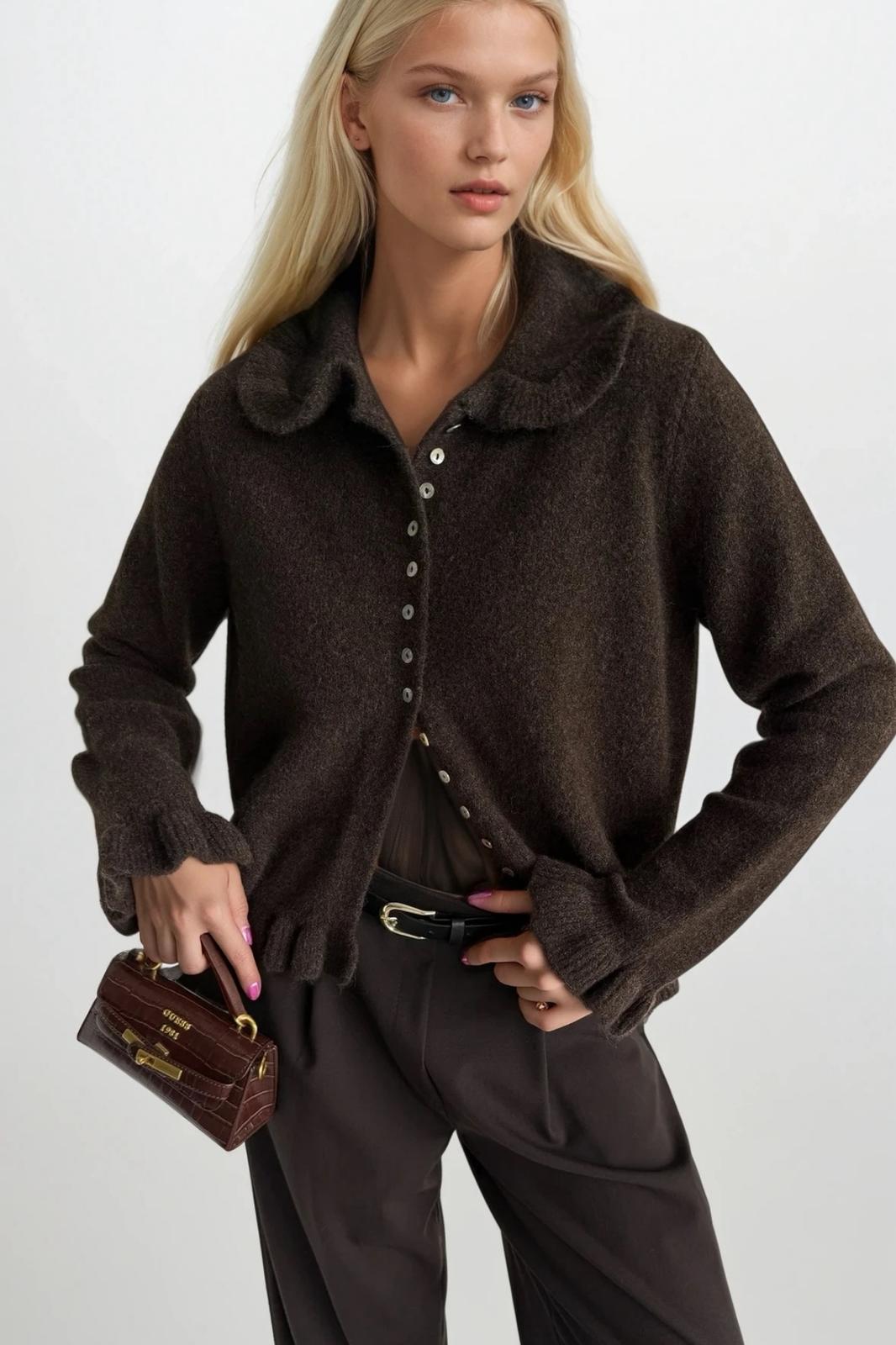 Etek ve Yaka Fırfırlı Triko Kahverengi Hırka