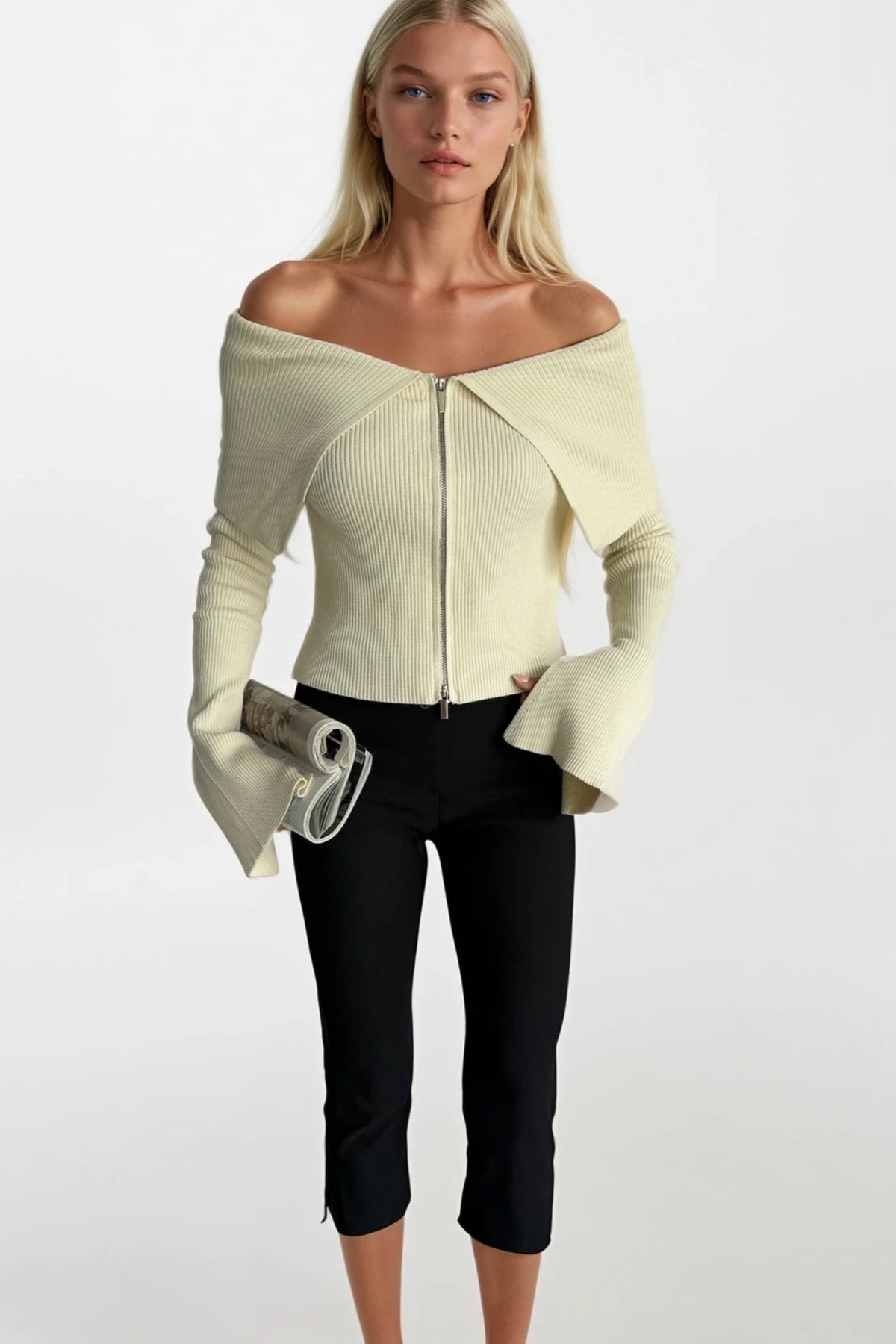 Madonna Yaka Ekru Fermuarlı Triko Bluz