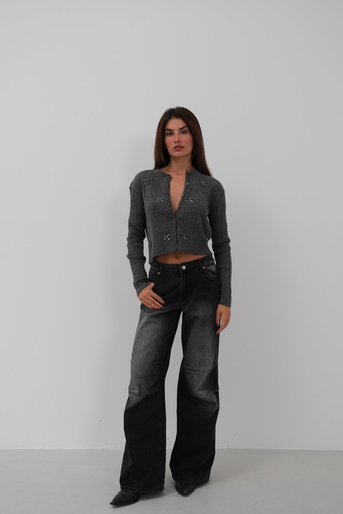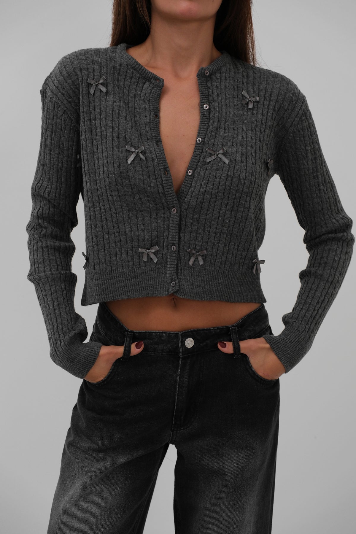 Knit Detail, Zero Collar, Front Button Detail, Bow Detail, Long Sleeve, Soft Texture, Ribbed Knitwear Sweater, Cardigan
