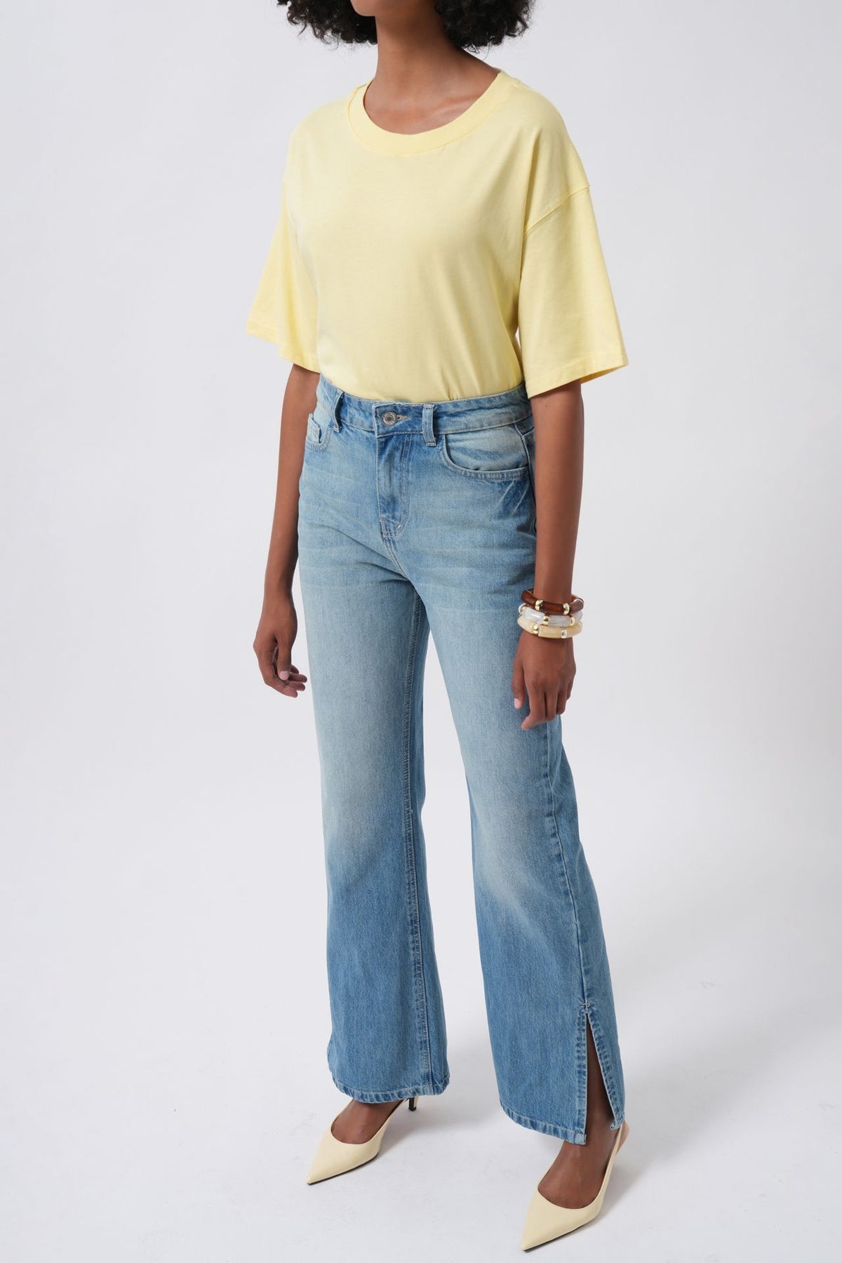 Five Pocket, Button and Zipper, Wide Leg Denim Trousers with Side Slit Detail