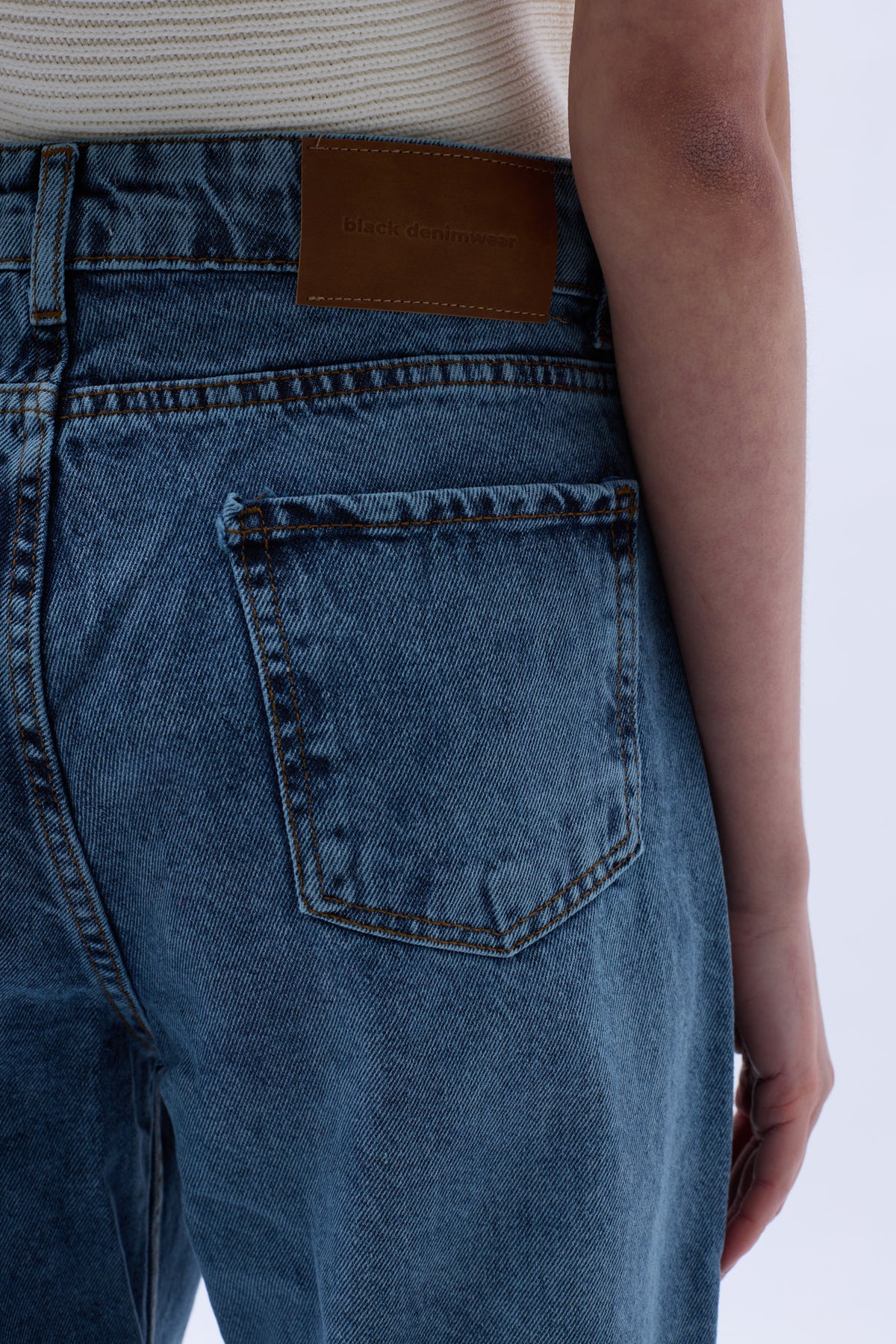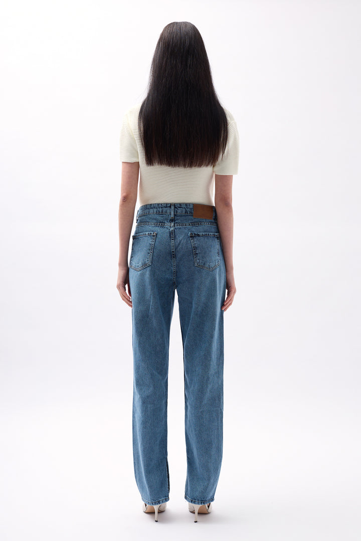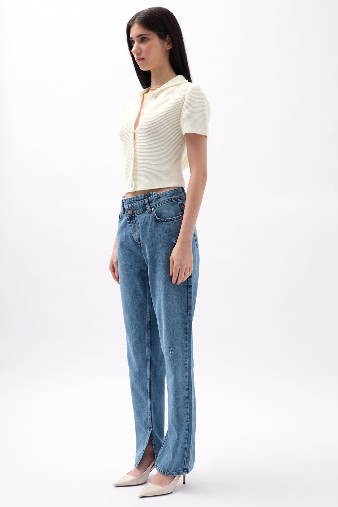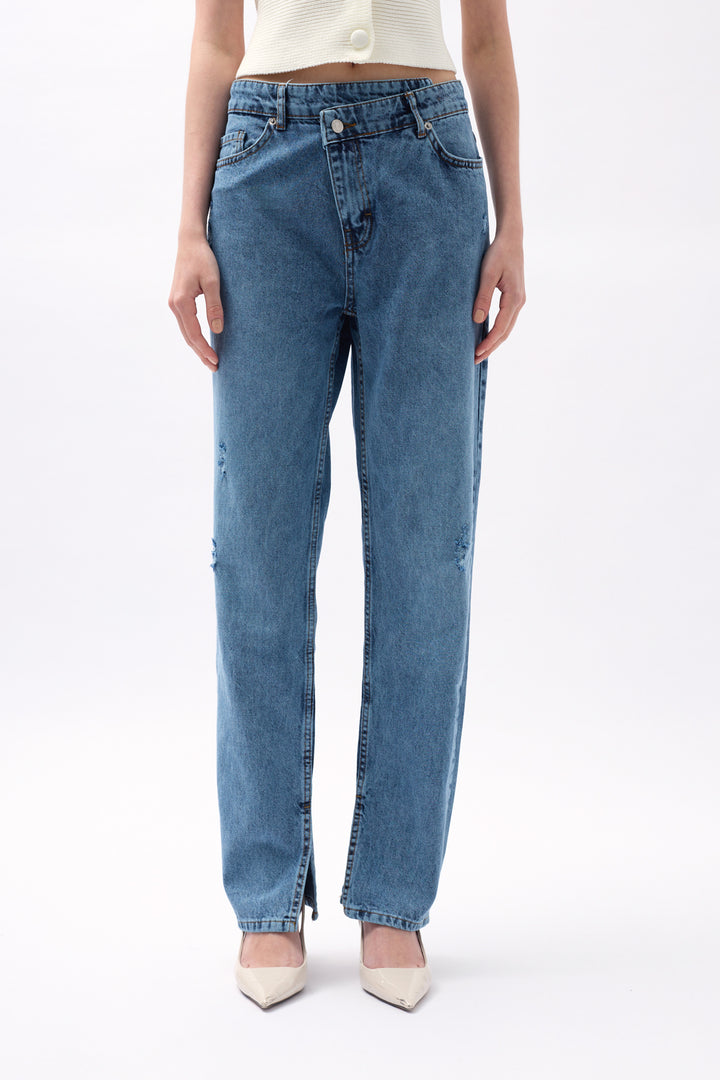 Asymmetrical Waist, Five Pockets, Button and Zipper, Slit Detailed Straight Jeans