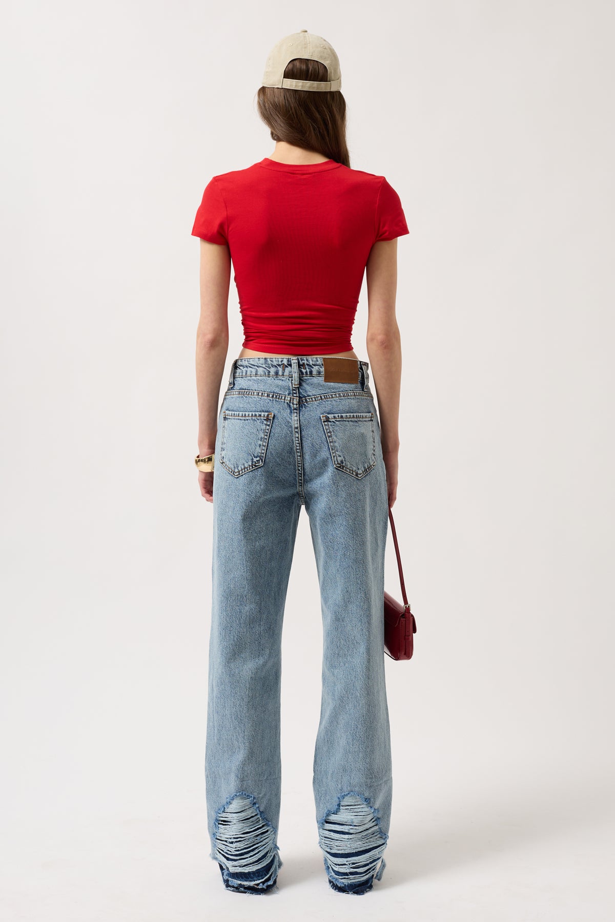 Five Pocket, High Waist, Button and Zipper, Ripped Leg, Denim Fabric Jeans