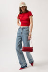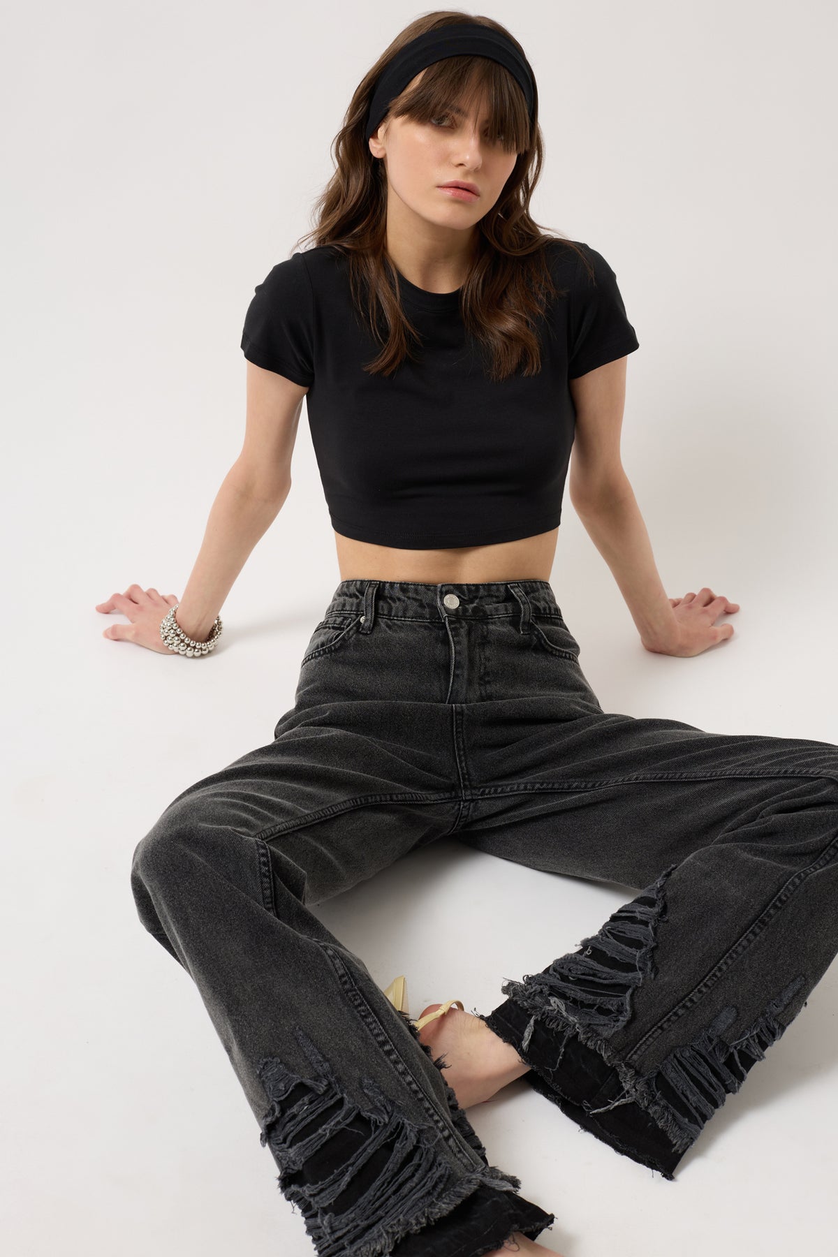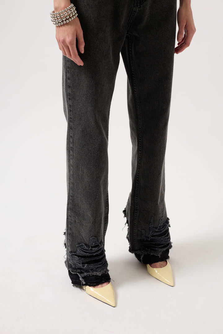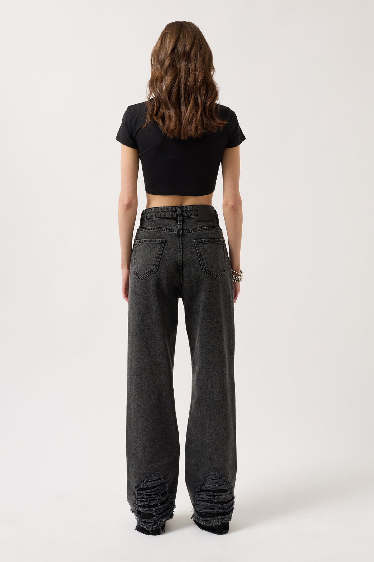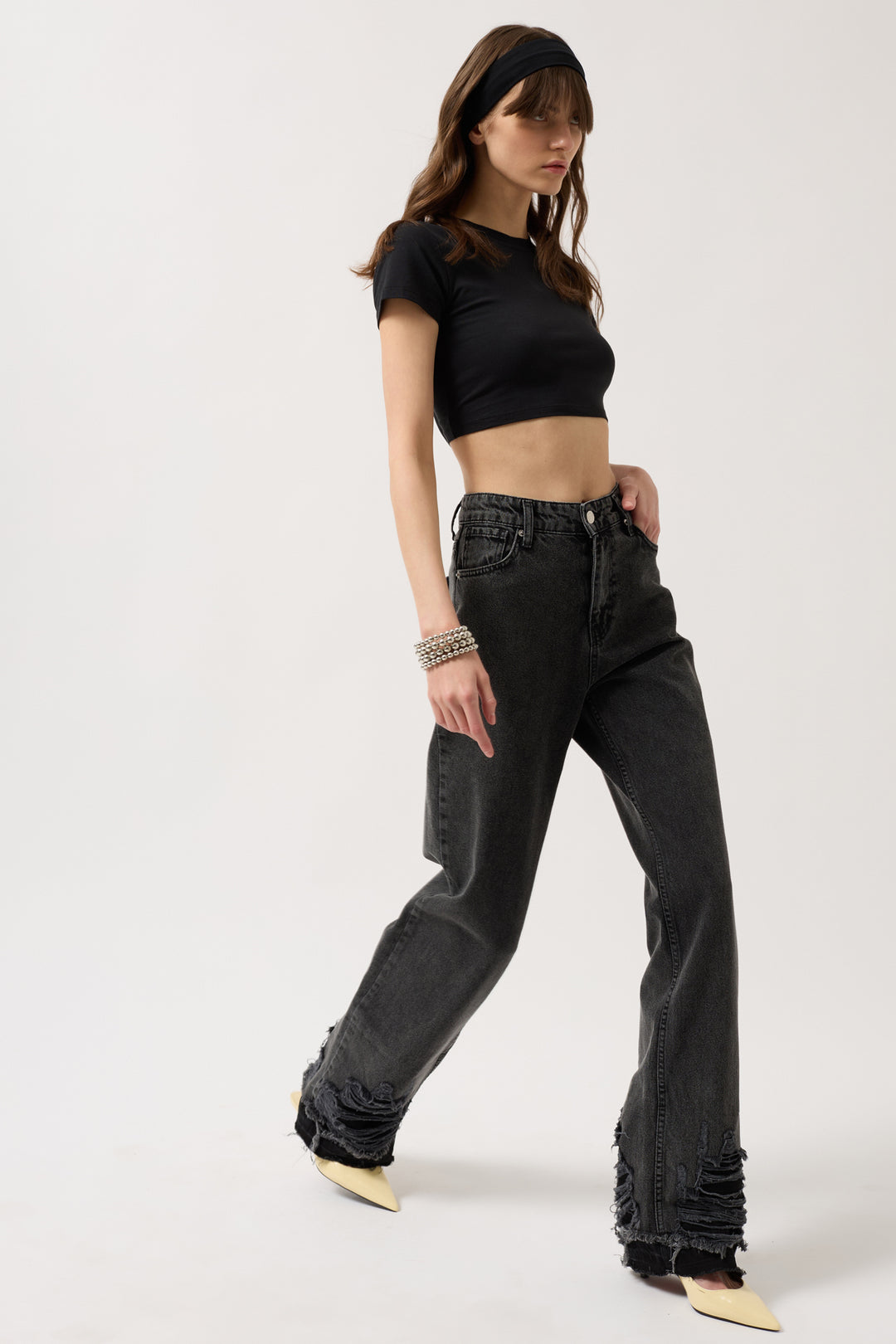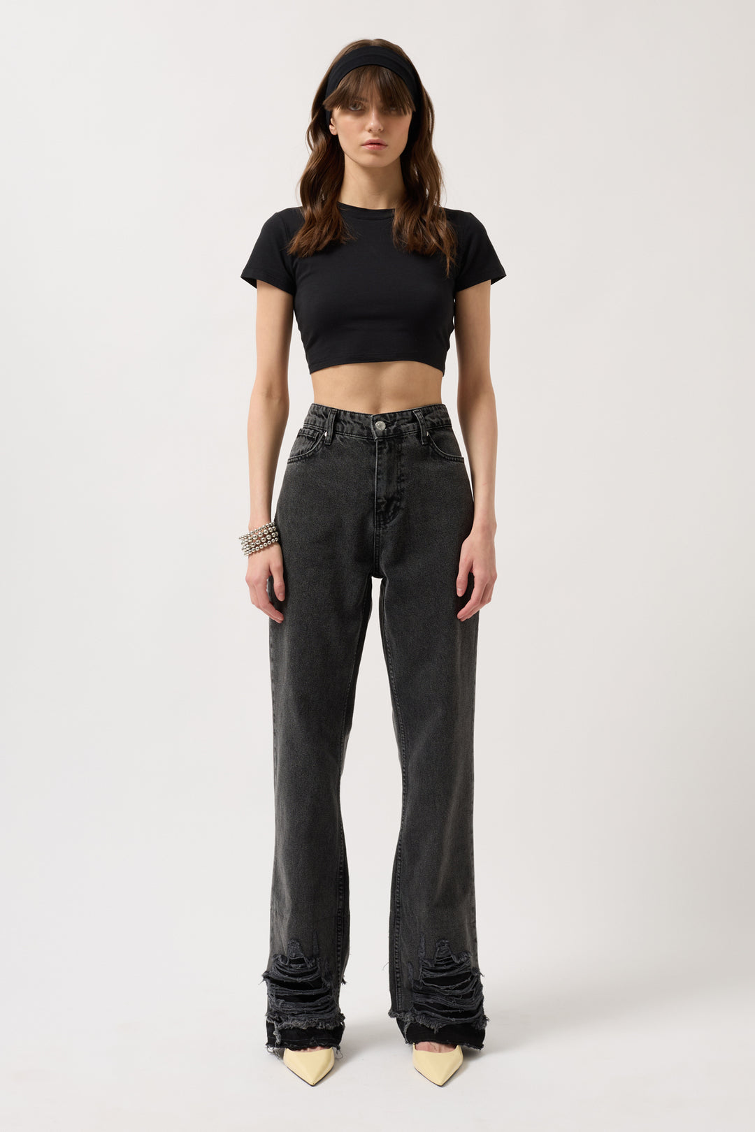 Five Pocket, High Waist, Button and Zipper, Ripped Leg, Denim Fabric Jeans