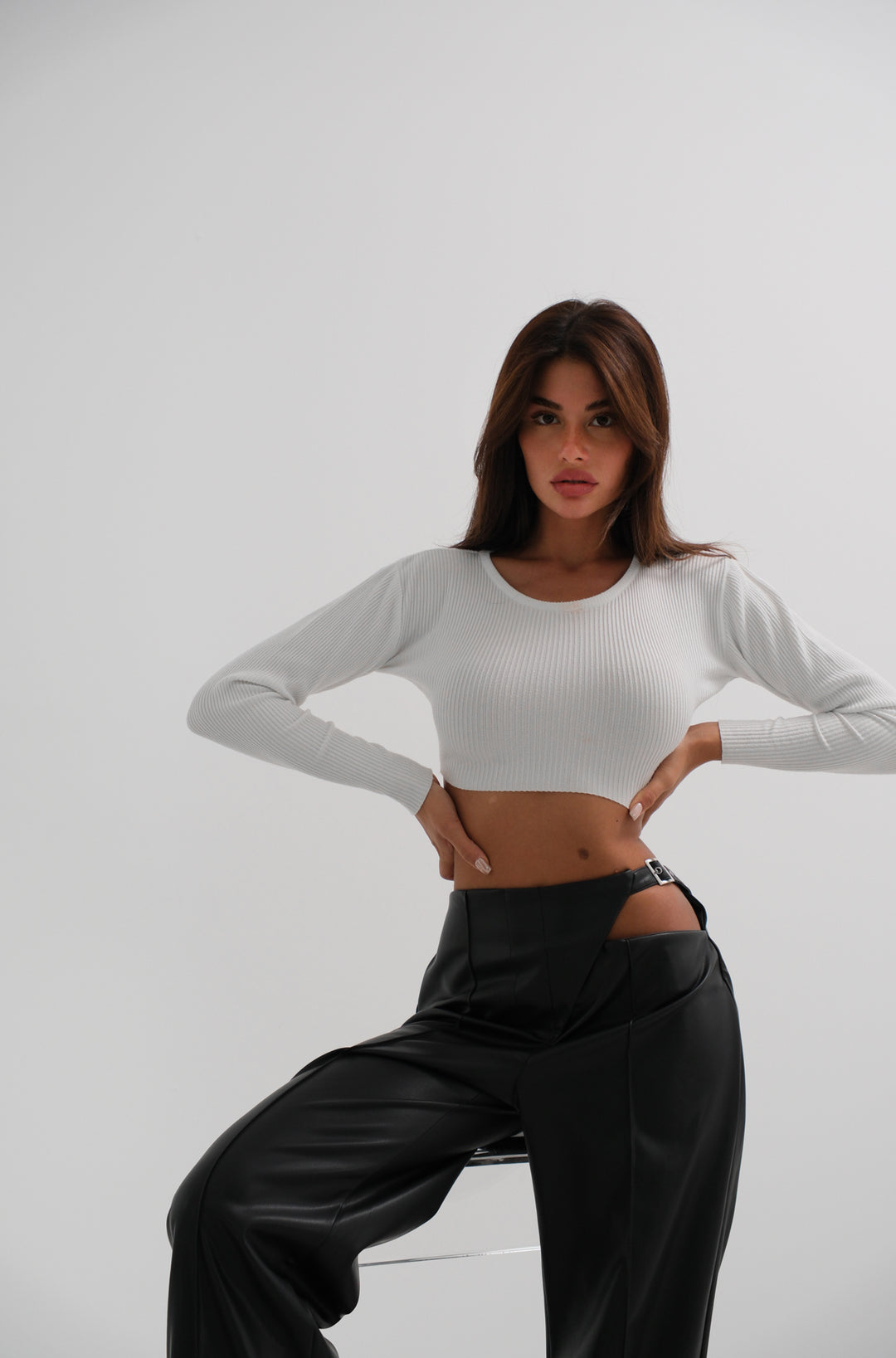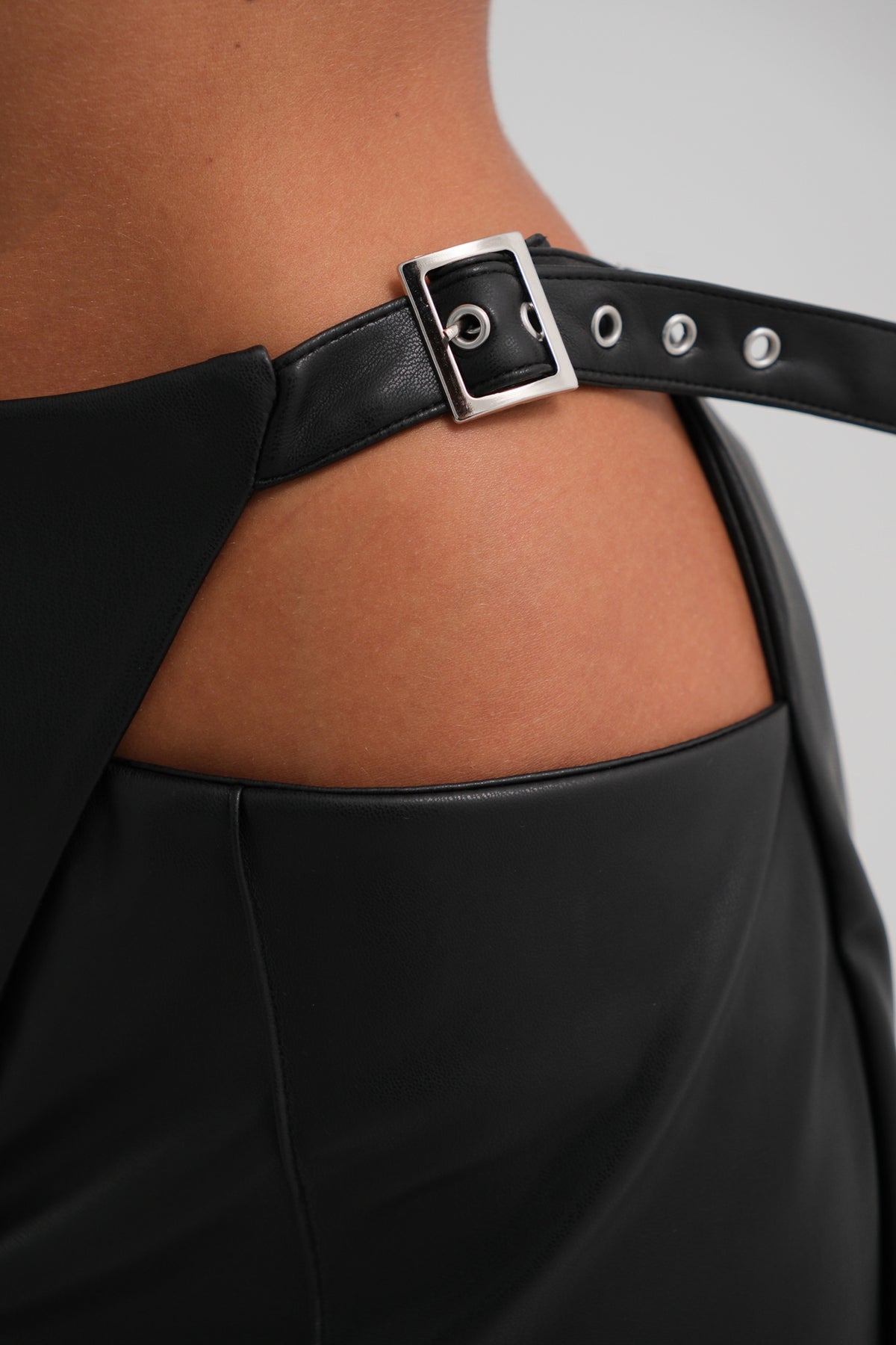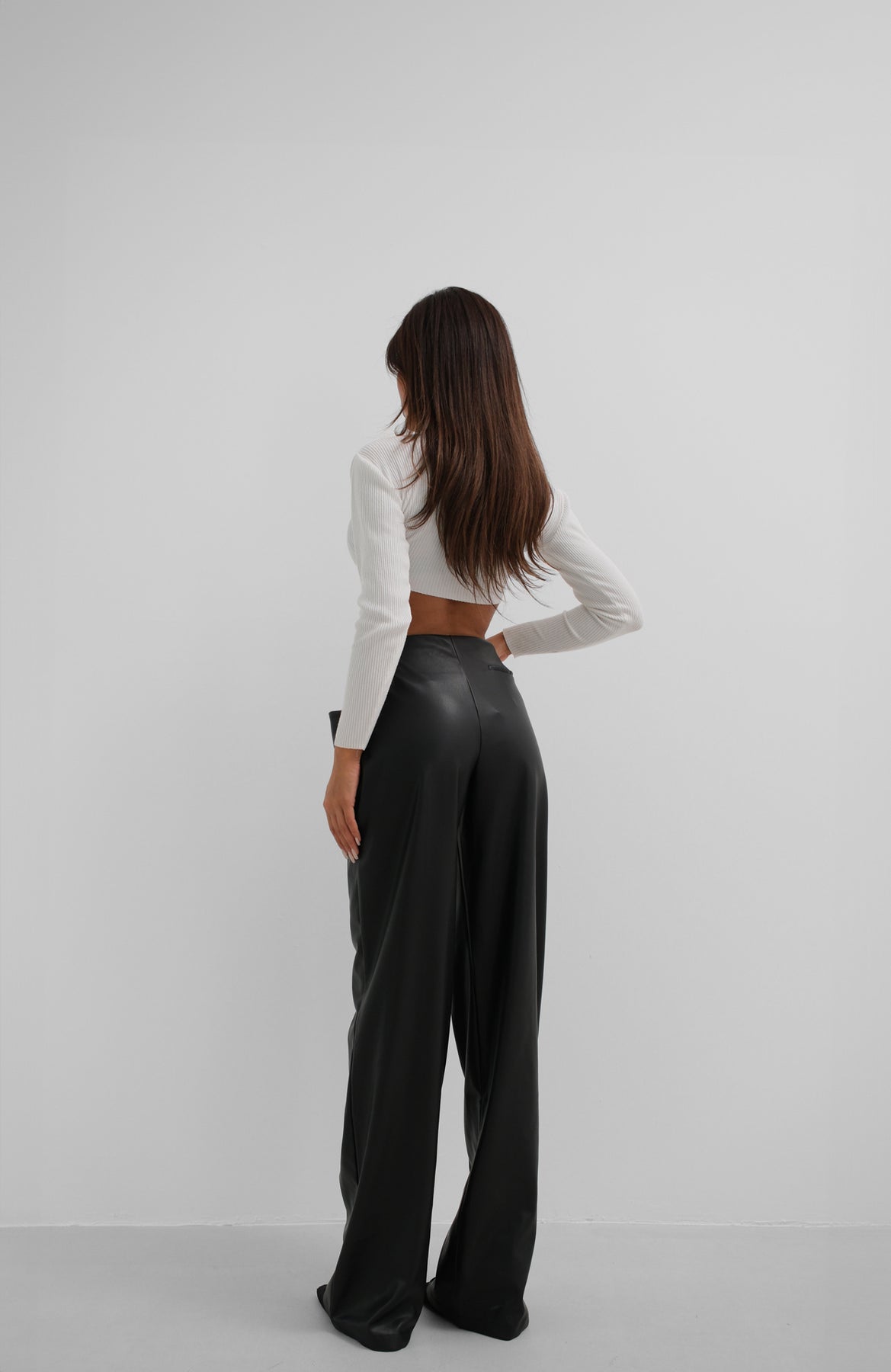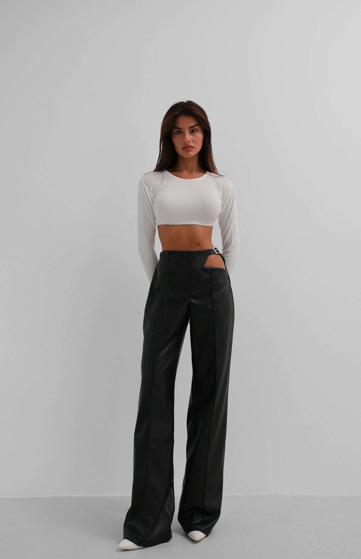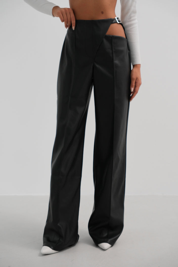 Window Detailed, Belted, High Waist, Wide Leg, Leather Trousers