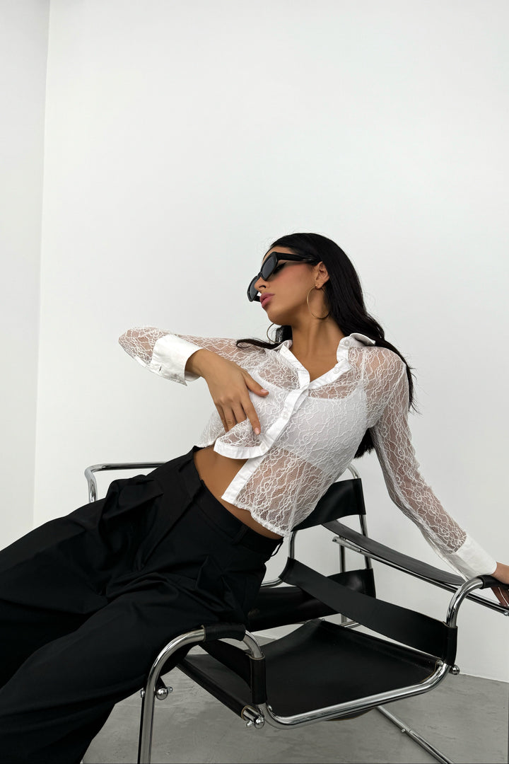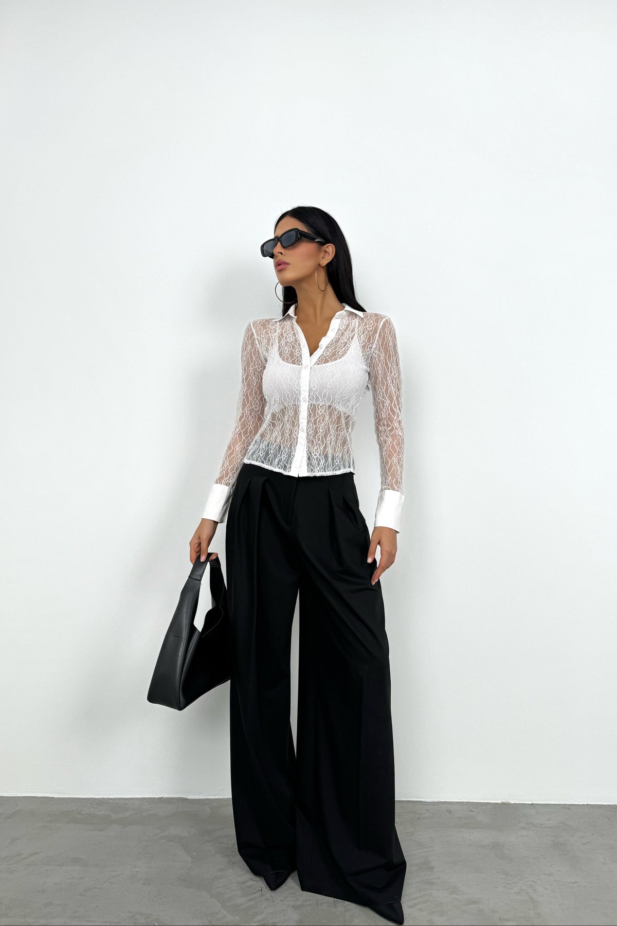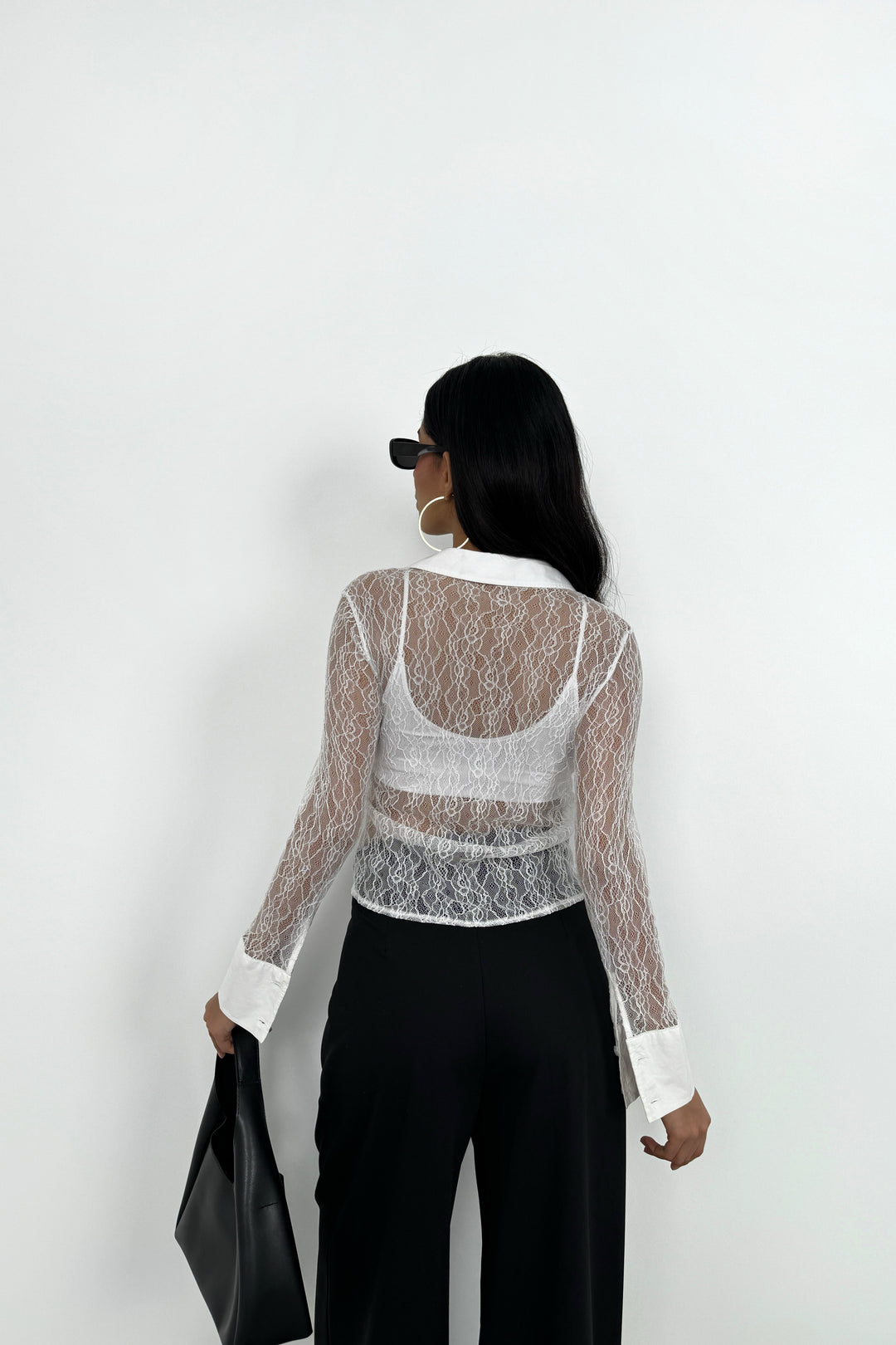 Polo Collar, Cuff Detail, Transparent, Lace Blouse
