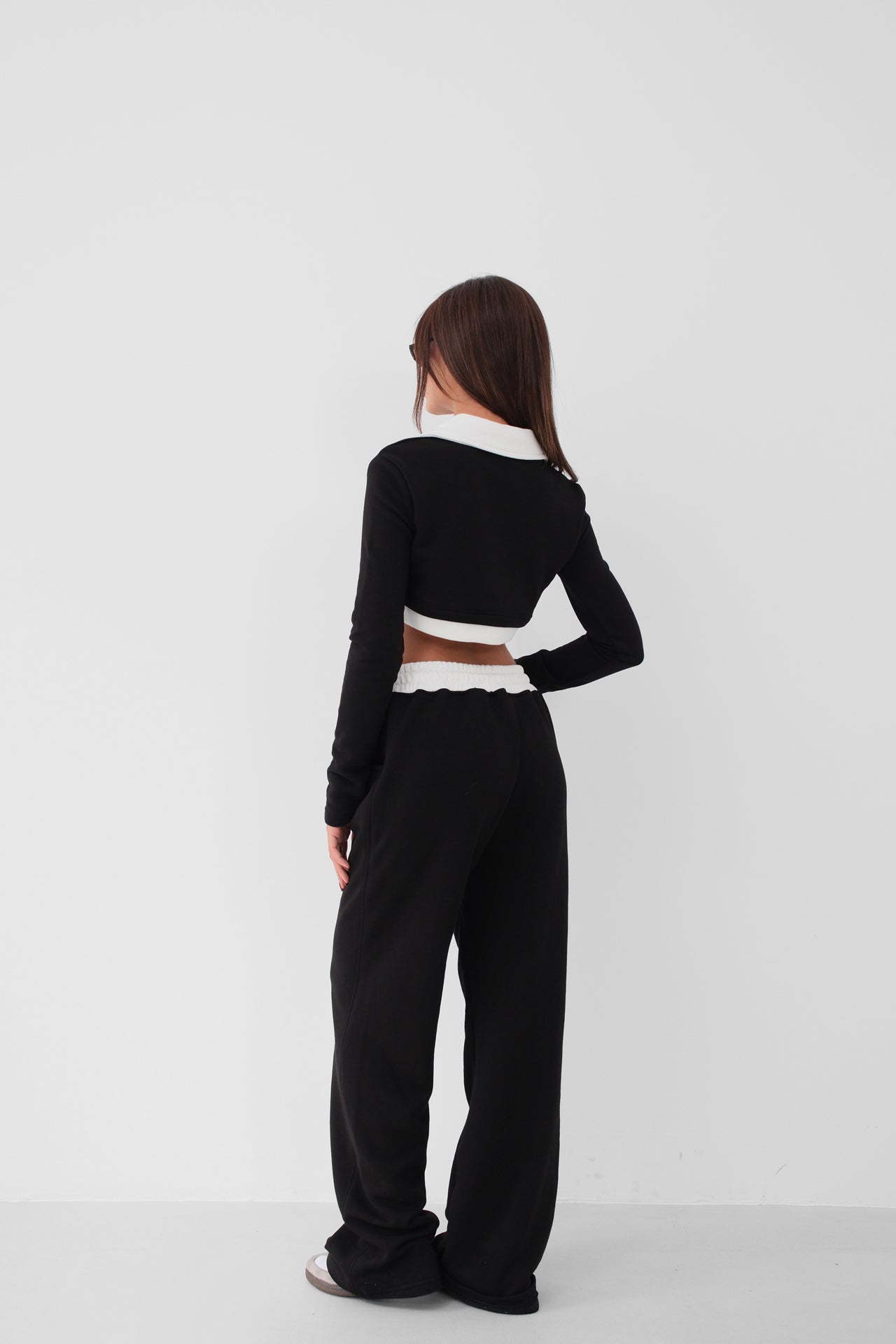 Polo Collar, Two-Tone, Contrast Color, Garnished Crop Sweatshirt