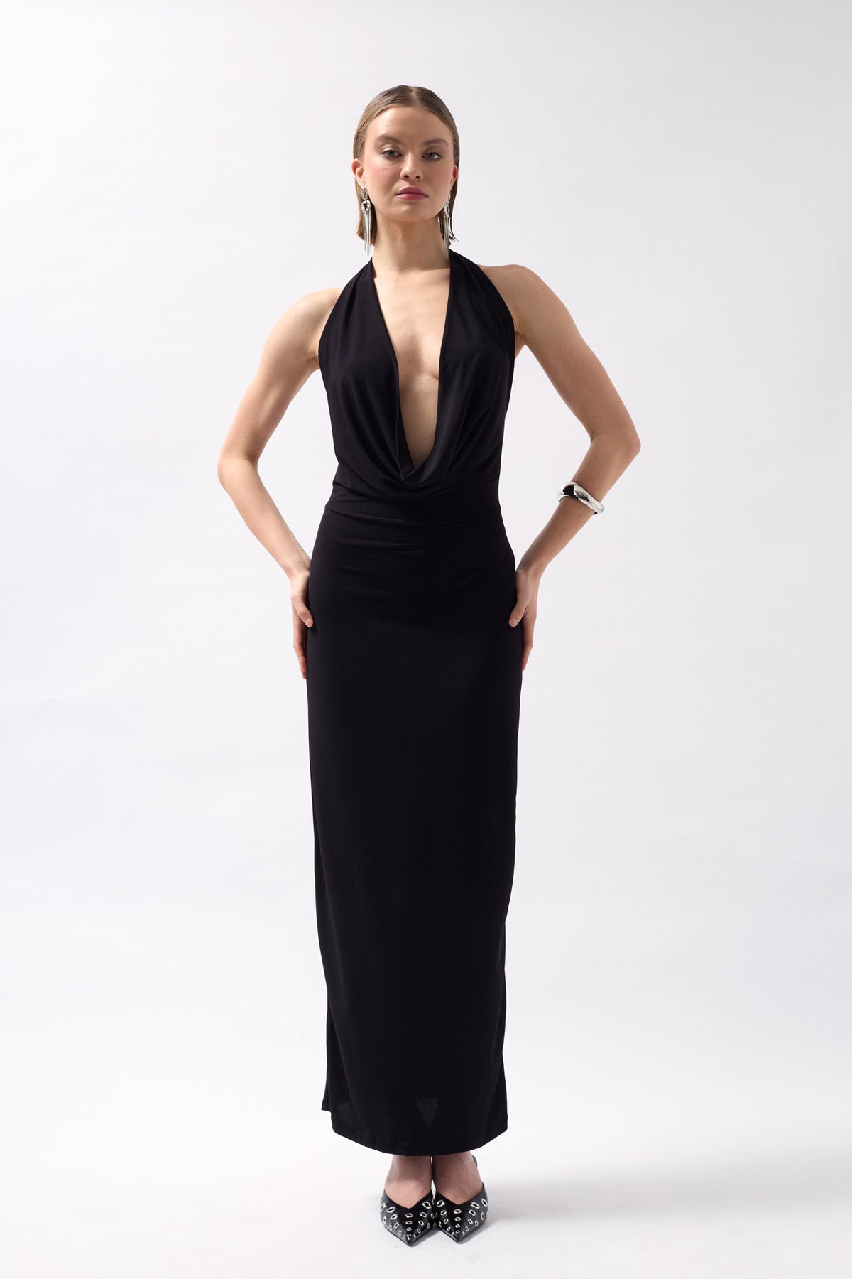 Shawl Collar Low Cut Black Dress