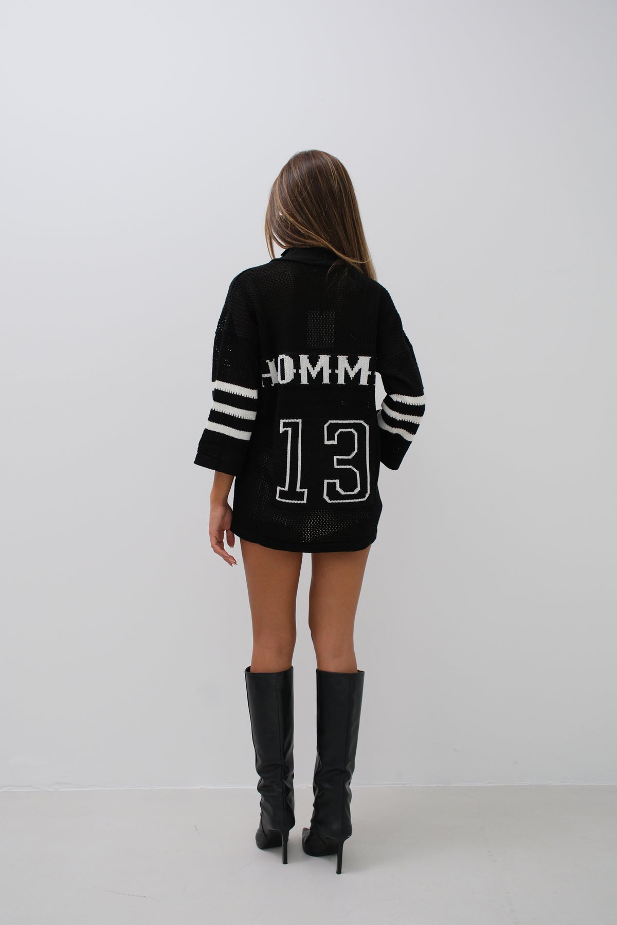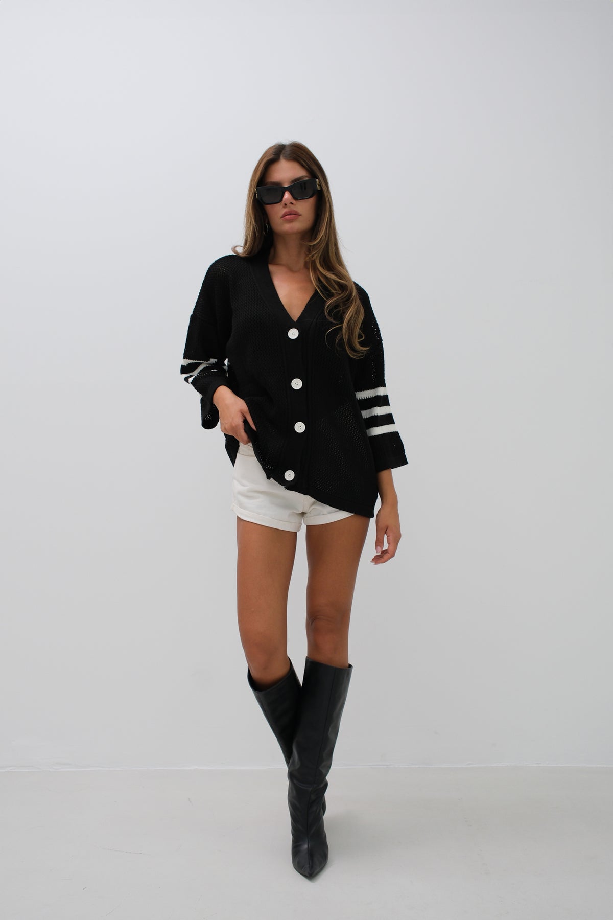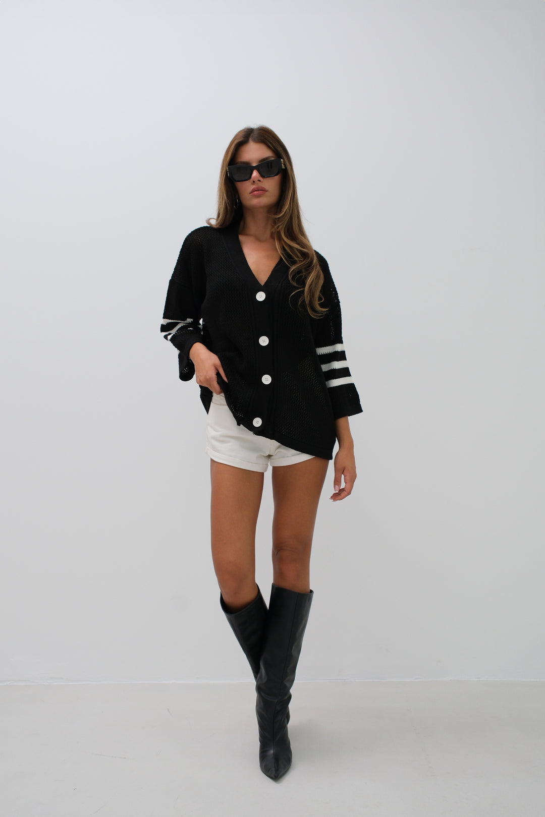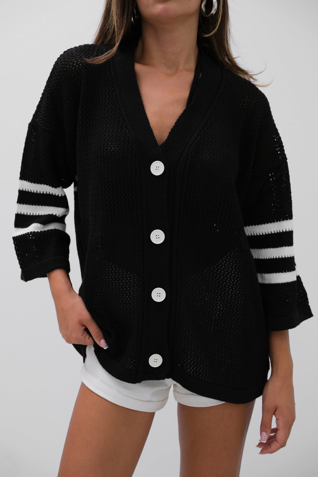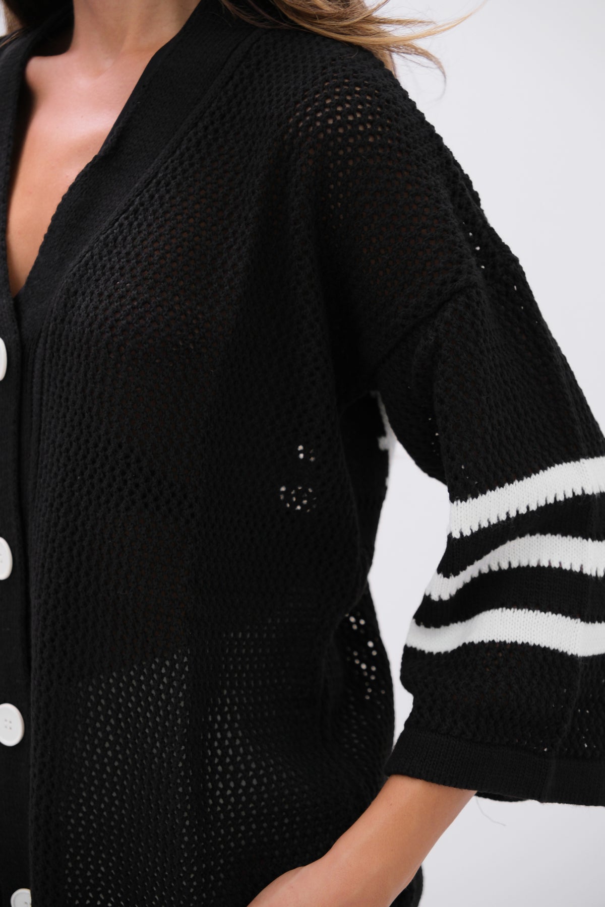 Cardigan with Back Print, Two-Tone, Openwork, Low Shoulder, Stripe Detail on the Sleeve