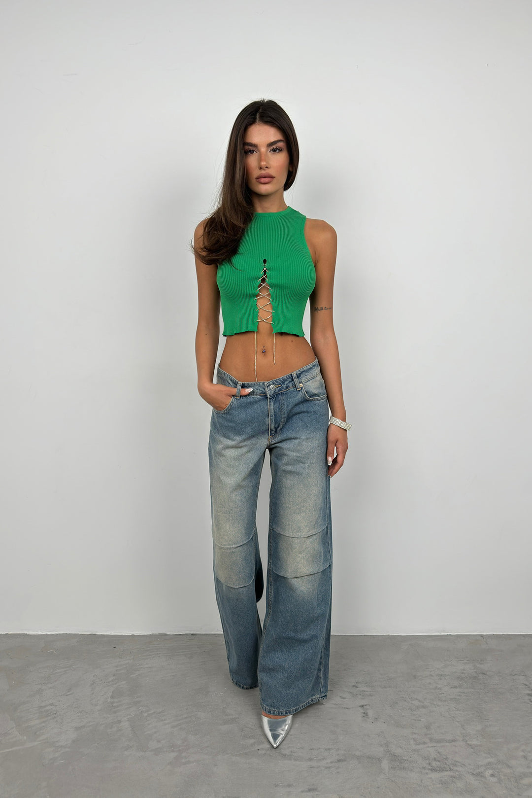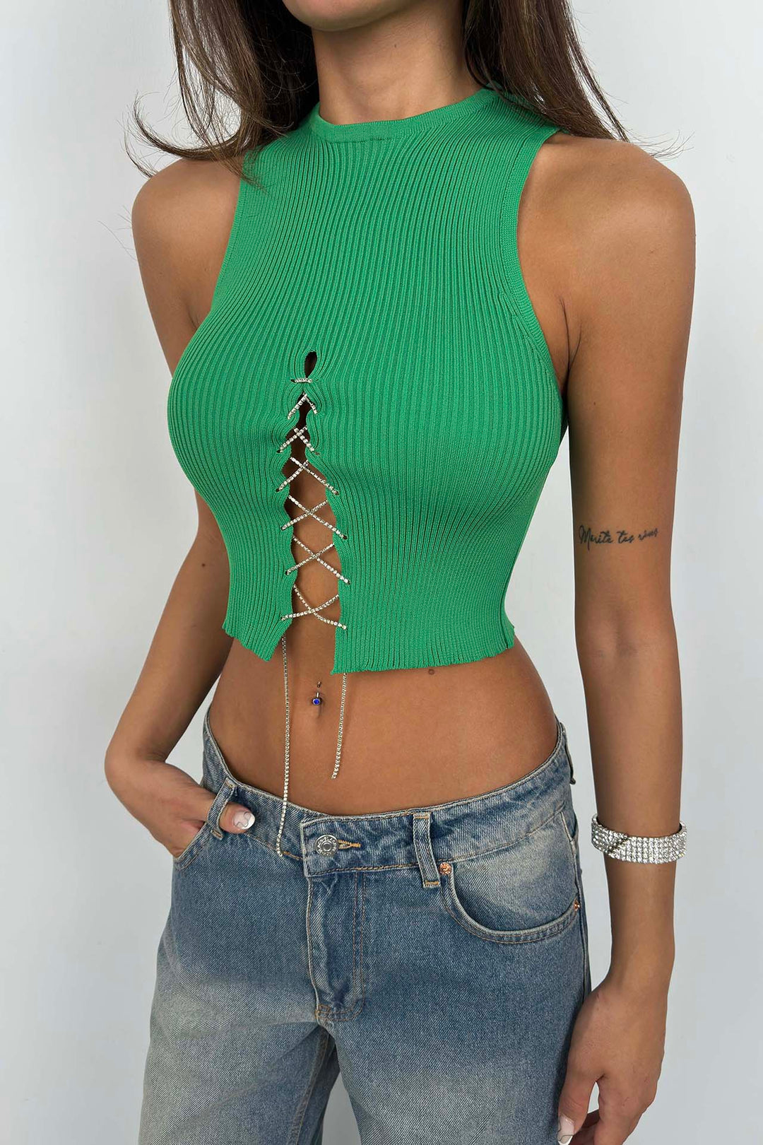 Stone Chain Detailed, Low-Cut Crop, Knitted Blouse, Sleeveless, Crew Neck Blouse, Front Slit