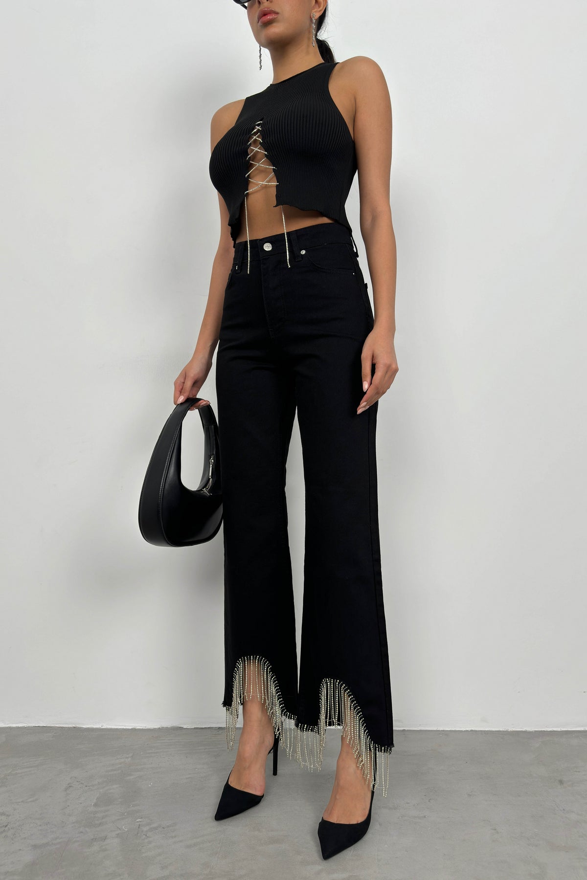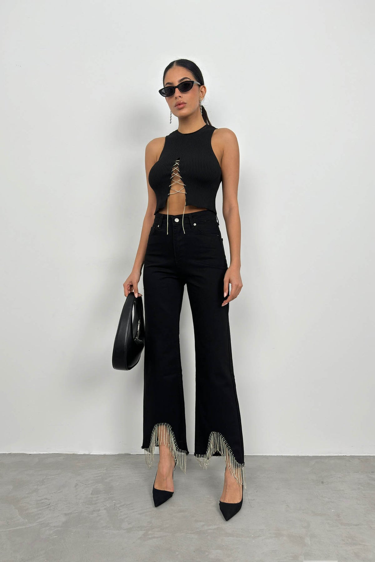 Stone Tassel Detail, High Waist, Wide Leg Jeans, Four Pockets, High Waist Jeans, Flare Jeans, Zipper Front, Belted, Metal Buttons