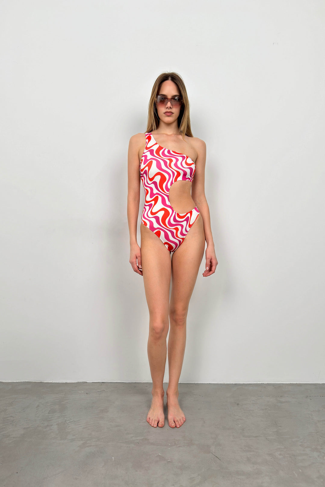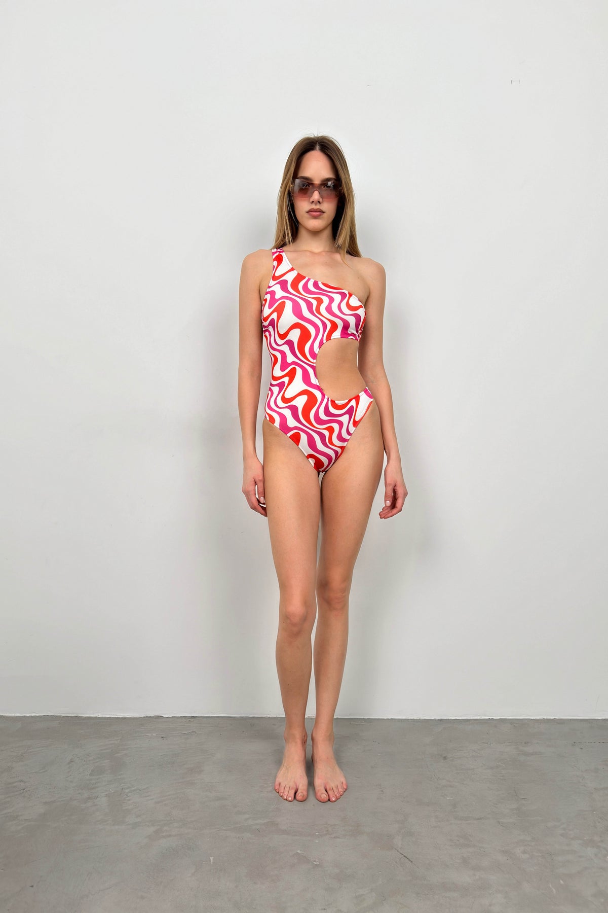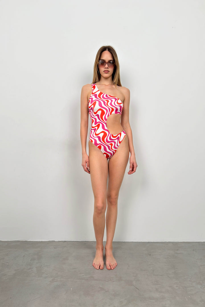 One Shoulder Patterned Pink Swimsuit