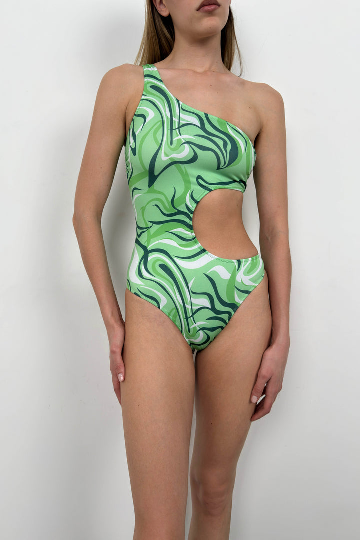 One Shoulder Patterned Green Swimsuit