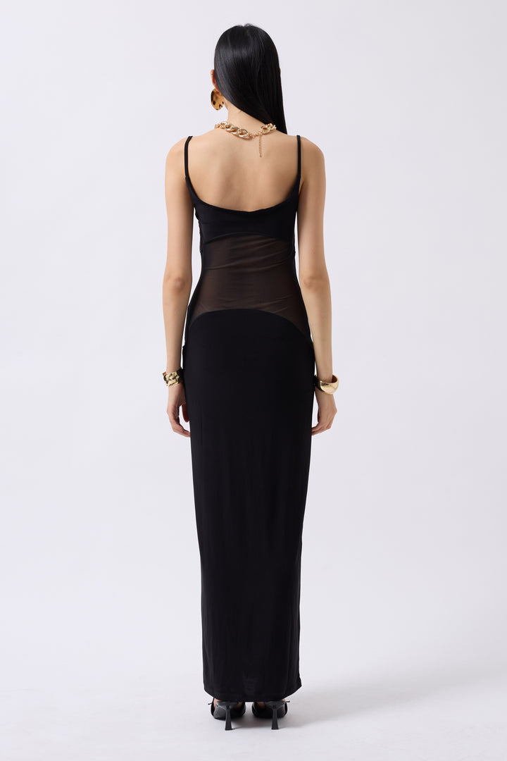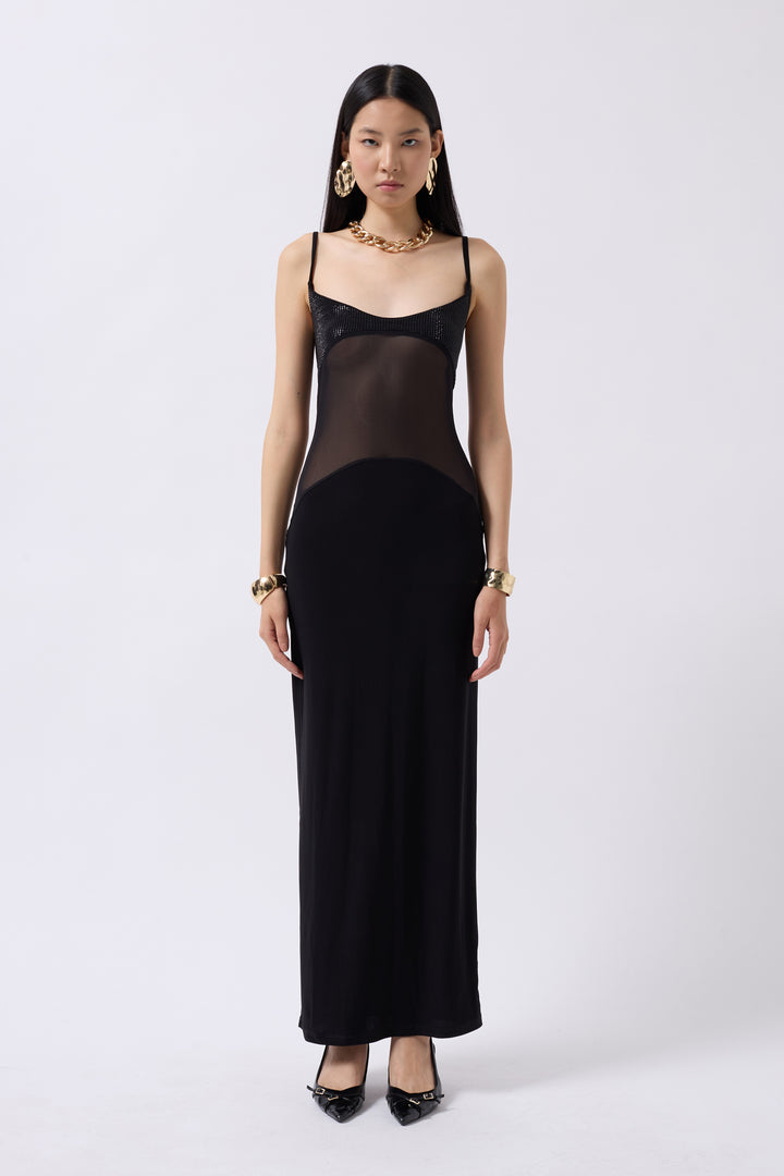 Tulle Garnished Sequined Black Maxi Dress