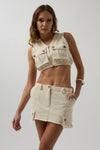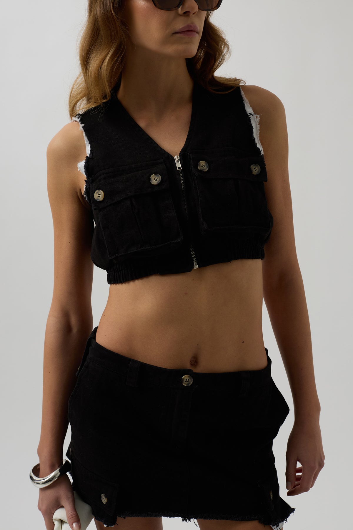 Crop Vest with Cargo Pocket, Buttons, Zipper, Lining Detail, Thick Straps