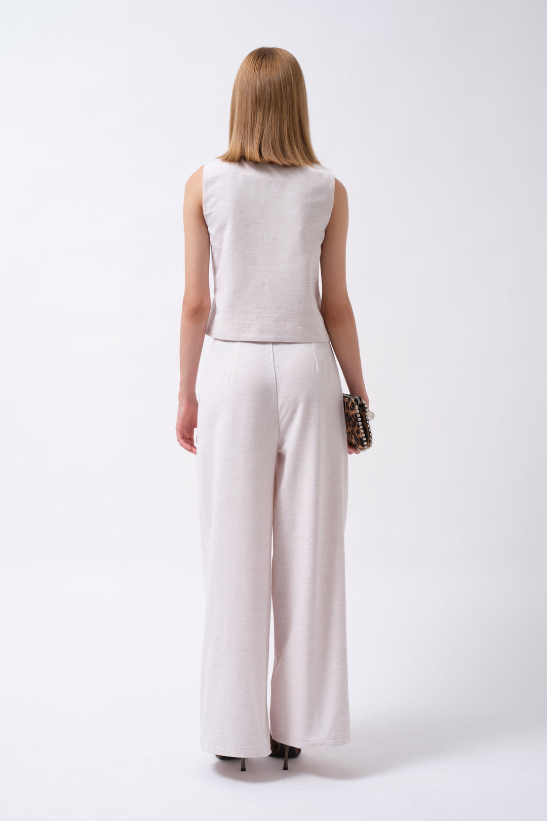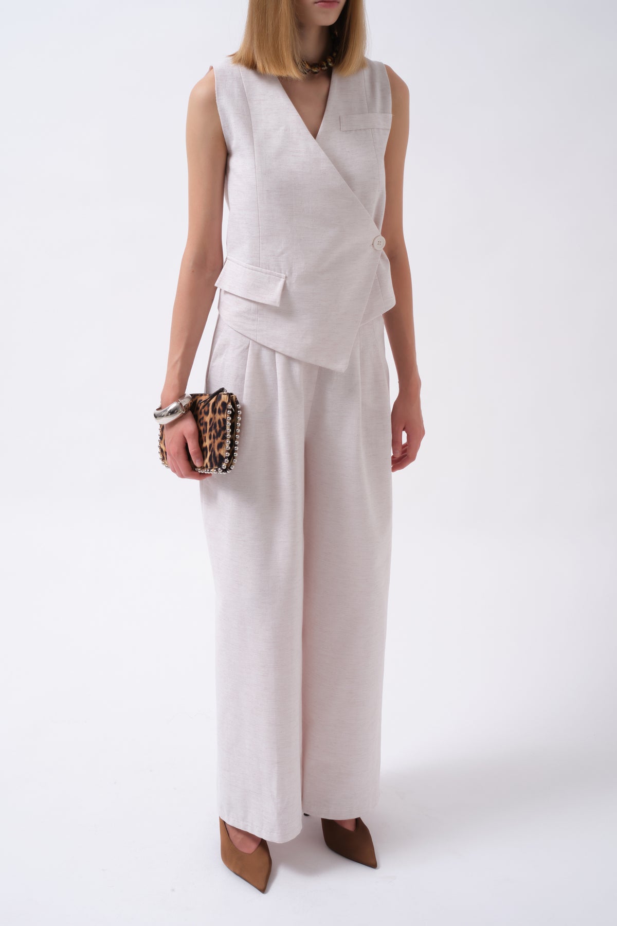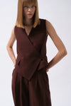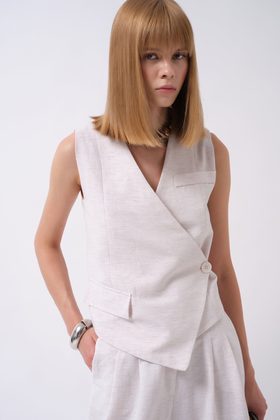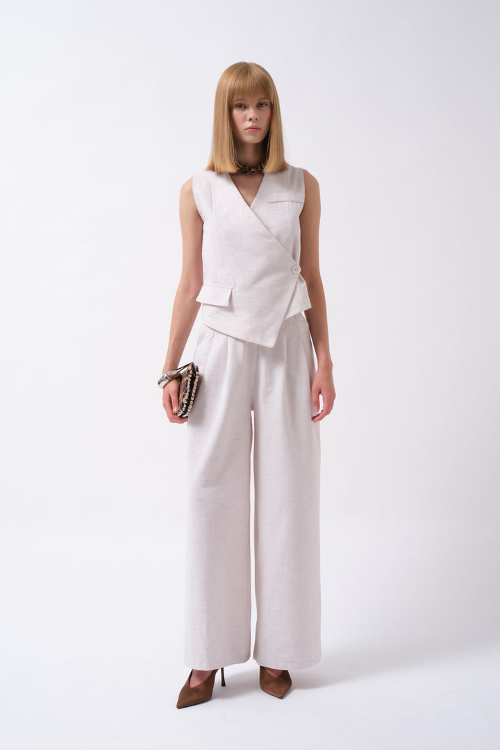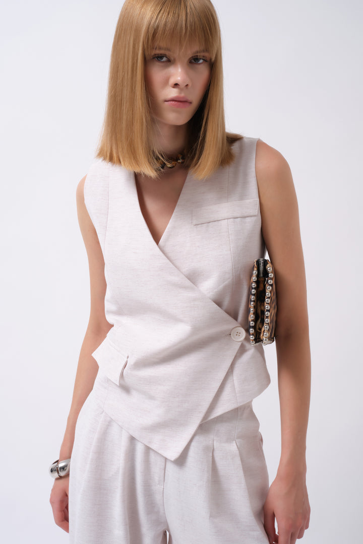 Side Button Asymmetrical Linen Beige Vest