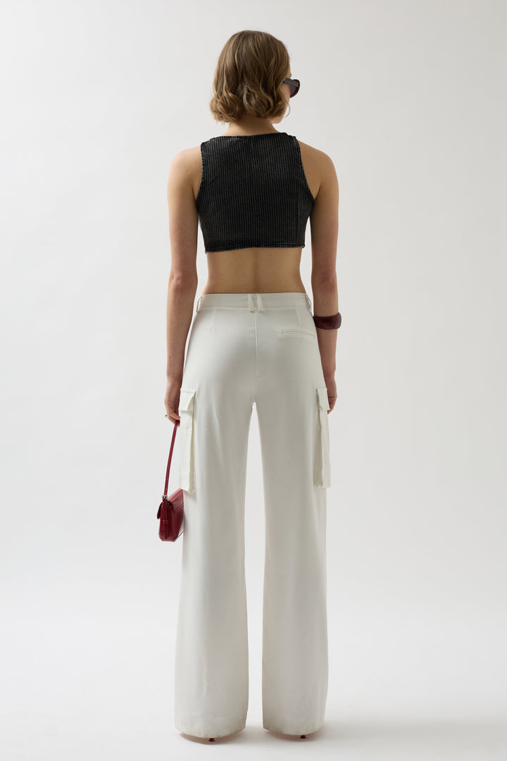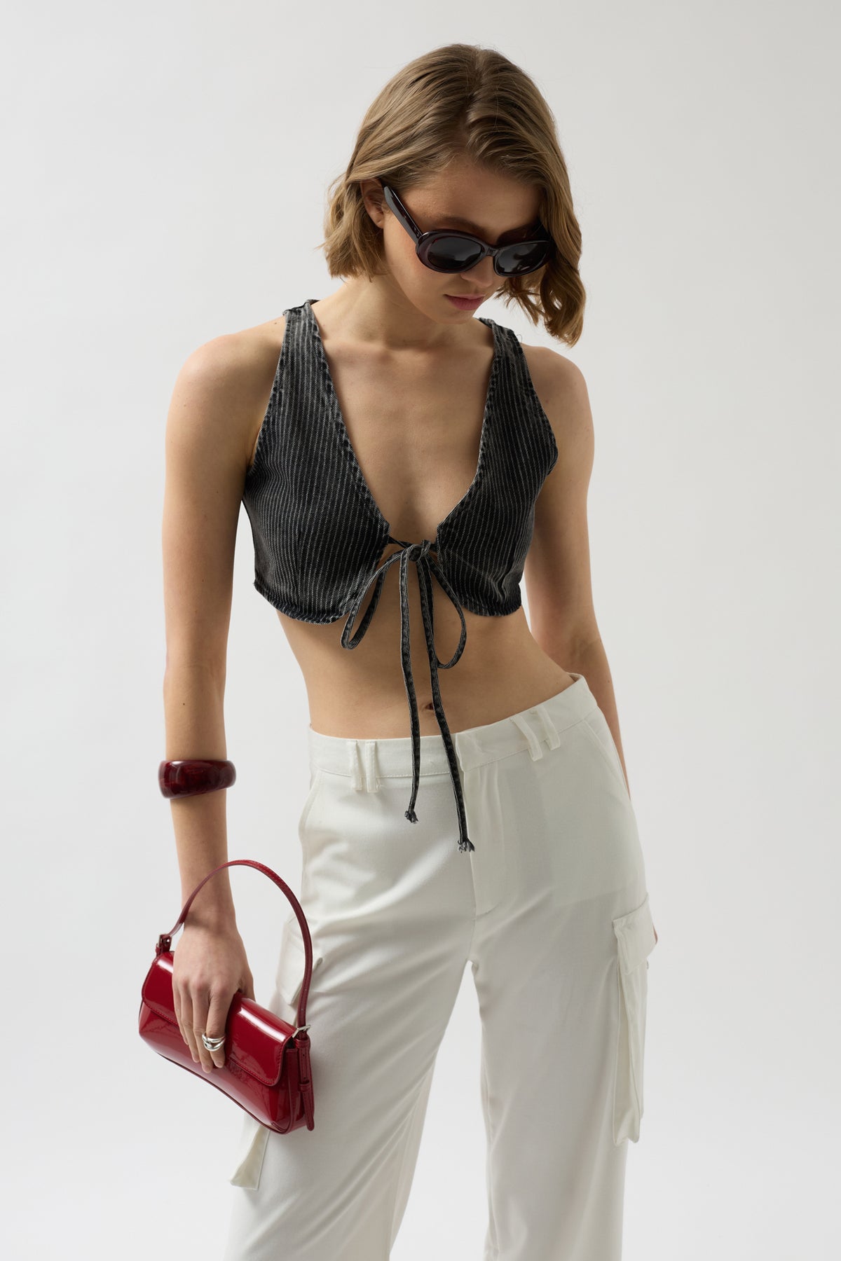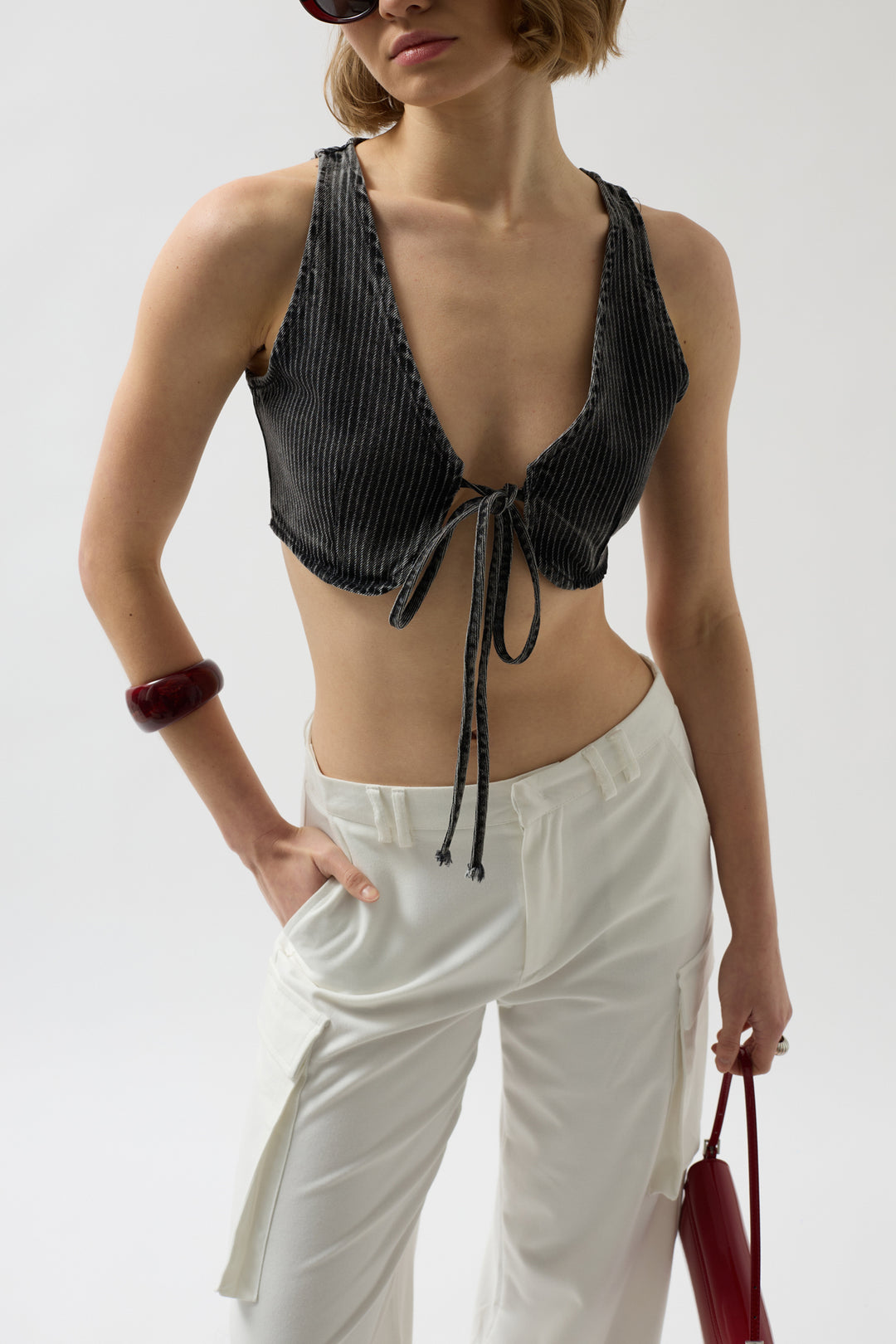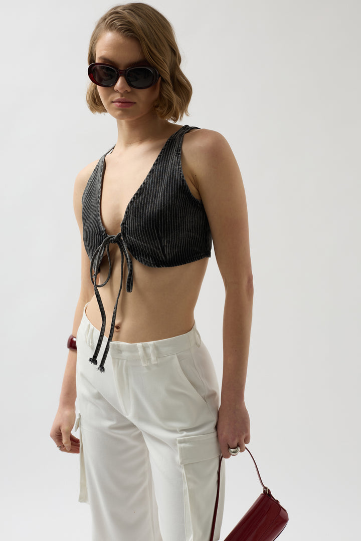 Lace-up, Striped Wash Effect, Cotton Fabric, Crop Vest