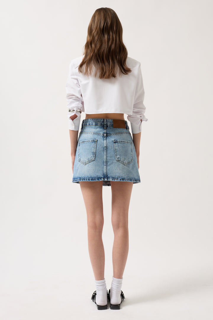 Beş Cepli, Kemeri Asimetrik Kapamalı, Yıkama Efektli, Denim Kumaş, Mini Etek