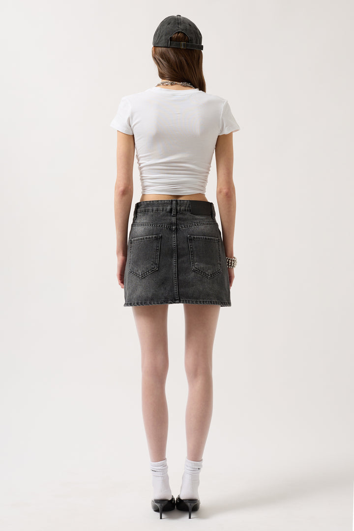Beş Cepli, Kemeri Asimetrik Kapamalı, Yıkama Efektli, Denim Kumaş, Mini Etek