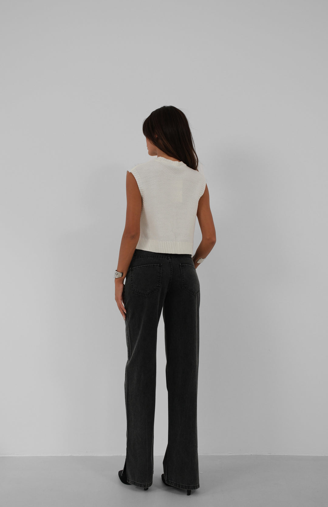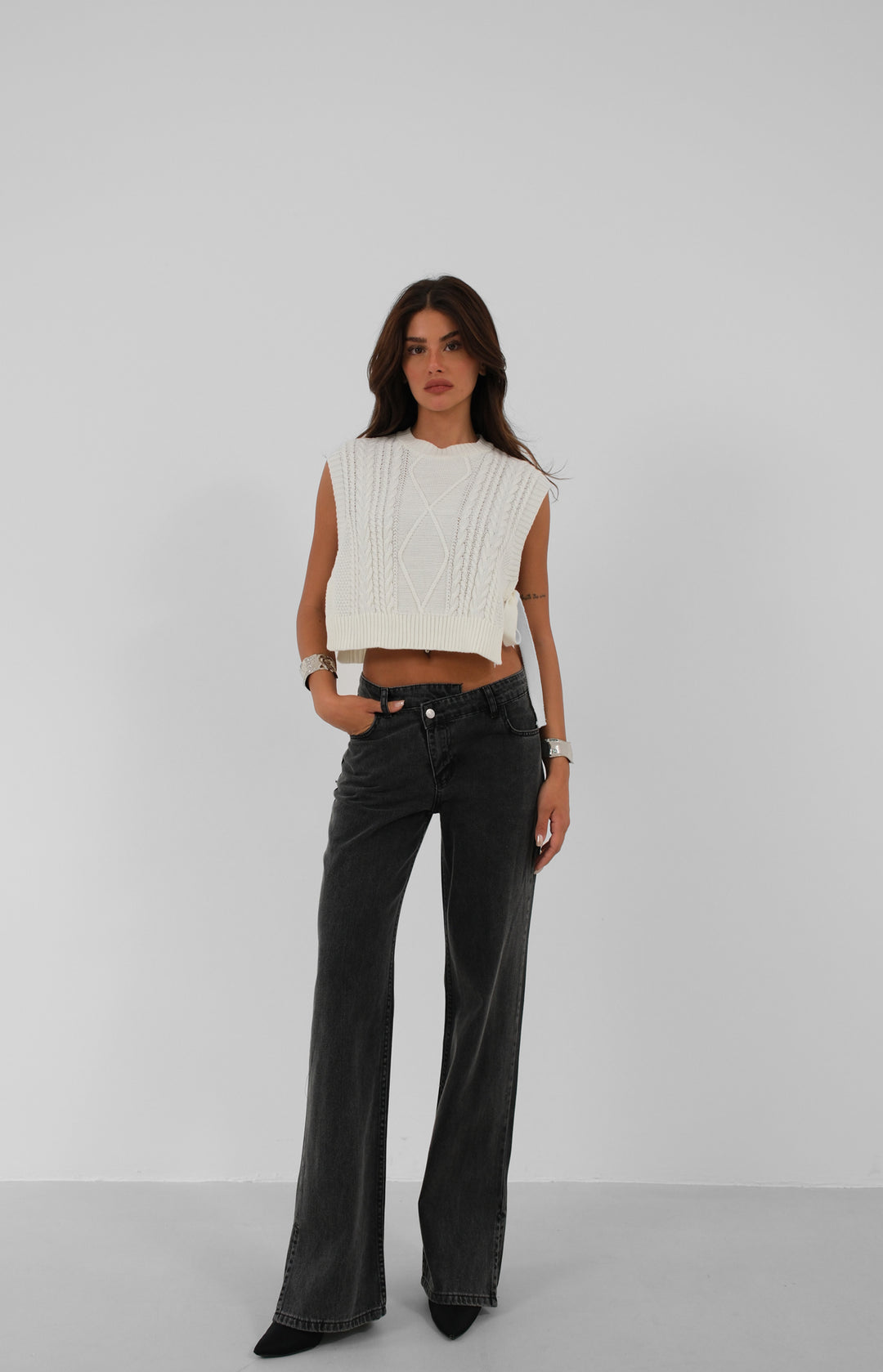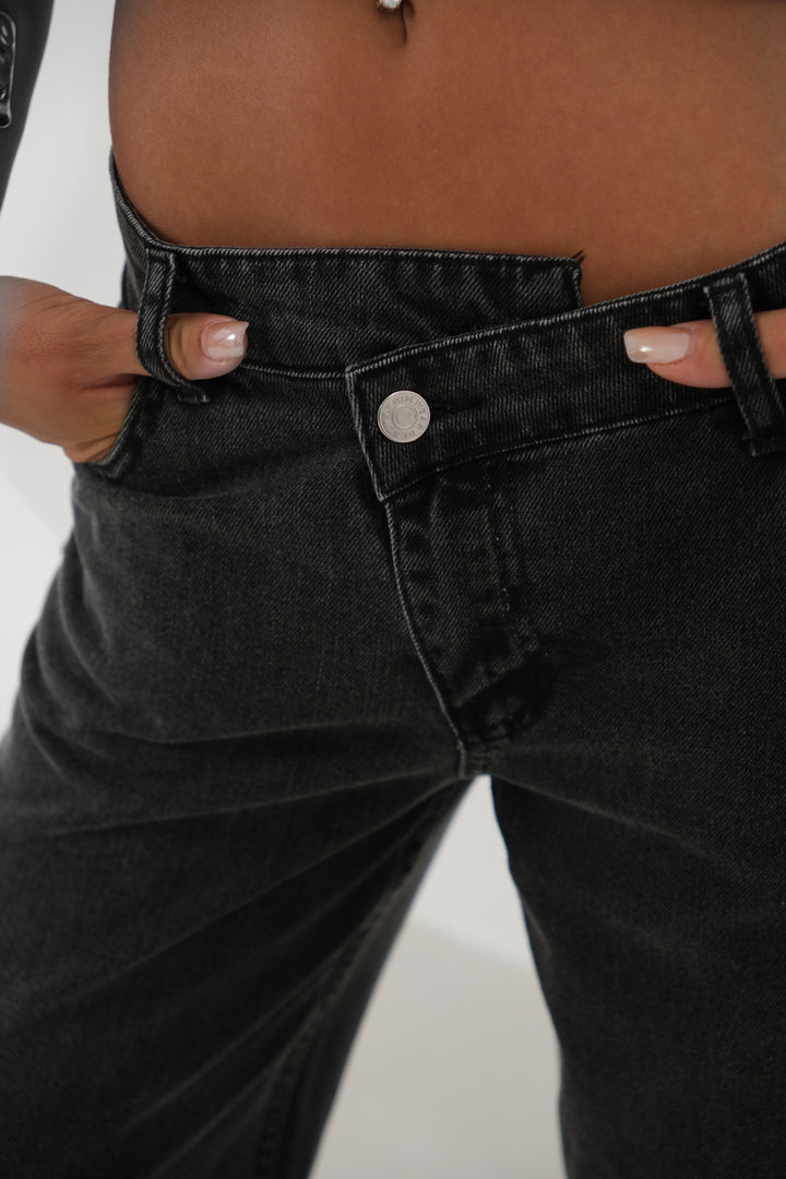 Asimetrik Kemer Paça Yırtmaçlı Siyah Jean