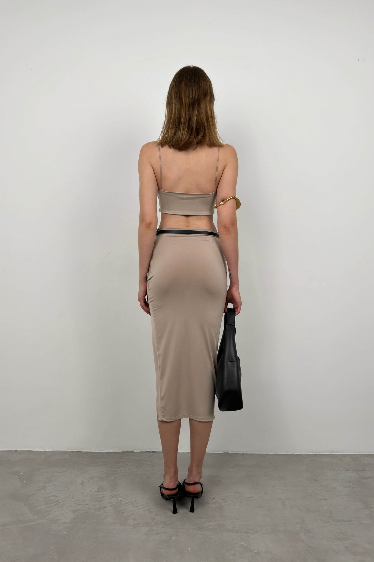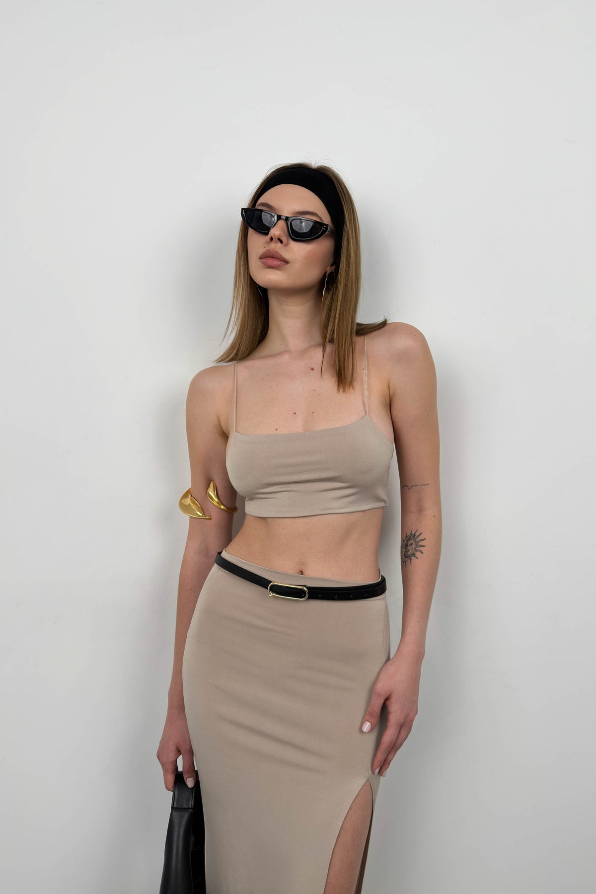 Askılı Crop Yırtmaçlı Bej Etek Takım