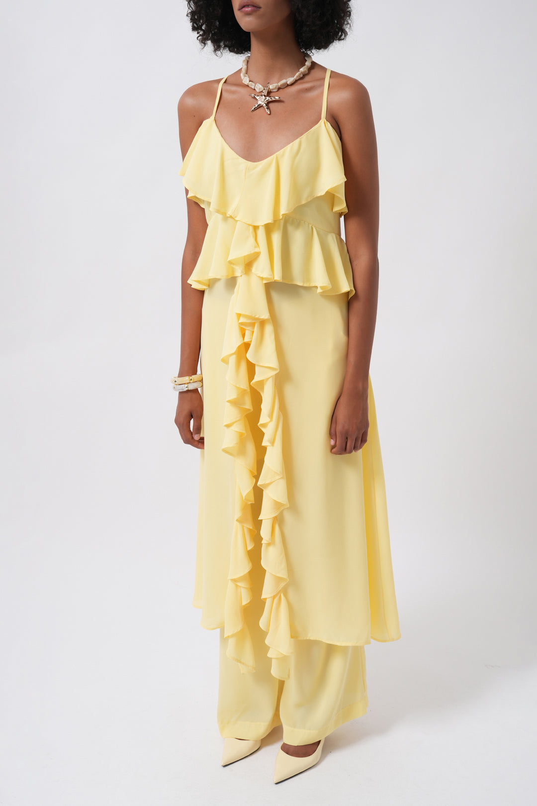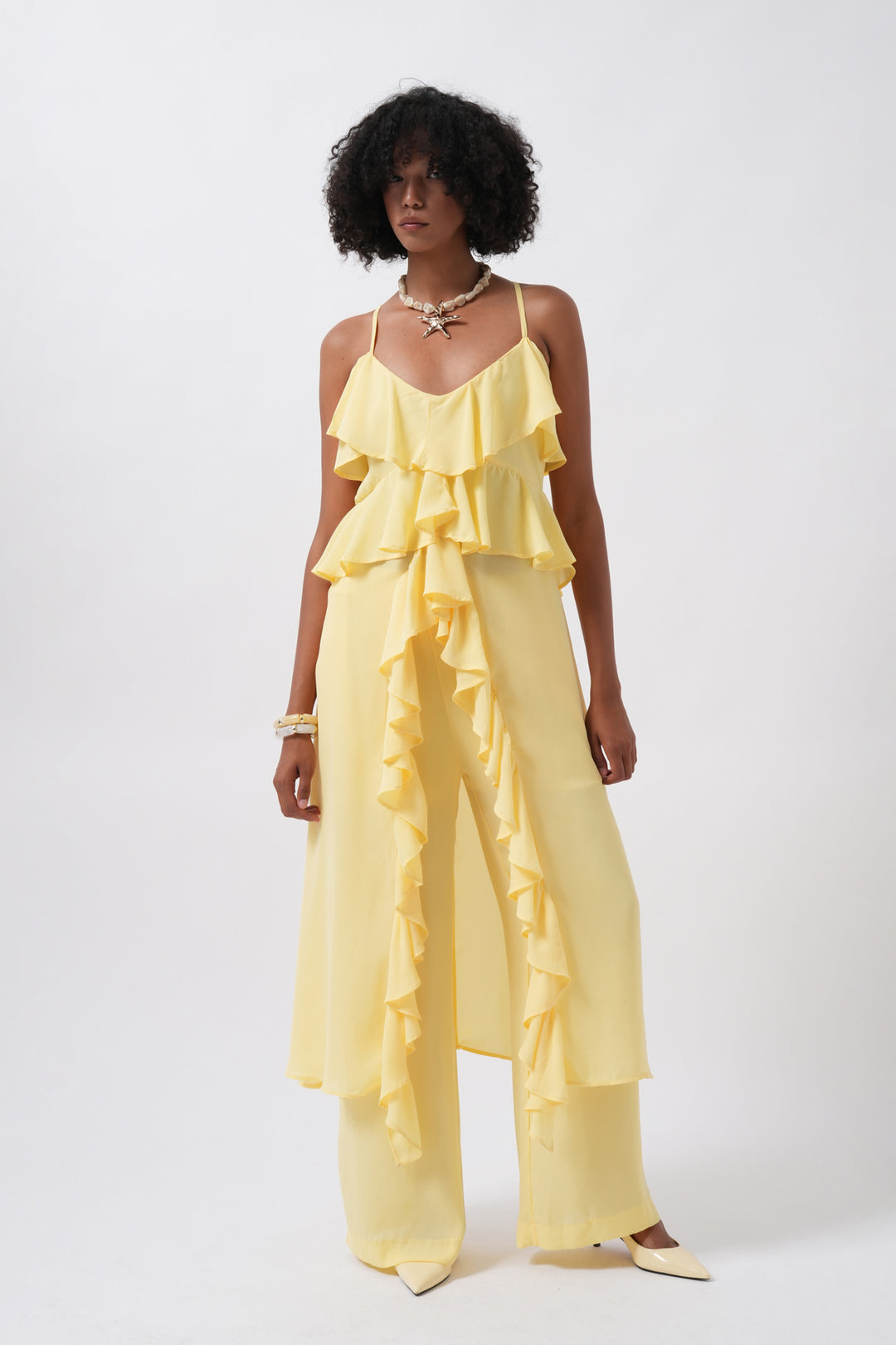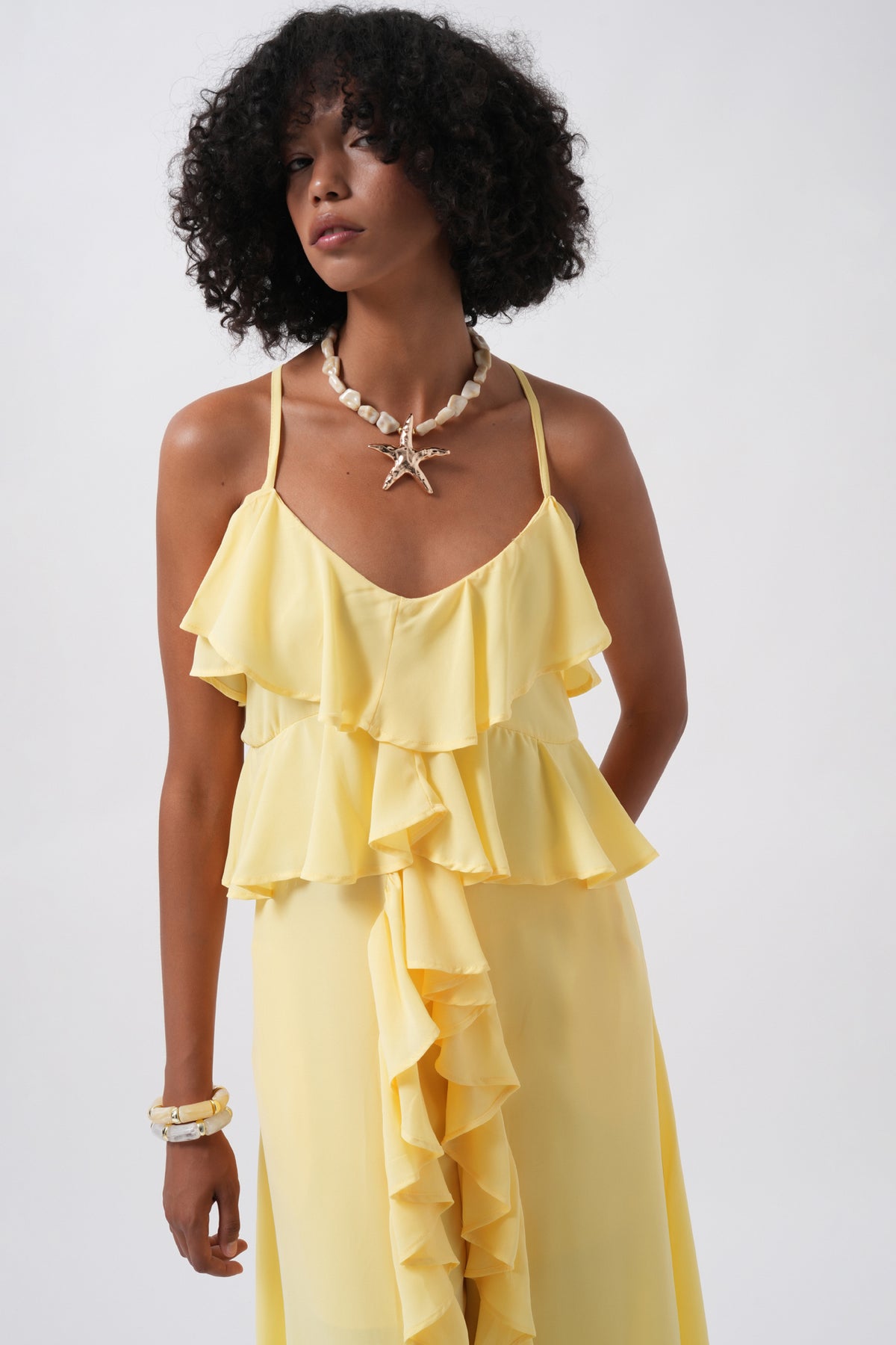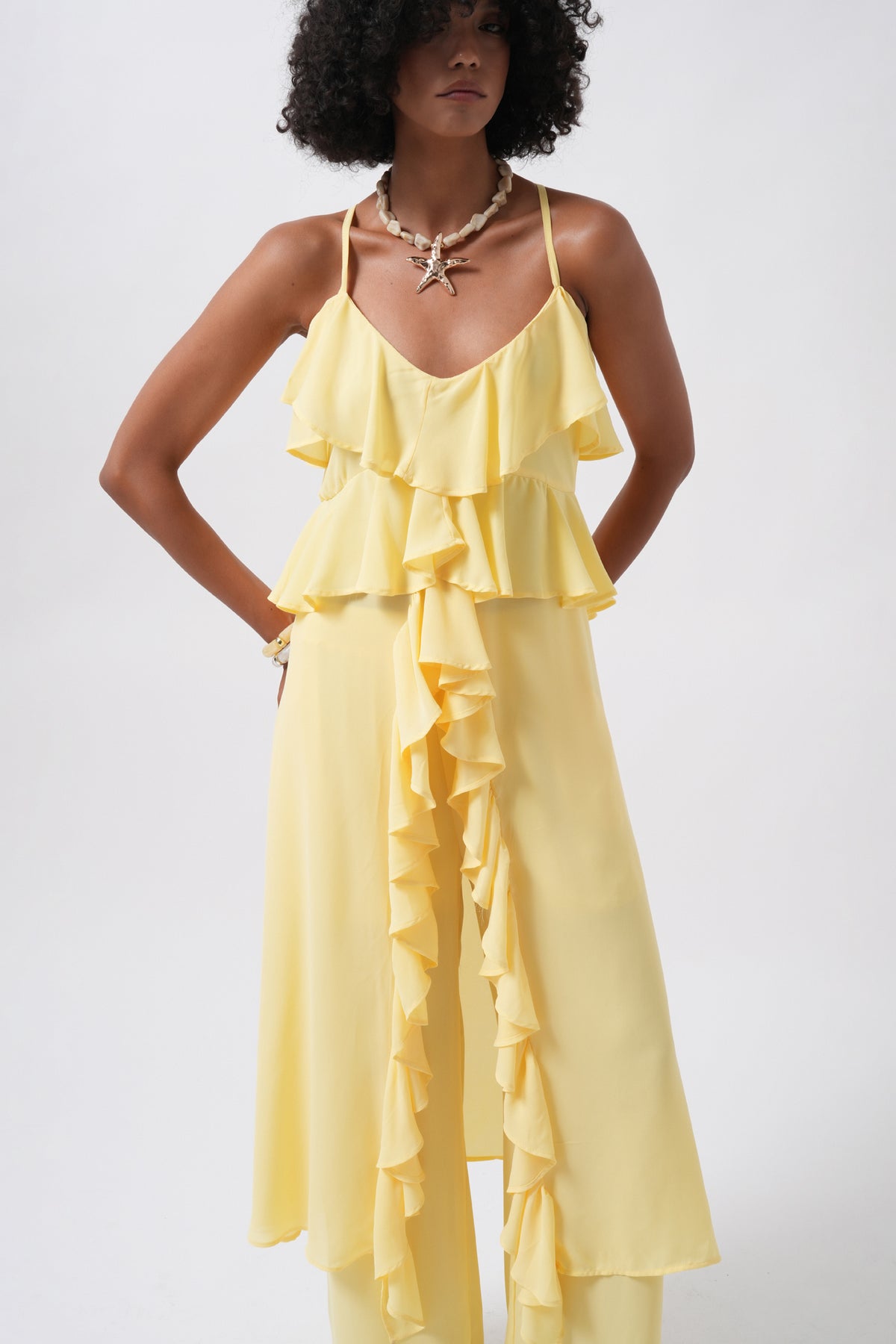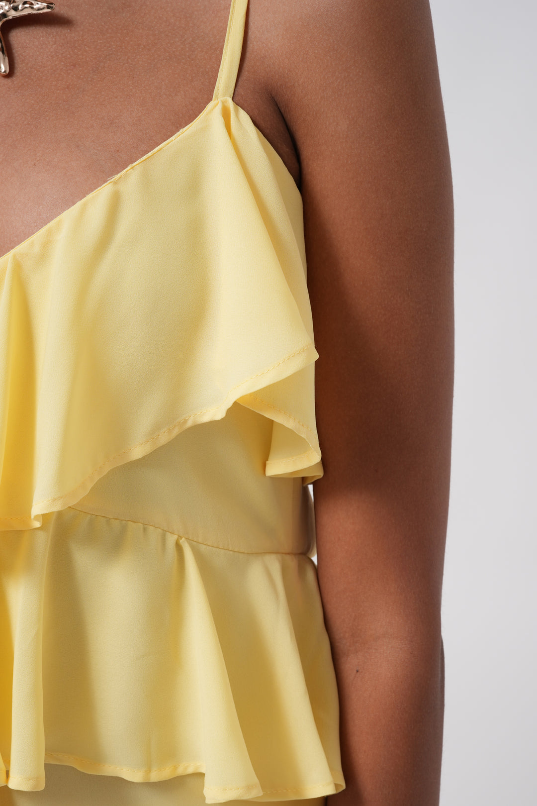Askılı Fırfır Detay Asimetrik Tül Sarı Bluz