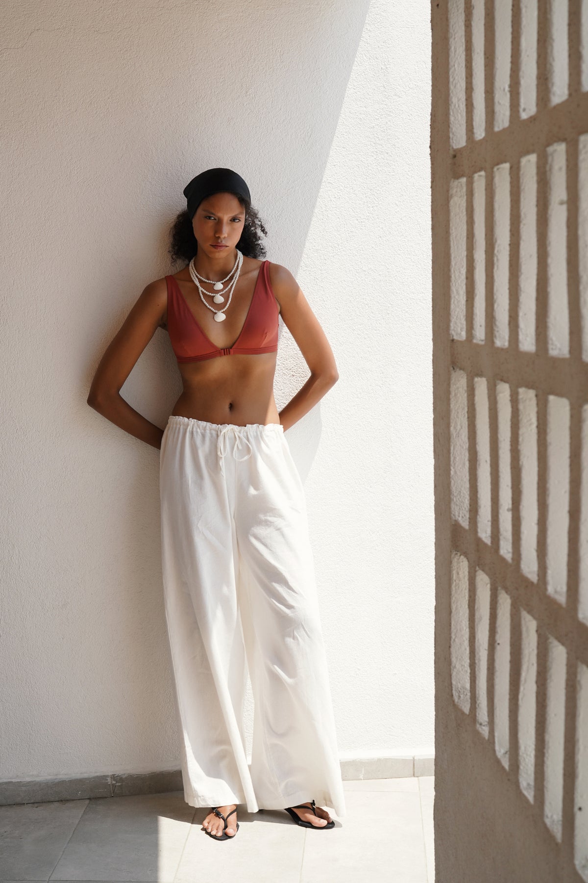 Pamuklu Yıkamalı Kumaş, İnce Bel Detaylı, Bağcıklı Bol Paça Pantolon