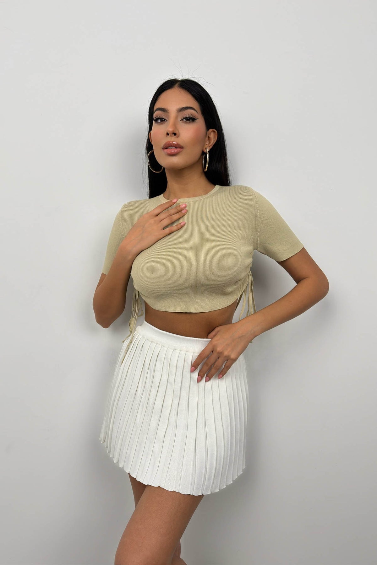 Bel Bağcık Detaylı, Tünel Biyeli, Kısa Kollu, Sıfır Yaka, Yarım Kollu, Triko Örgü, Crop Bluz
