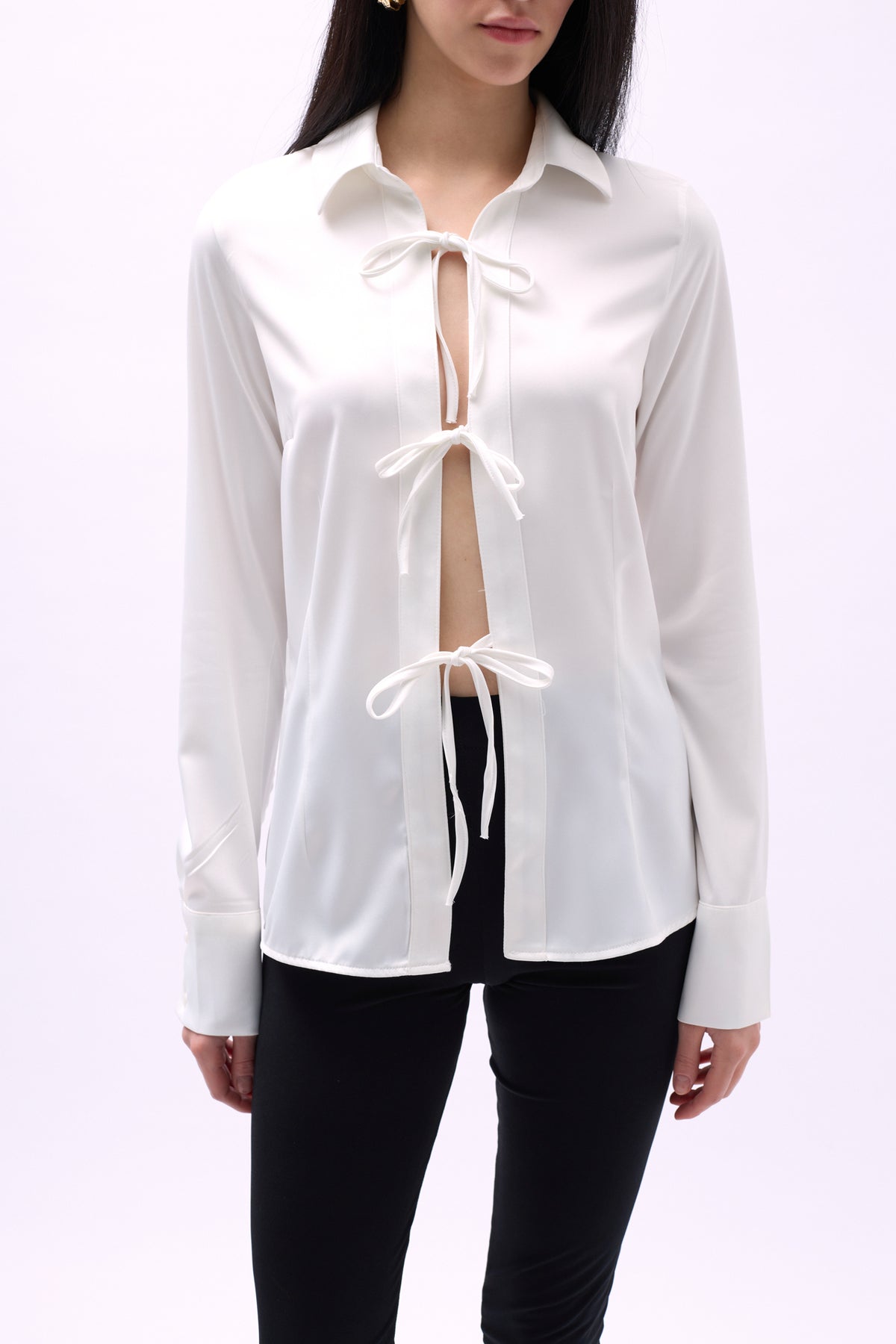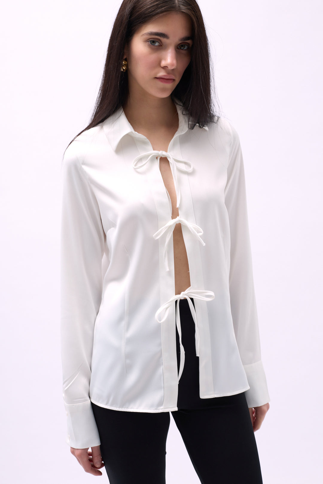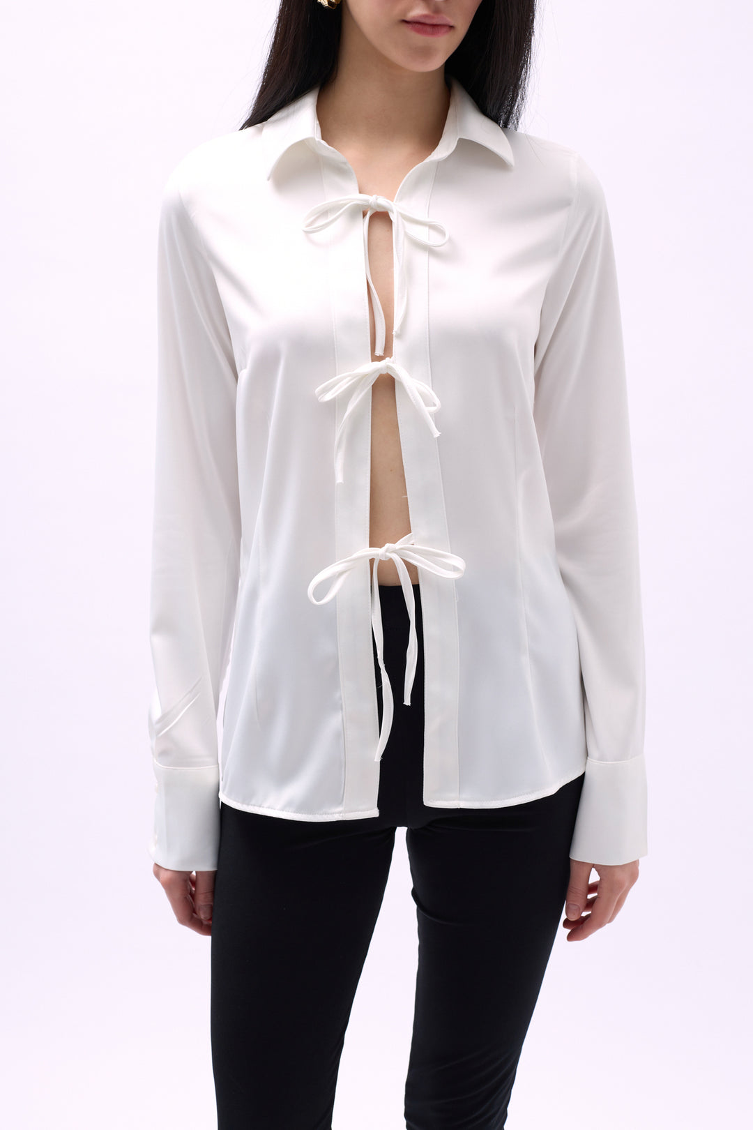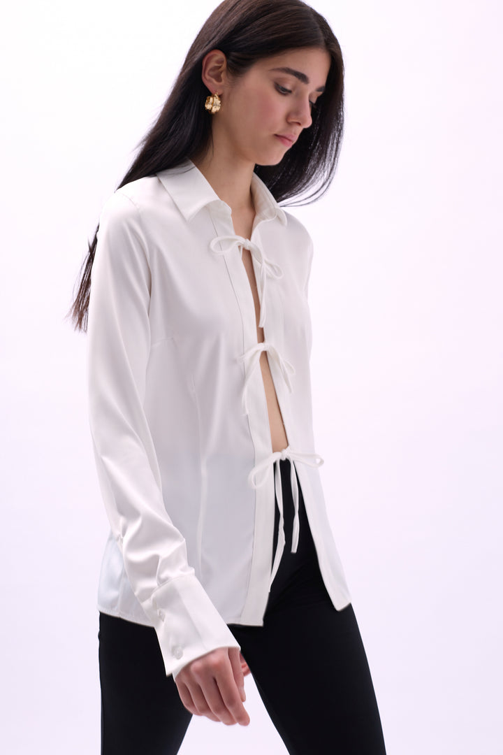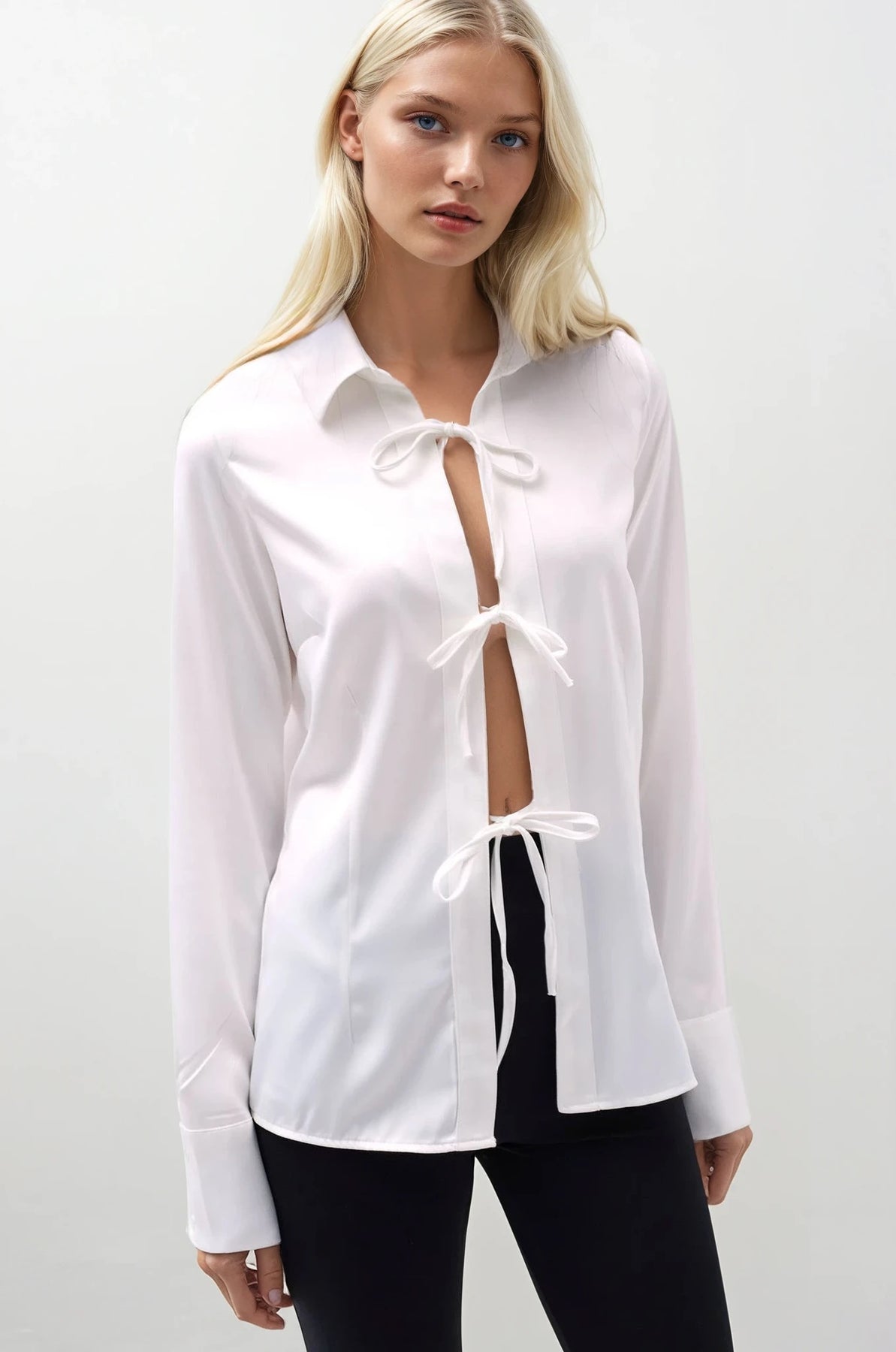 Önü Fiyonk Detaylı, Saten Dokuma Kumaş, Düğmesiz, Manşetli Gömlek