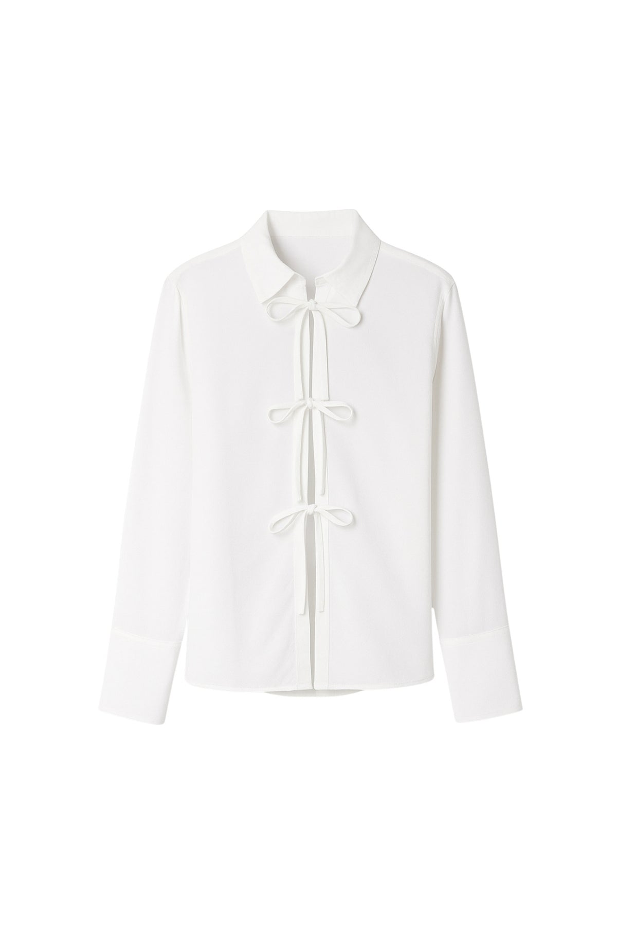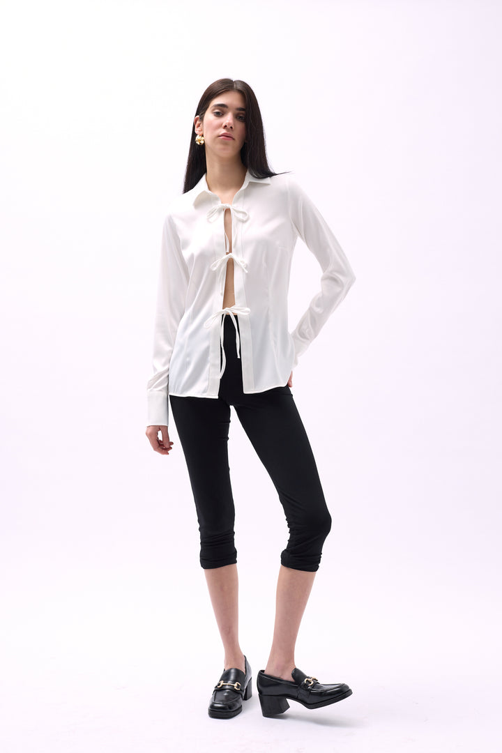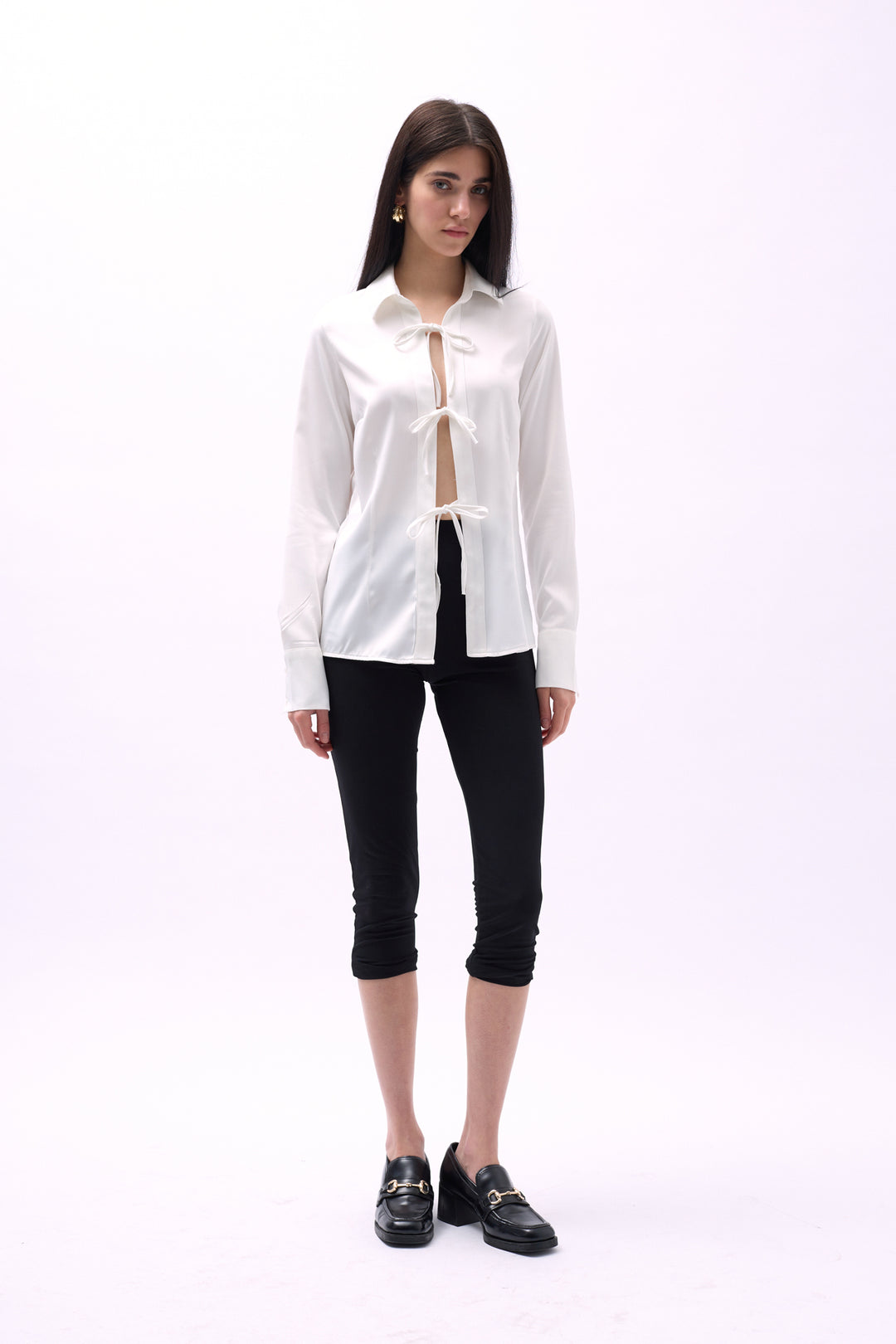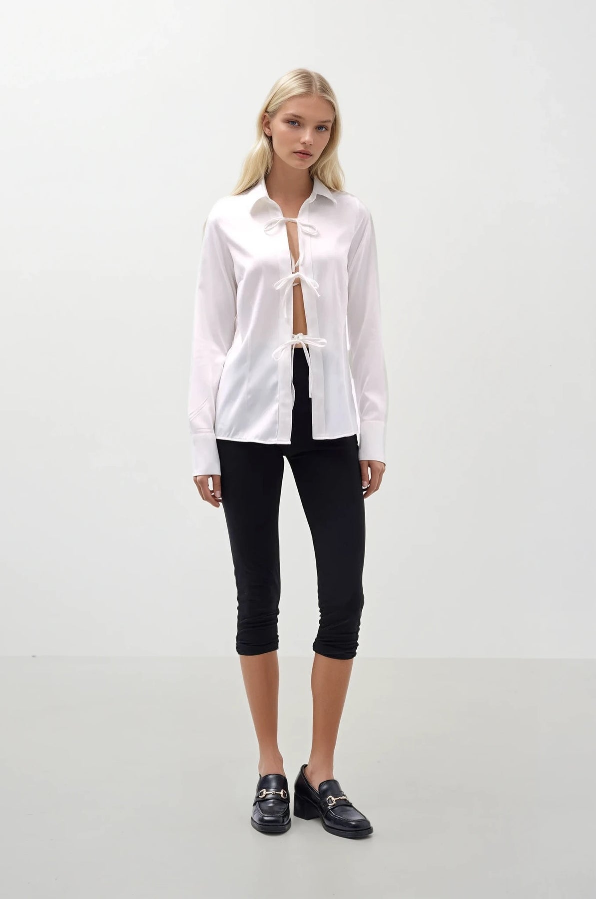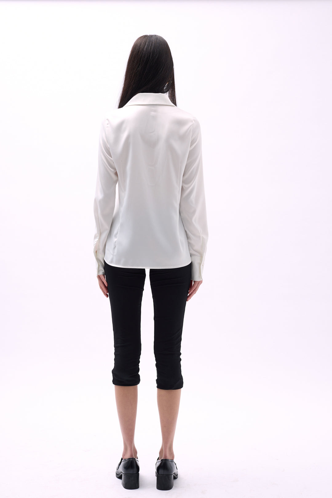 Önü Fiyonk Detaylı, Saten Dokuma Kumaş, Düğmesiz, Manşetli Gömlek
