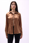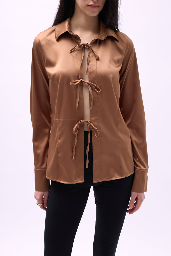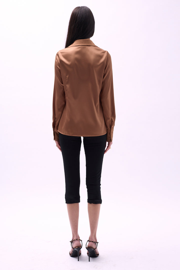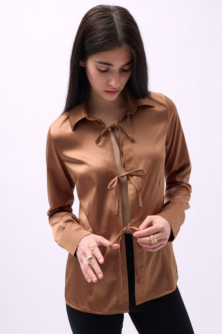 Bağlama Detay Saten Koyu Bej Gömlek