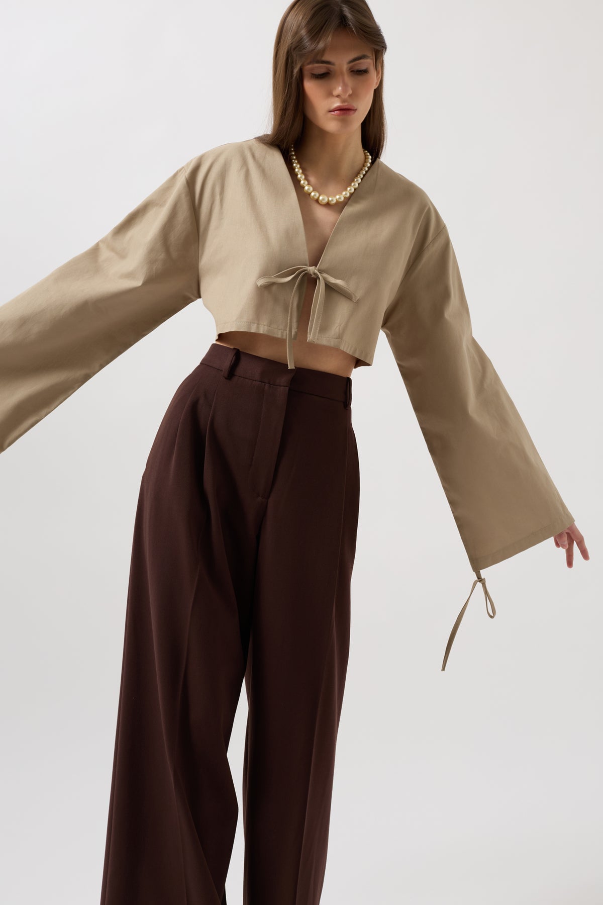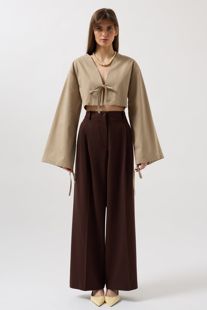 Önü Bağlamalı, Geniş Kollu, V Yaka Formlu, Keten Bluz