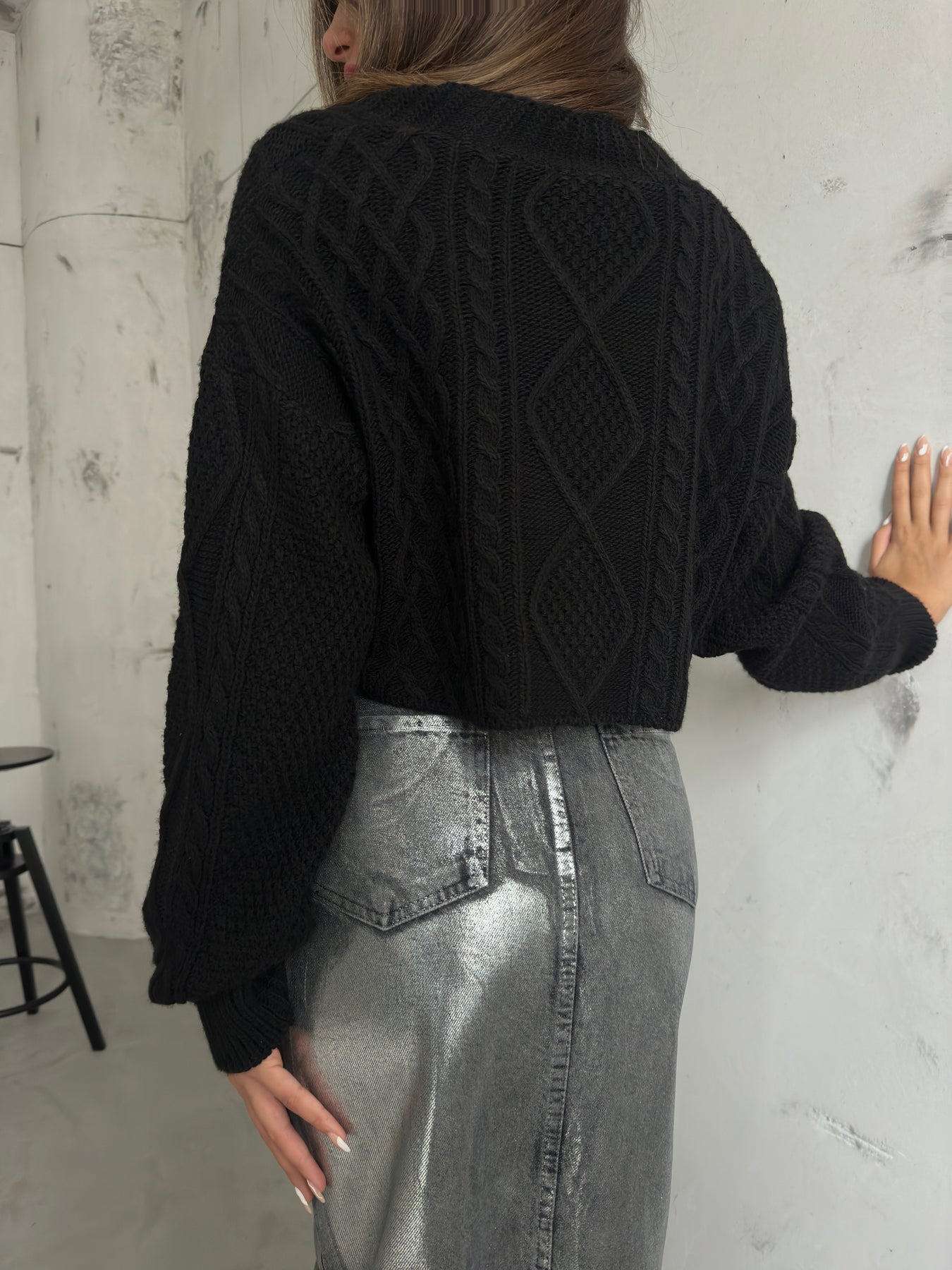 Baklava Desen Gri Crop Saçaklı Hırka