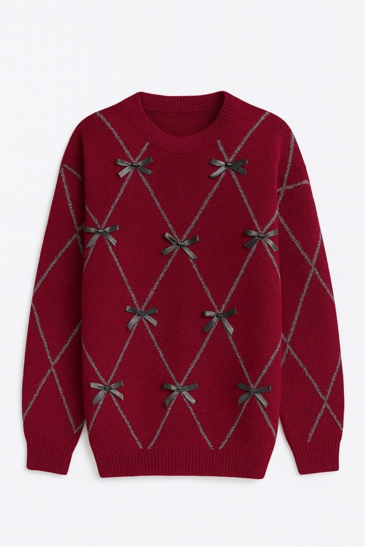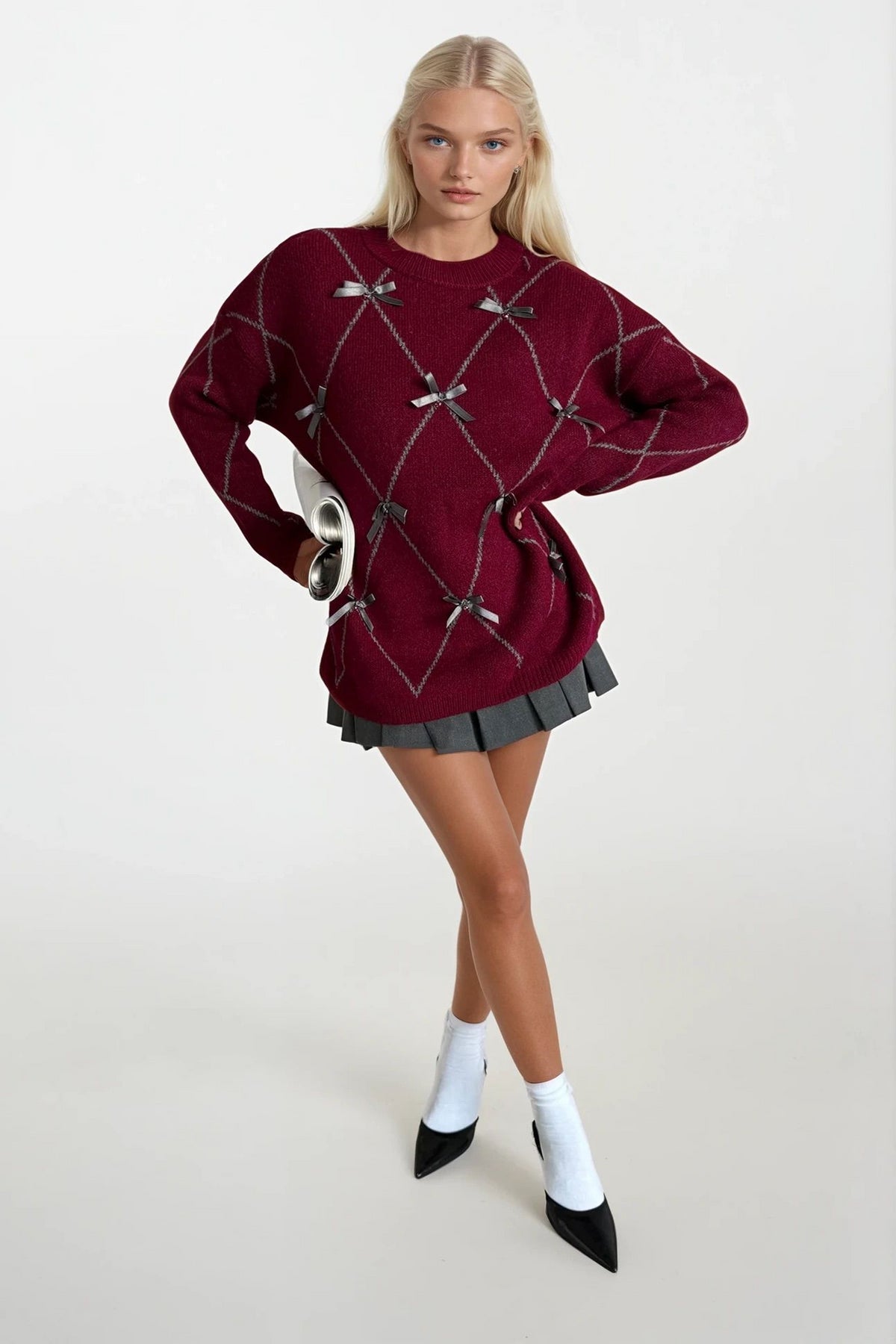 Baklava Desen Taş İşlemeli Fiyonklu Bordo Kazak
