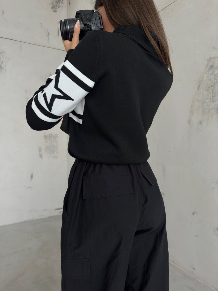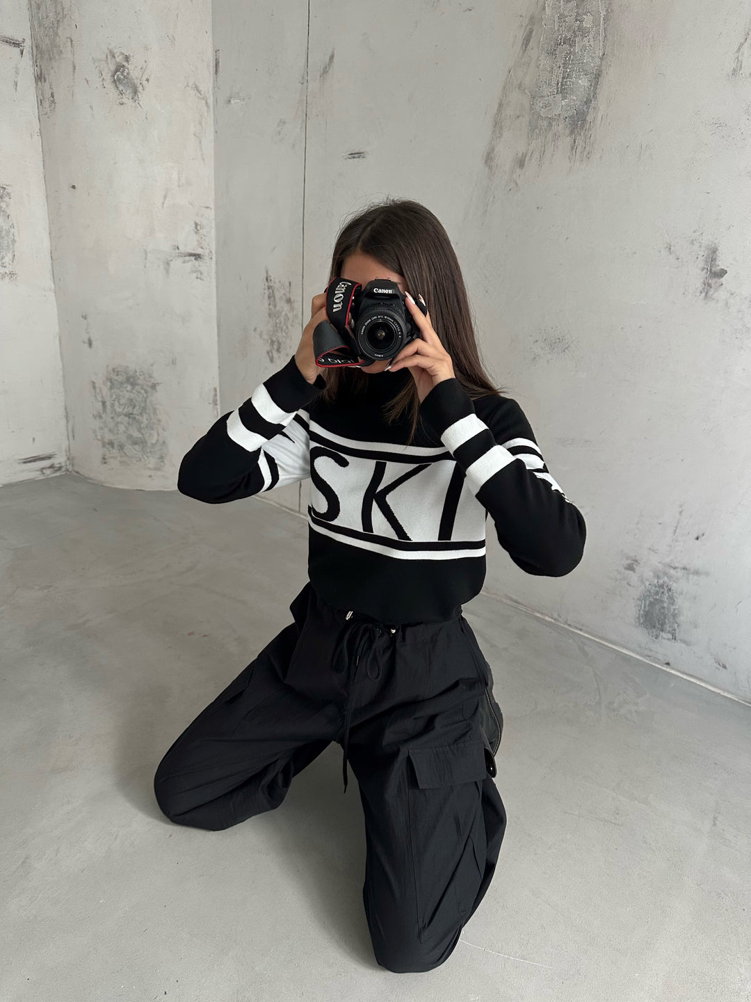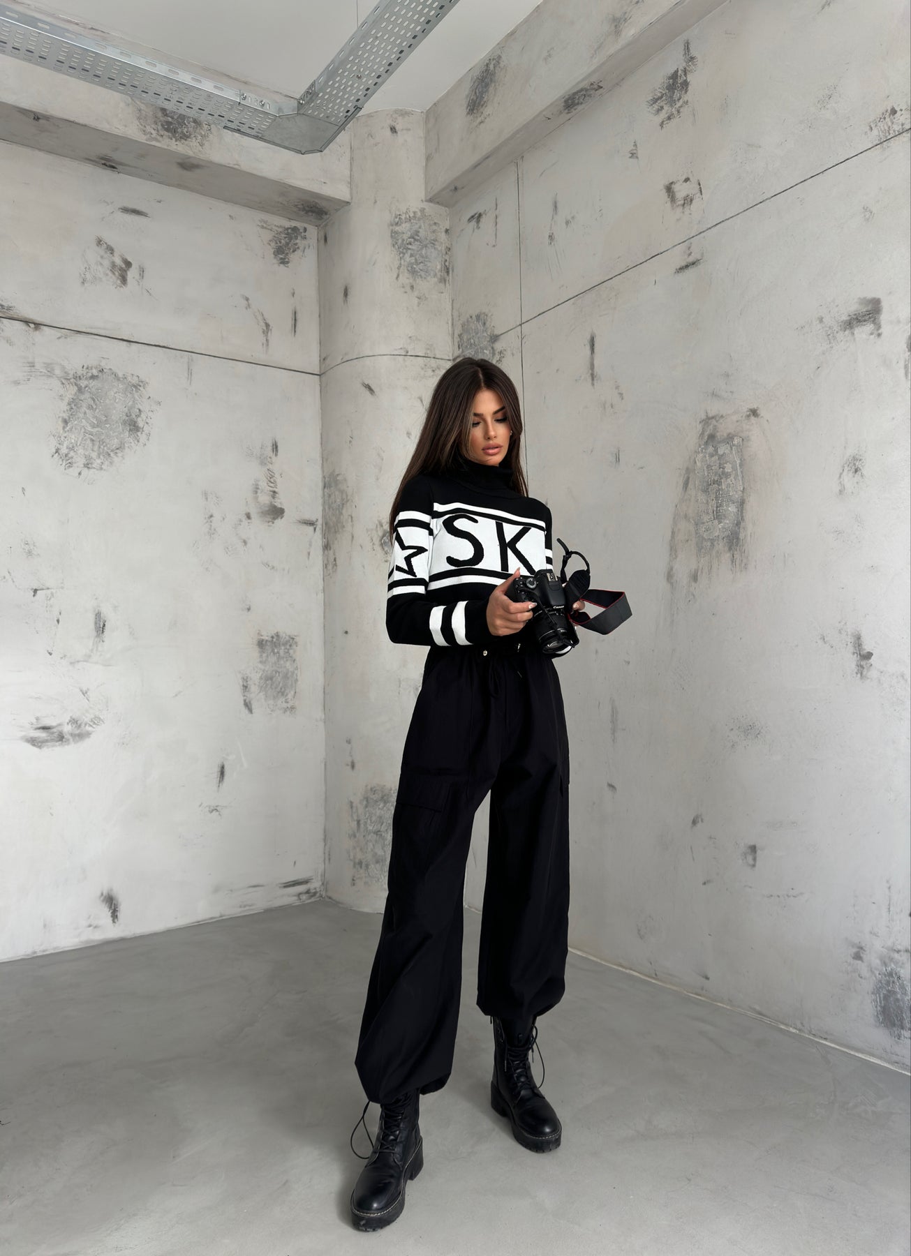 Balıkçı Yaka Jakarlı Siyah Kazak