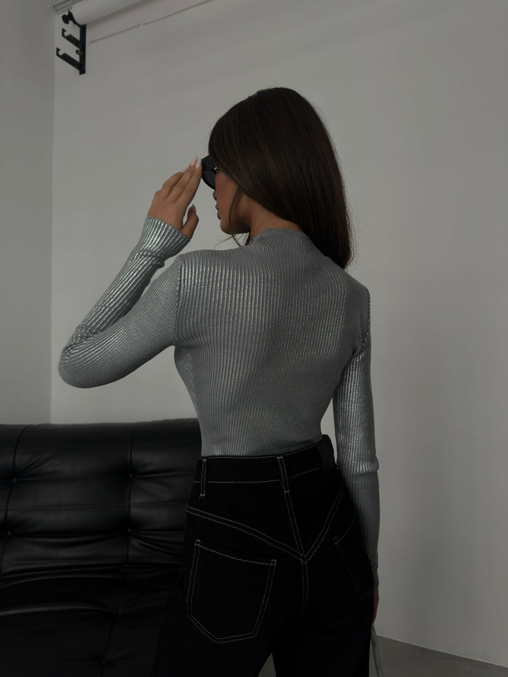 Balıkçı Yaka Metalik Gri Triko Bluz