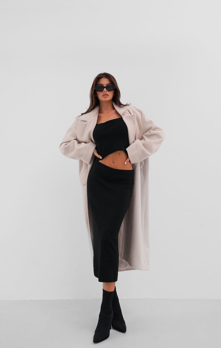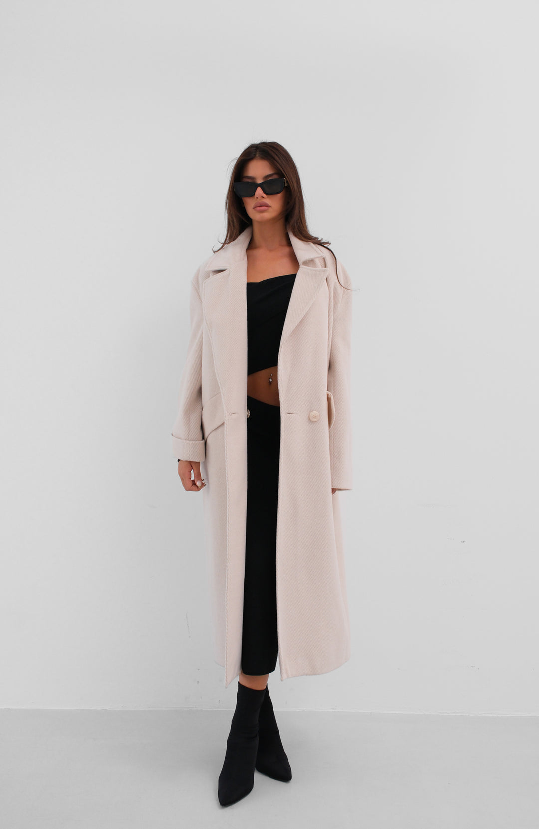 Balıksırtı Desenli, Cepli, Oversize Maxi Boy Kaban