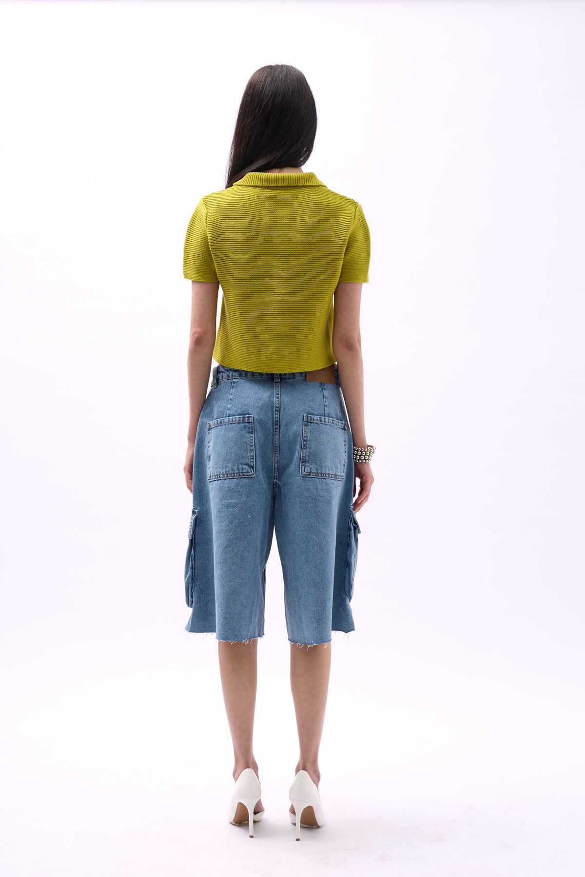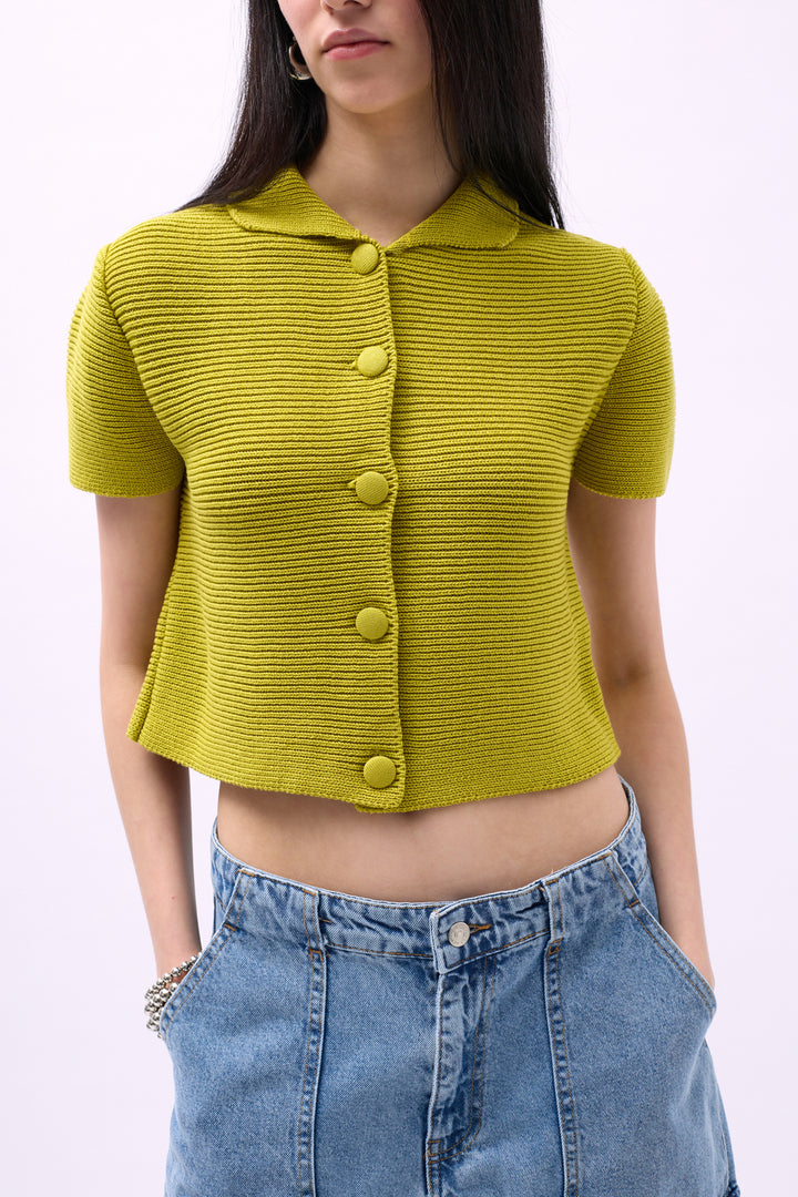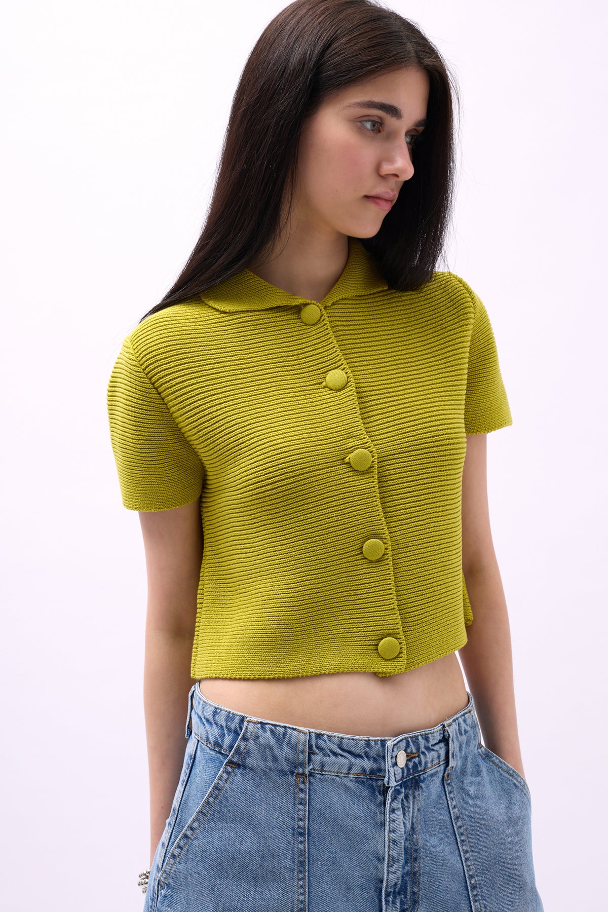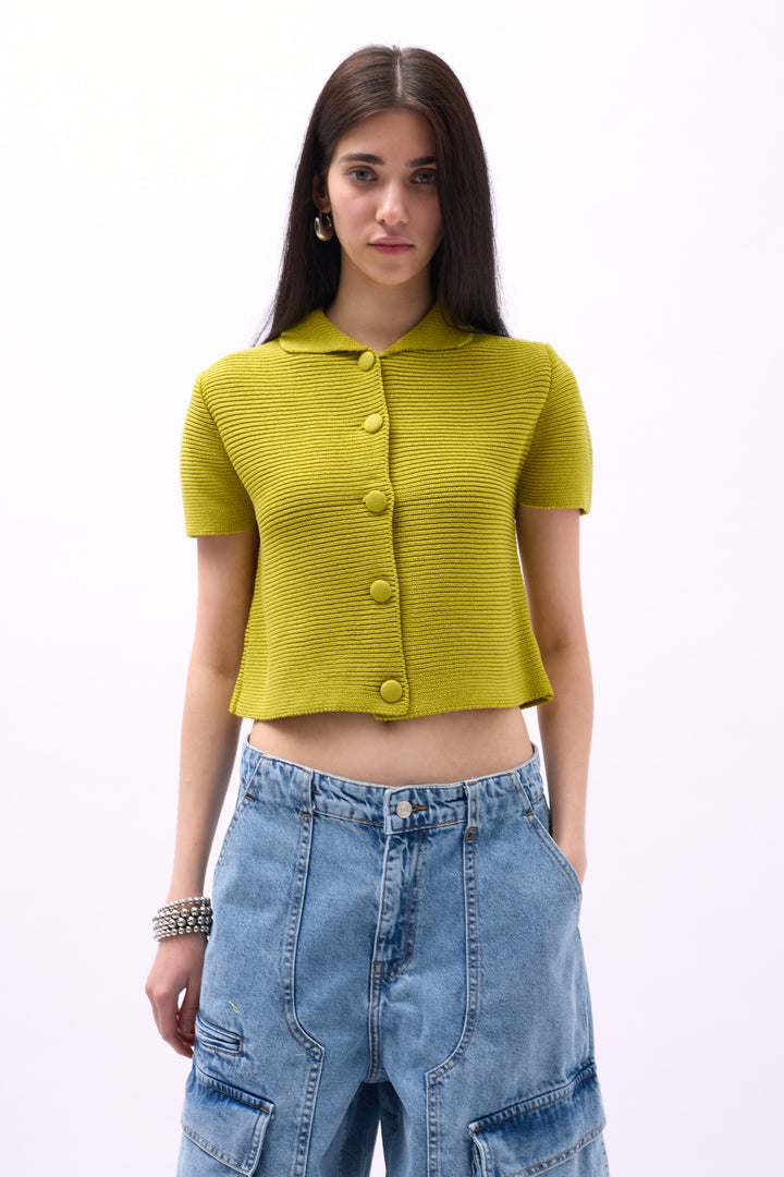 Kısa Kol, Polo Yaka, Düğmeli, Triko Örgü Crop Bluz