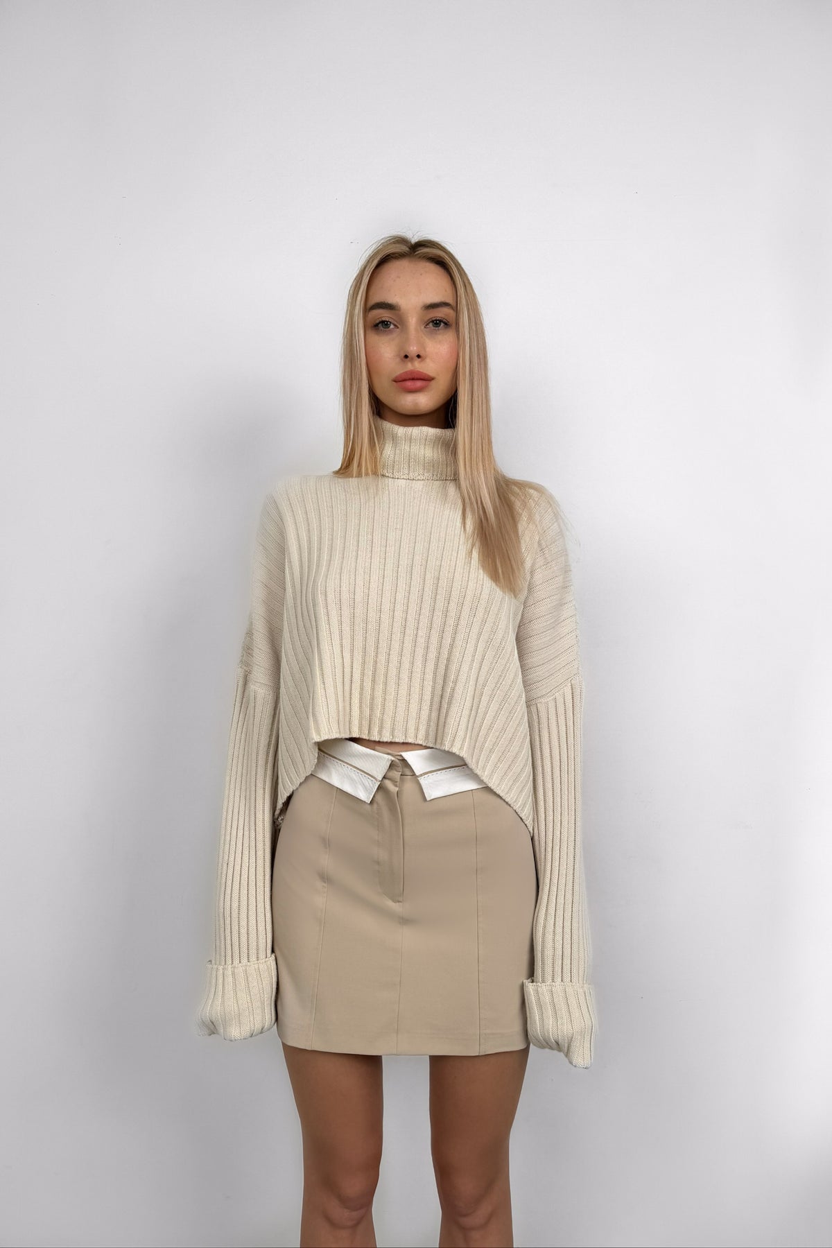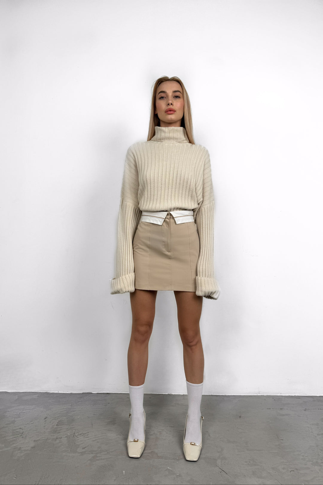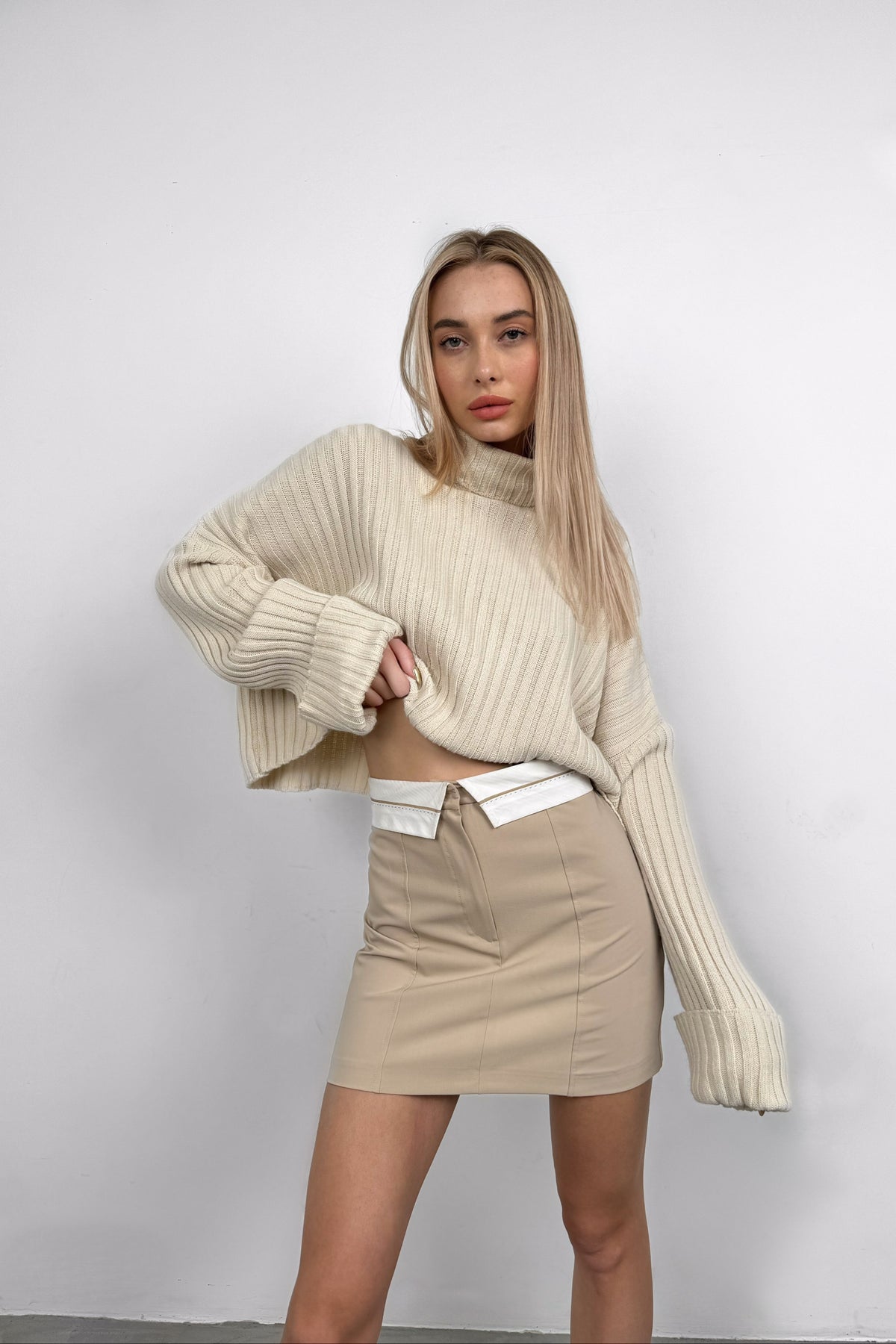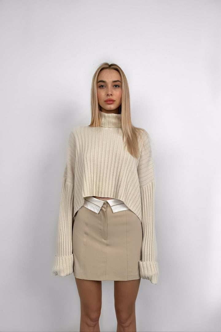 Bel Katlamalı Bej Mini Etek