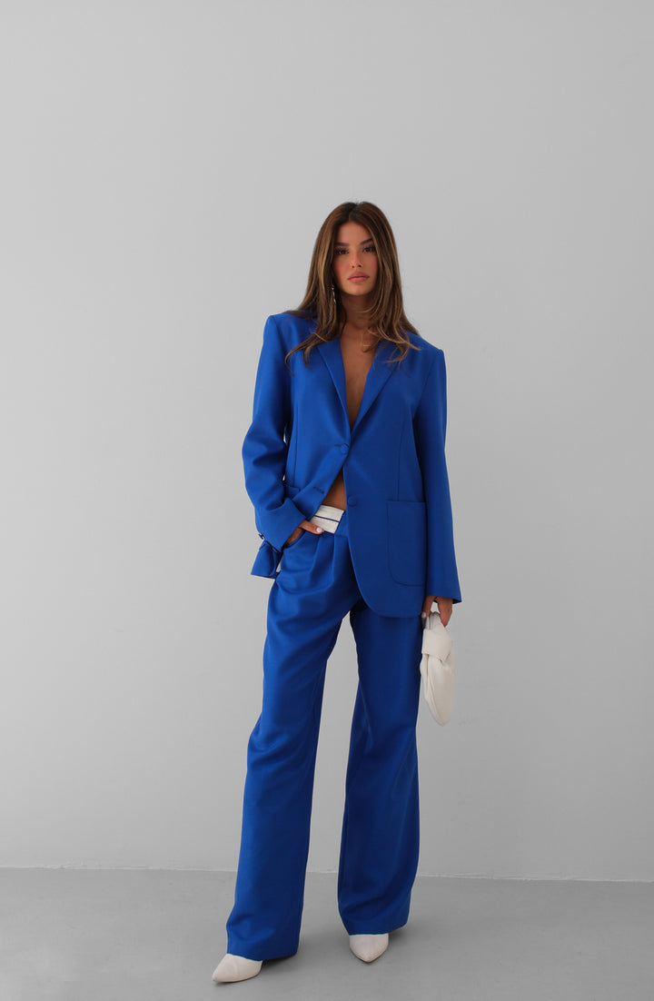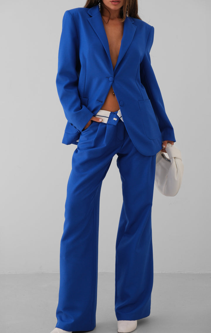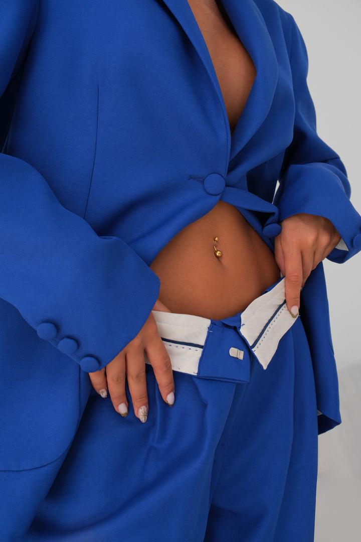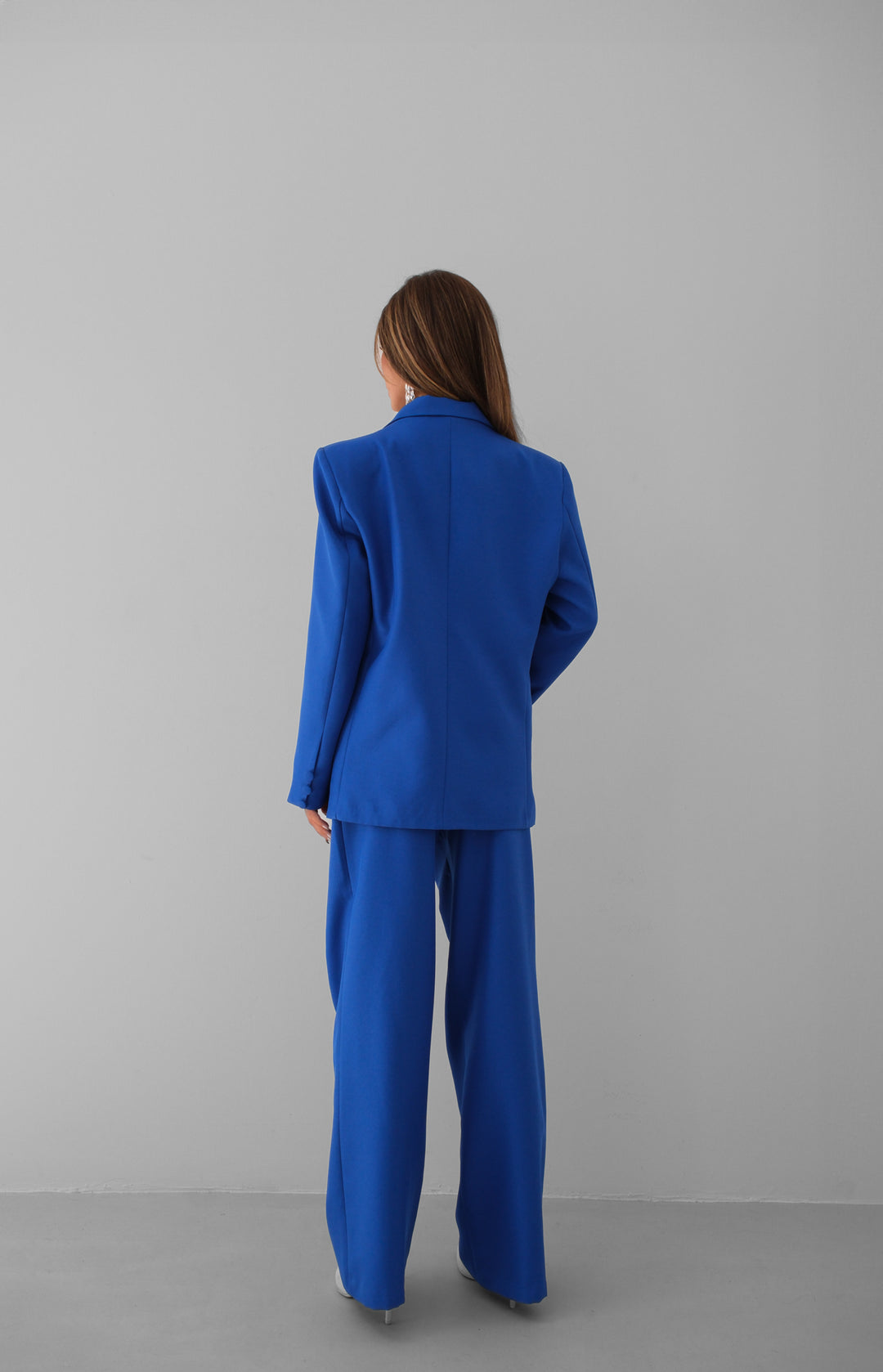 Bel Katlamalı Saks Pantolon Blazer Ceket Takım