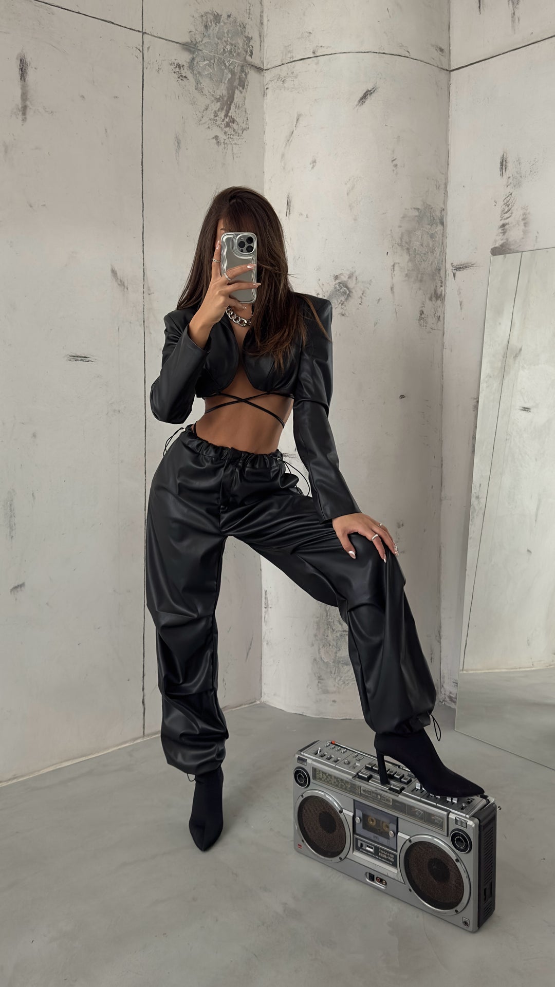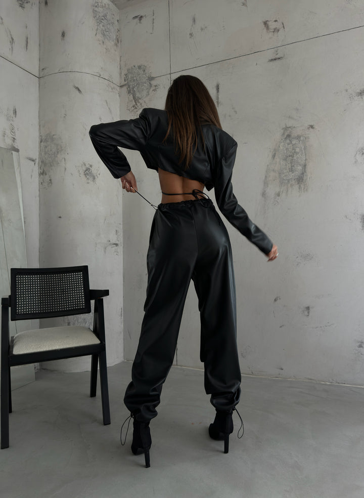 Bel Lastikli Deri Siyah Pantolon