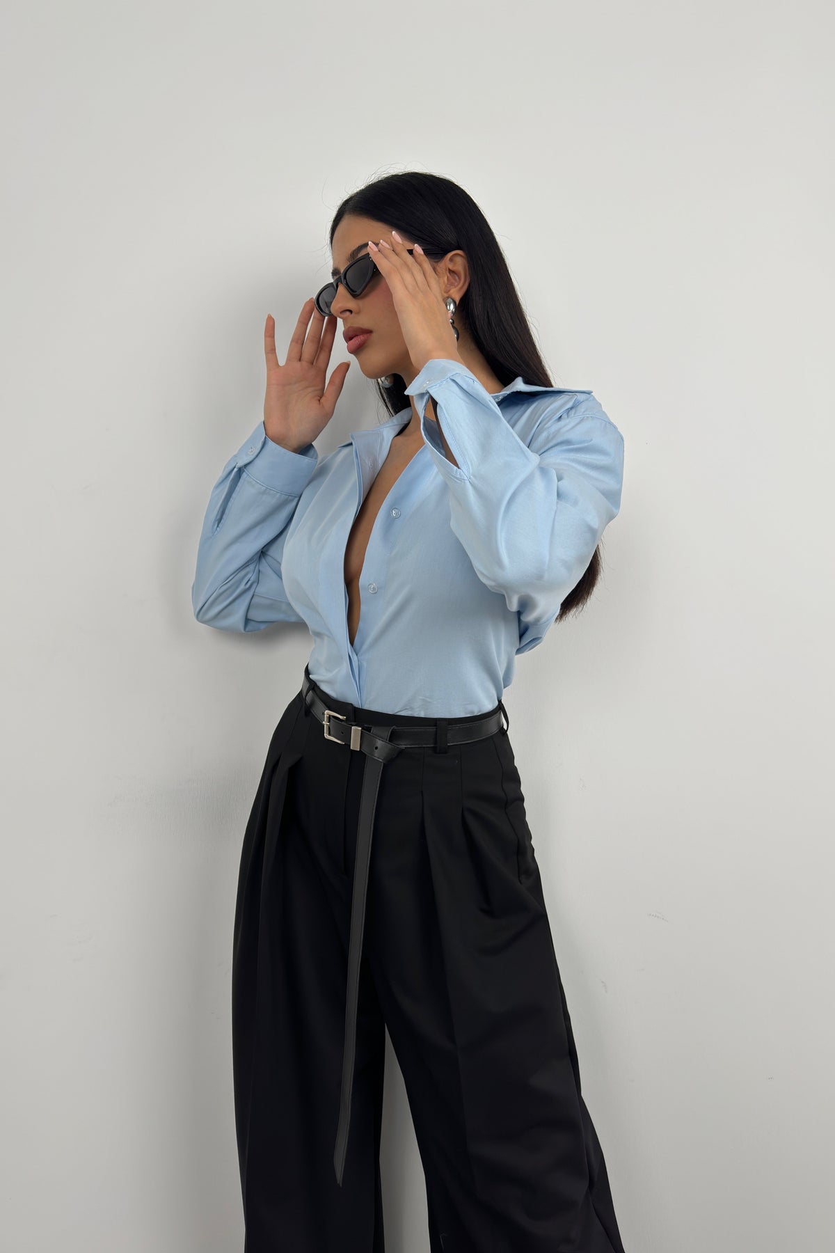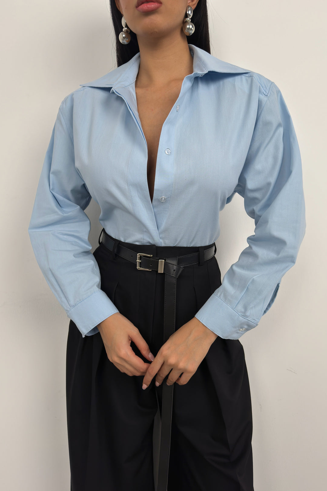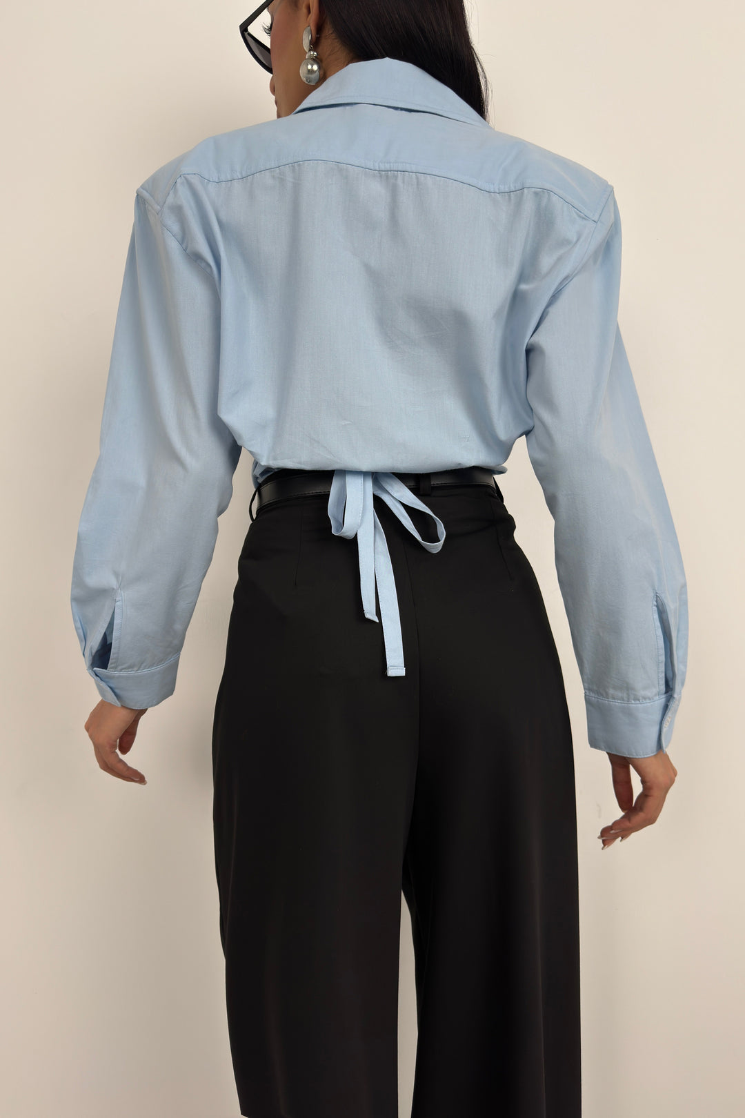 Bel Oturtmalı Vatkalı Mavi Gömlek