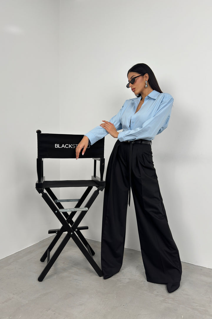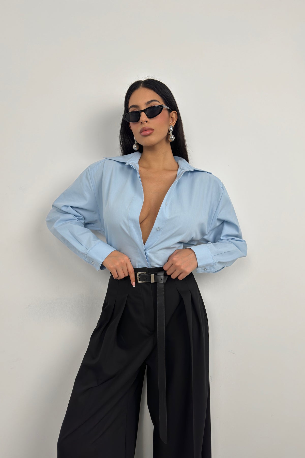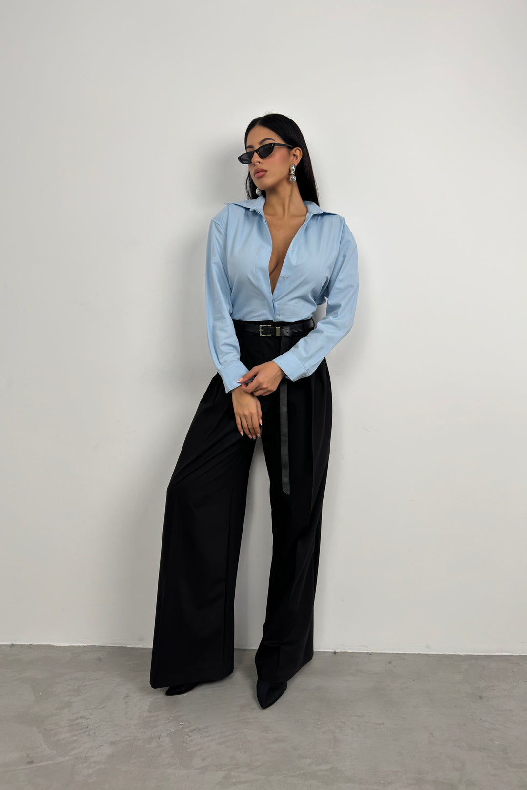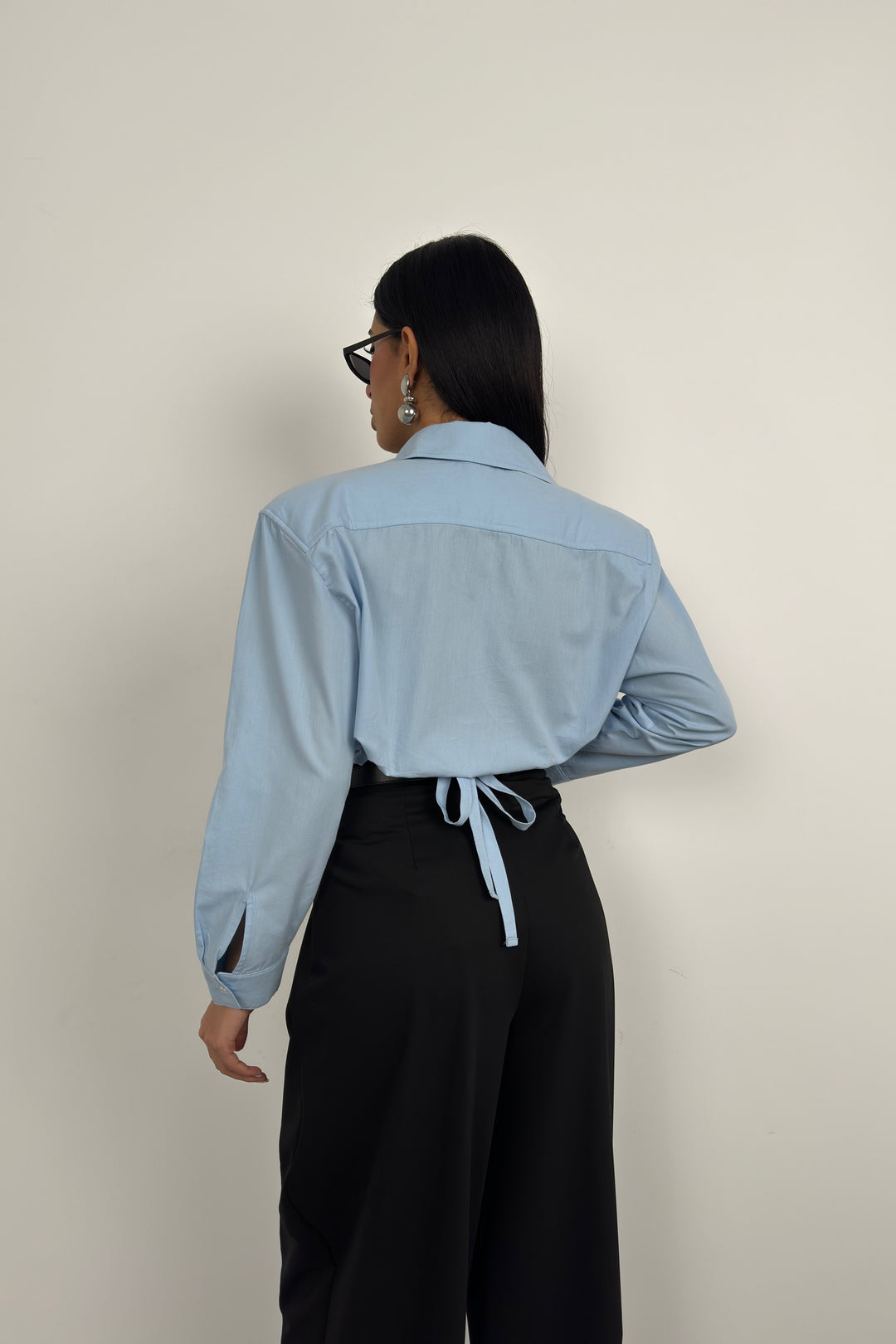 Bel Oturtmalı Vatkalı Mavi Gömlek