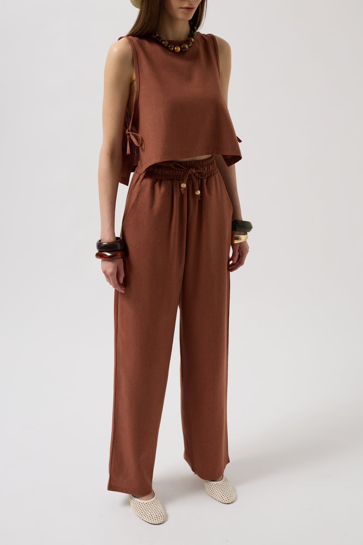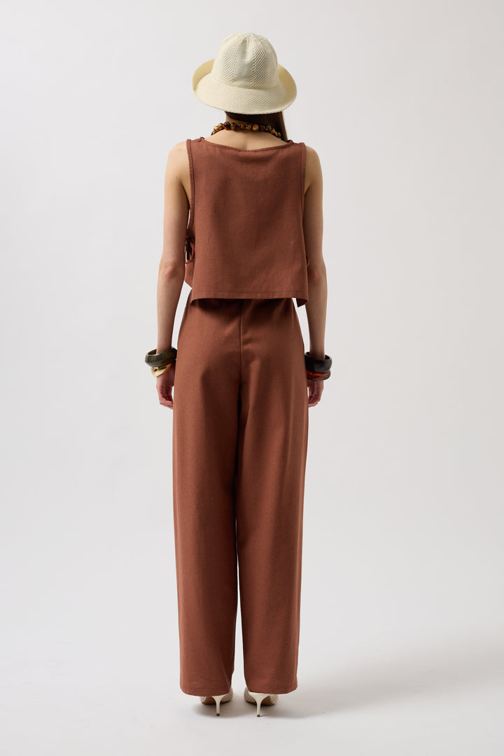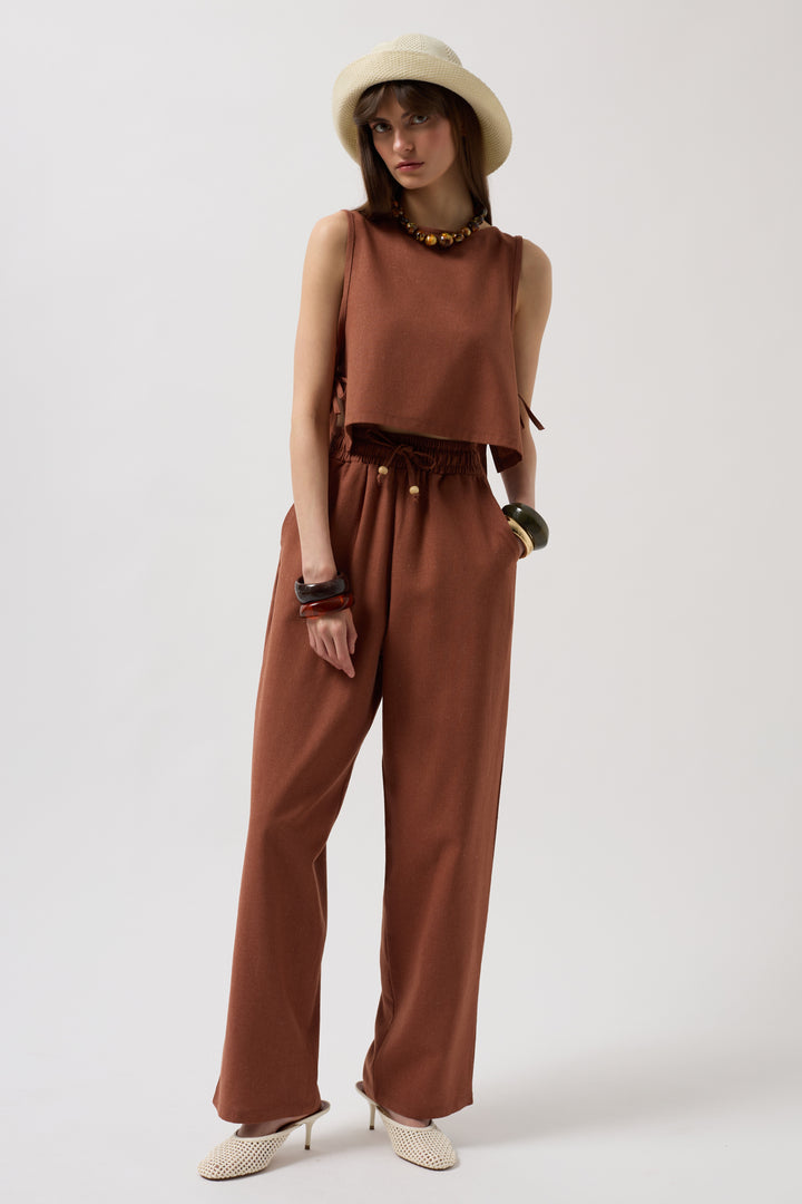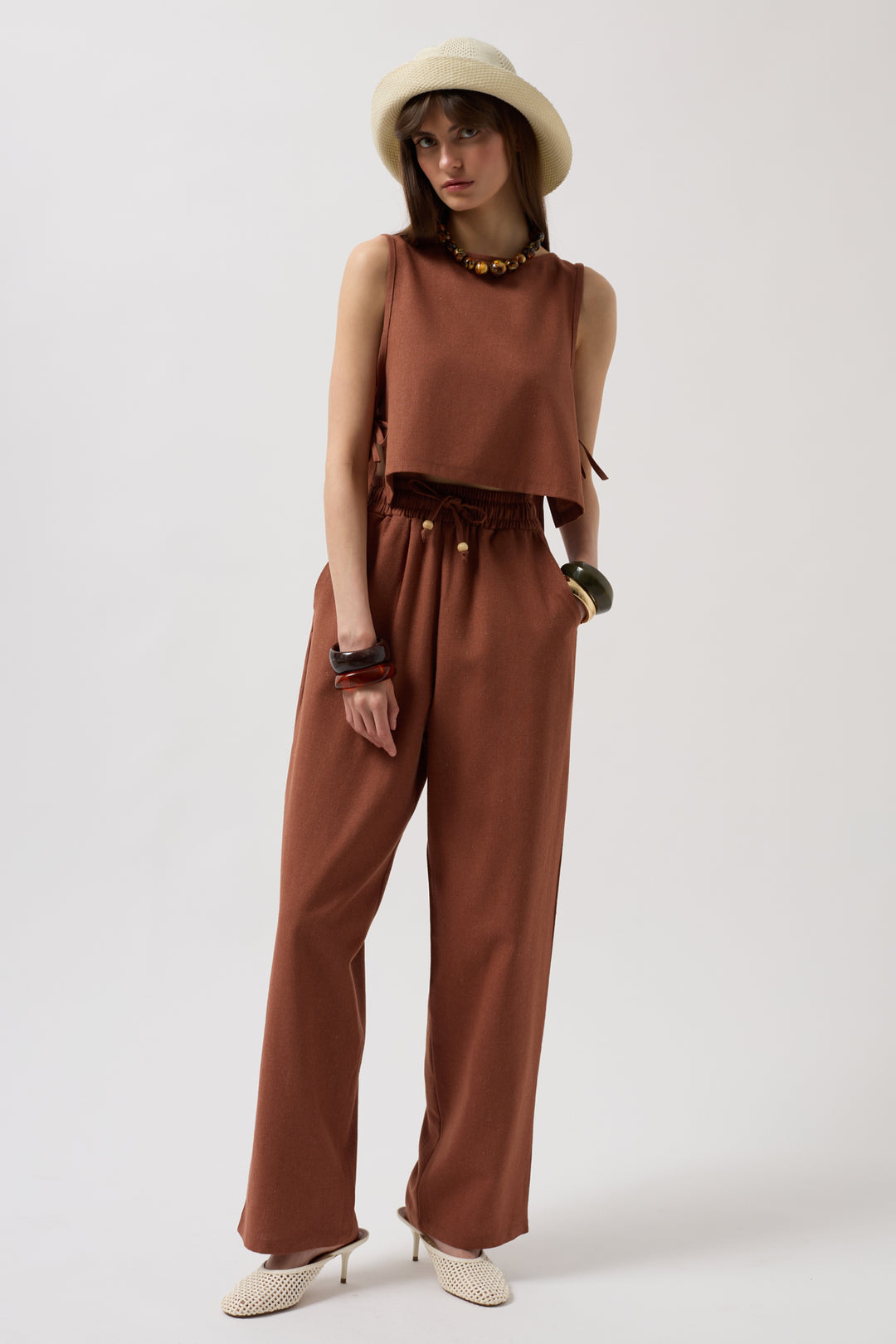 Beli Bağcıklı Düz Kesim Kahverengi Pantolon