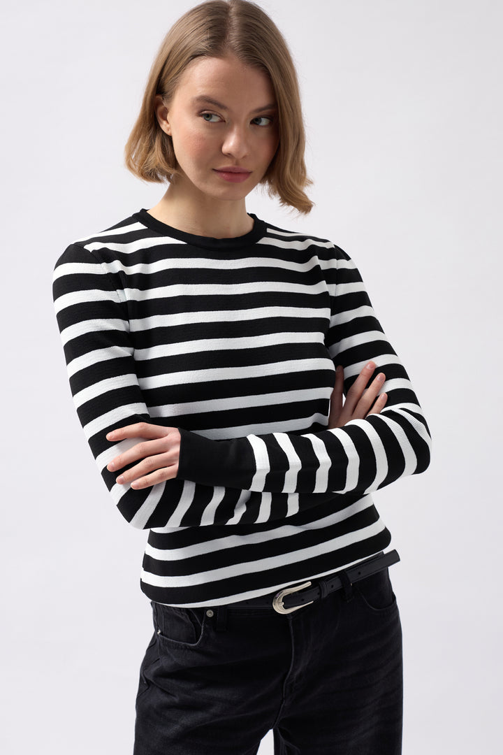 Bisiklet Yaka Çizgili Beyaz-Siyah Bluz