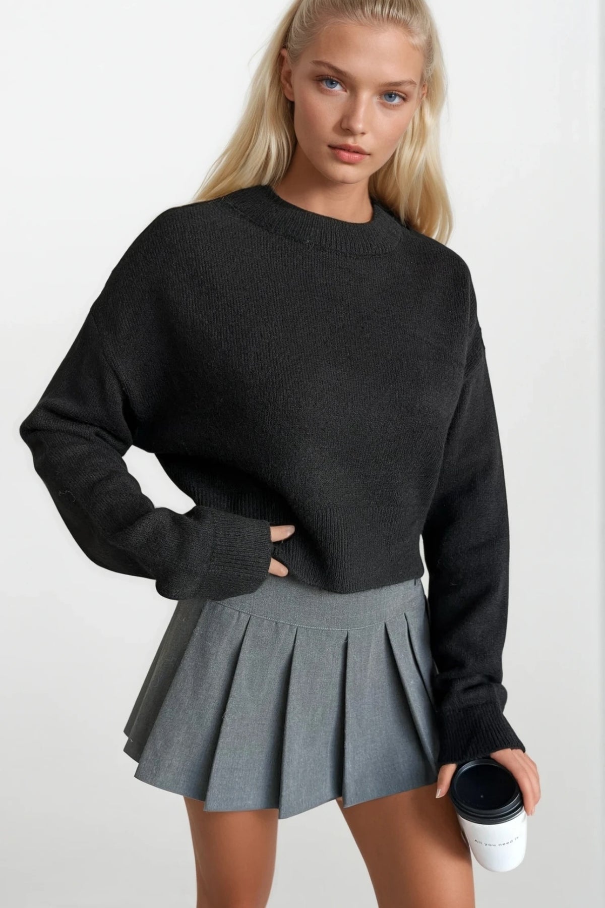 Bisiklet Yaka Crop Siyah Triko Kazak
