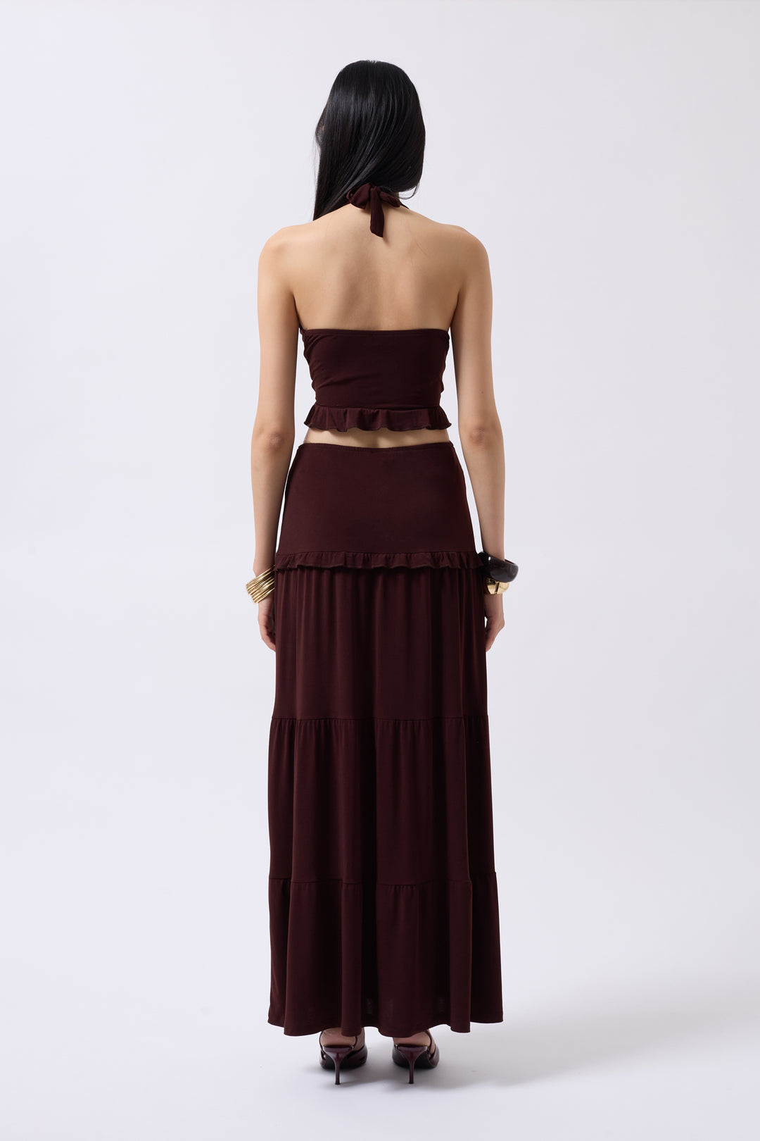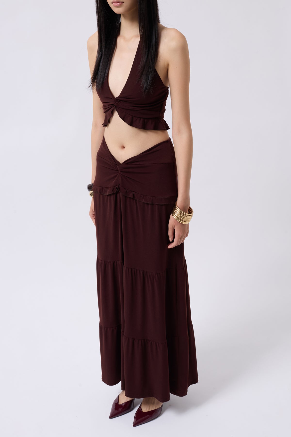 Büzgü Detay Asimetrik Bel Kahverengi Etek