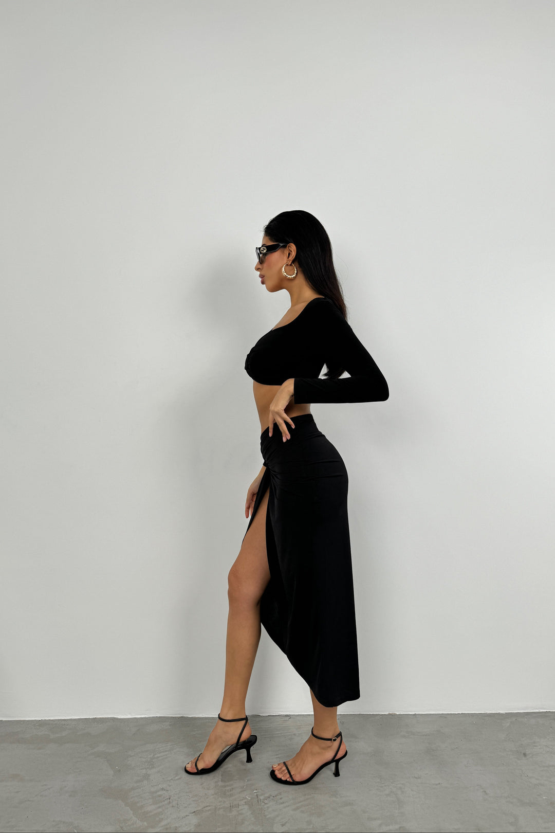Büzgü Detay Siyah Yırtmaçlı Etek