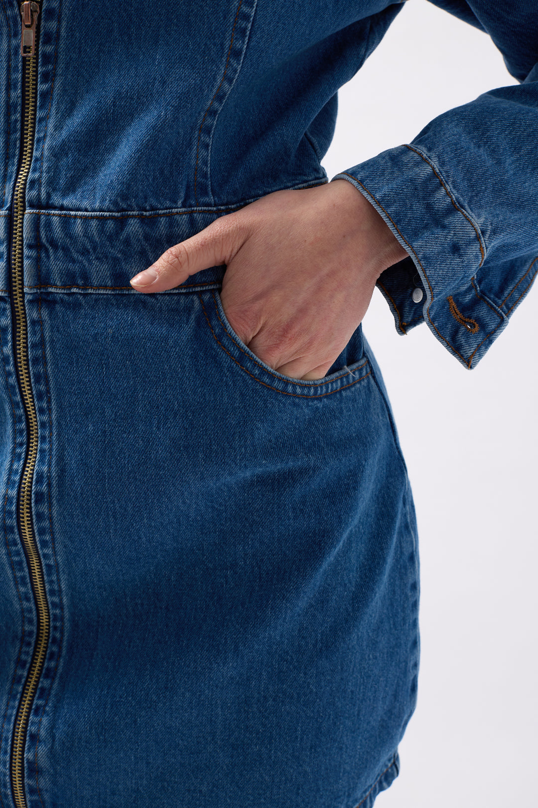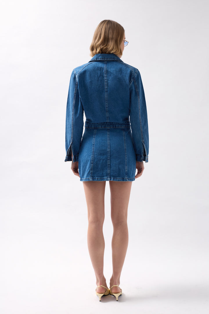 Boydan Fermuarlı, Dört Cepli, Denim Kumaş Mini Elbise