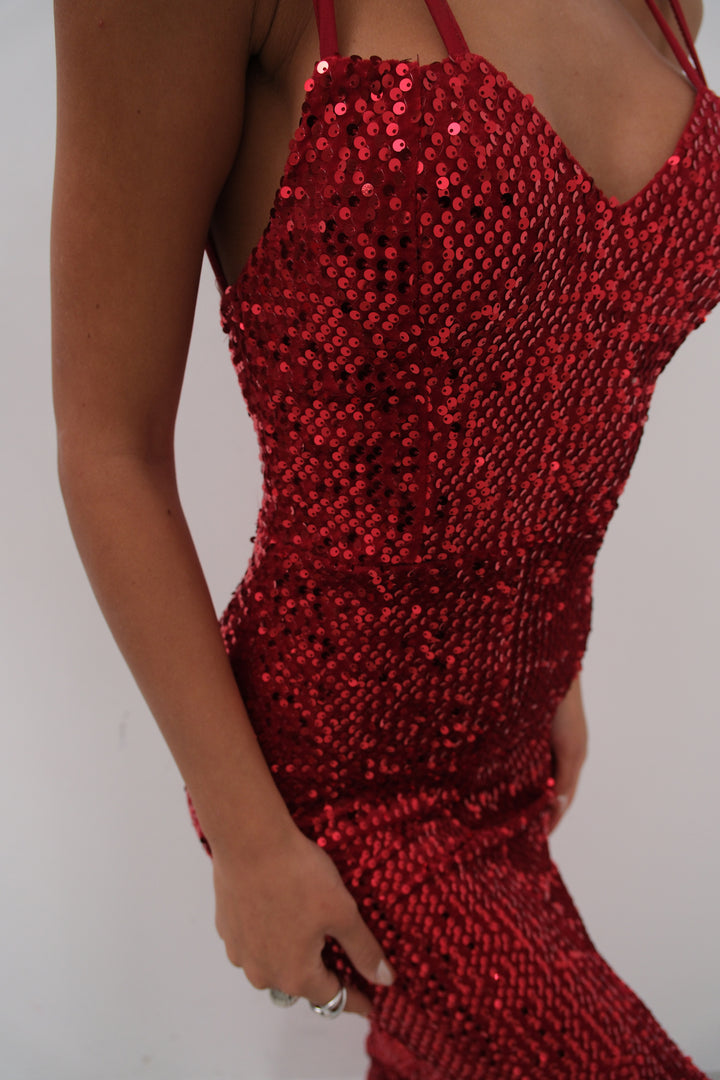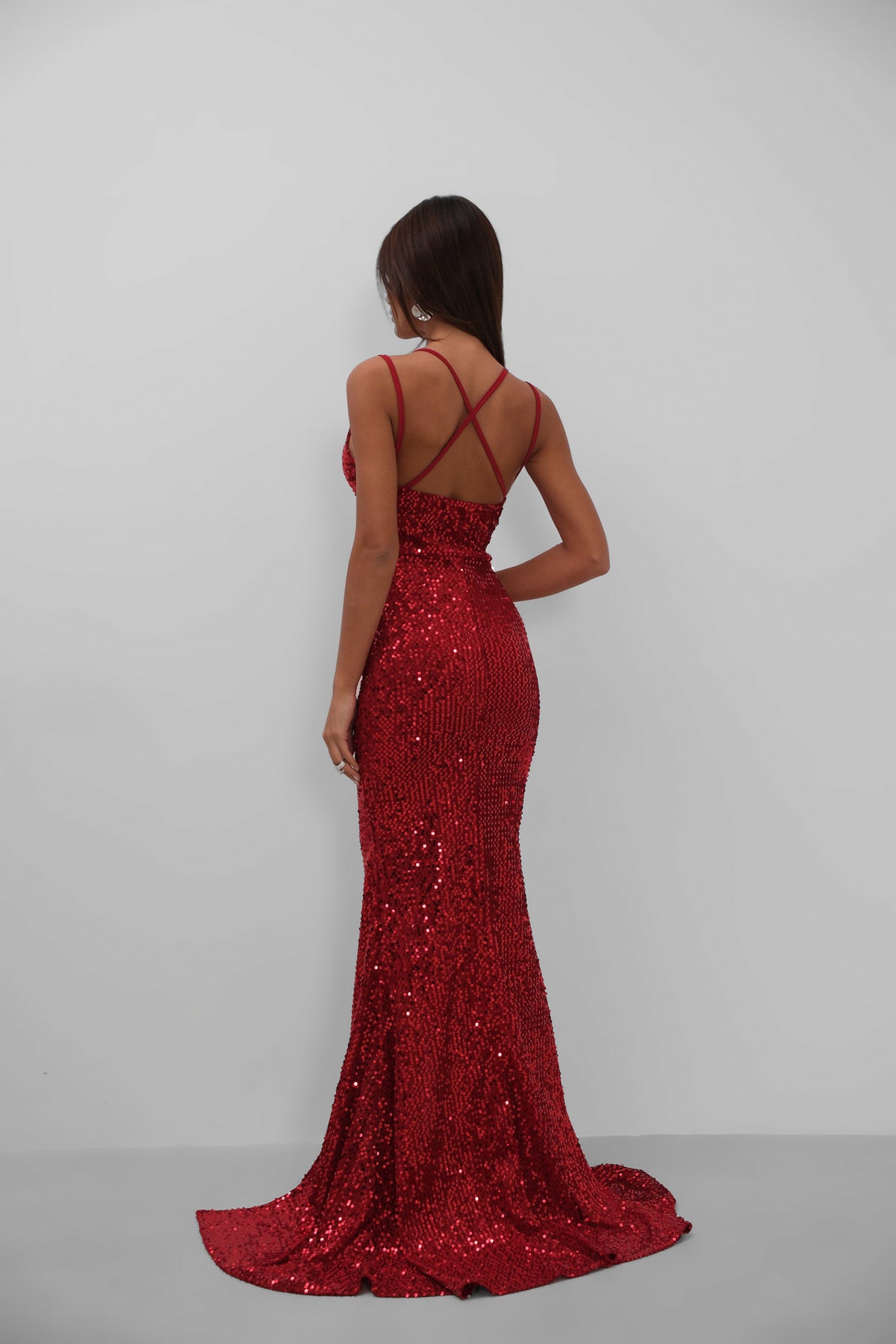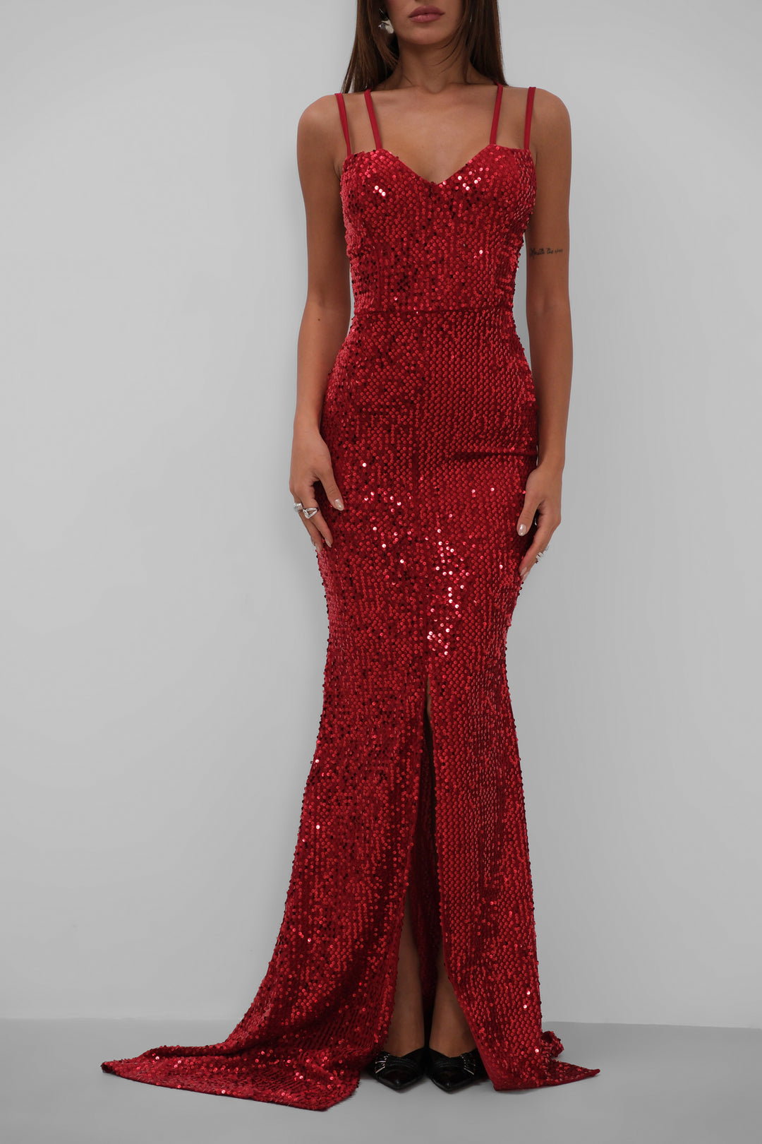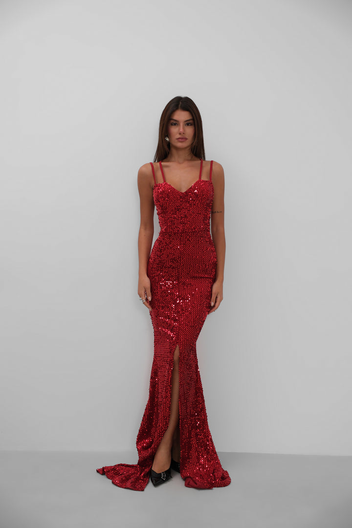 Maxi Boy, Payetli, Pullu, Çift Askılı, Omuzlar Açık, Elbise, Fashion, Etek Yırtmaçlı, Dar Kalıp