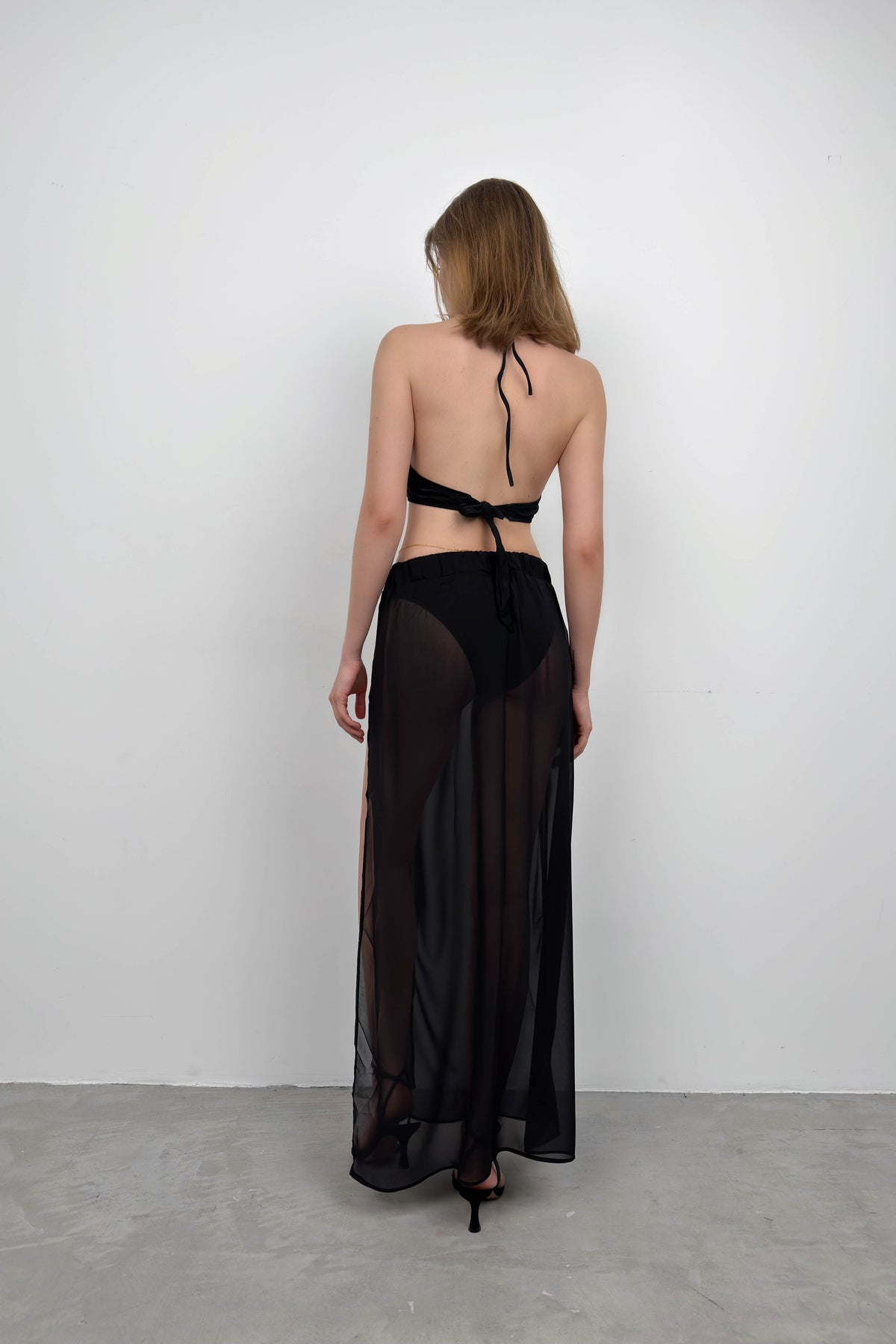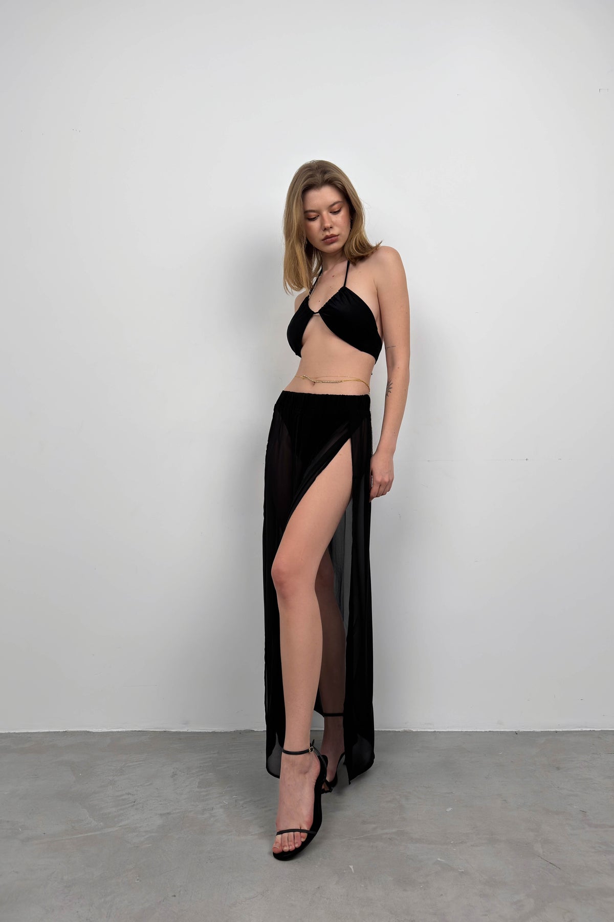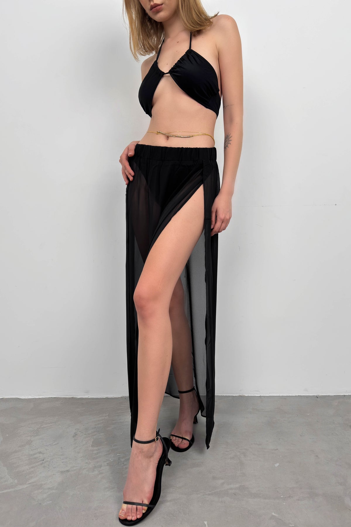 Çift Yırtmaçlı Desenli Siyah Pareo